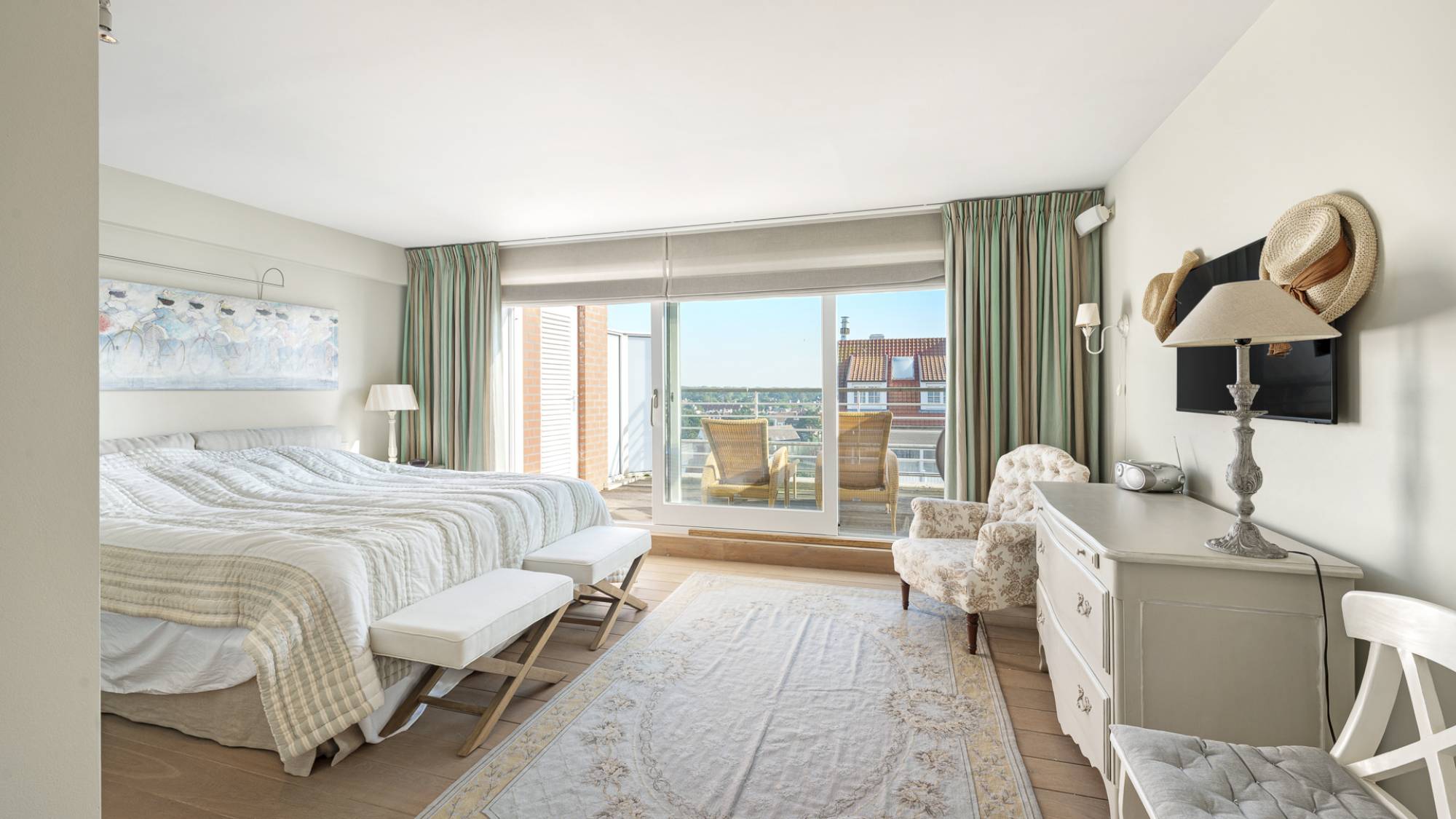 Achteraan bevindt zich de royale master bedroom, compleet met een ruime dressing en toegang tot een groot, zonnig terras met prachtig open uitzicht.