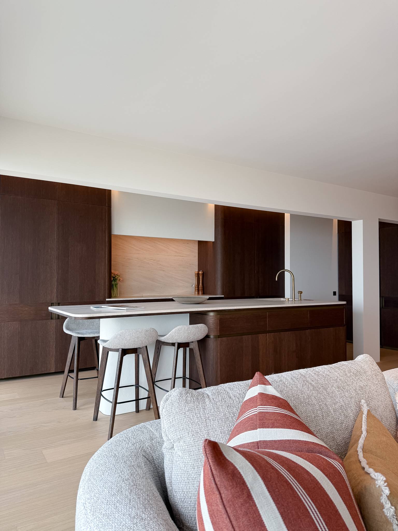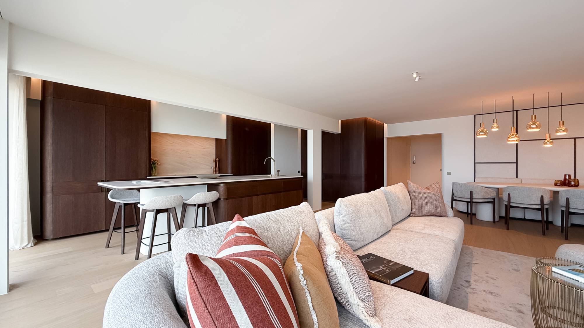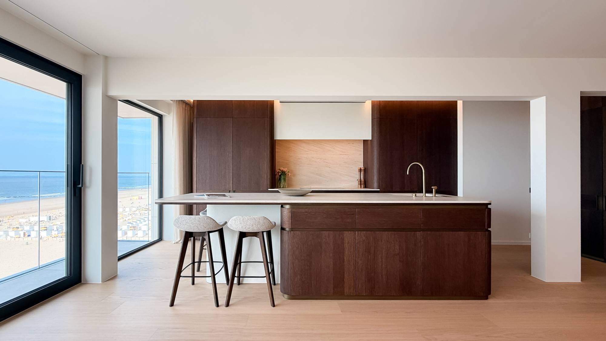 Met een uitzonderlijke gevelbreedte van maar liefst 8 meter biedt de leefruimte een indrukwekkend frontaal zicht op zee – een subliem panorama dat rust, licht en ruimte ademt.