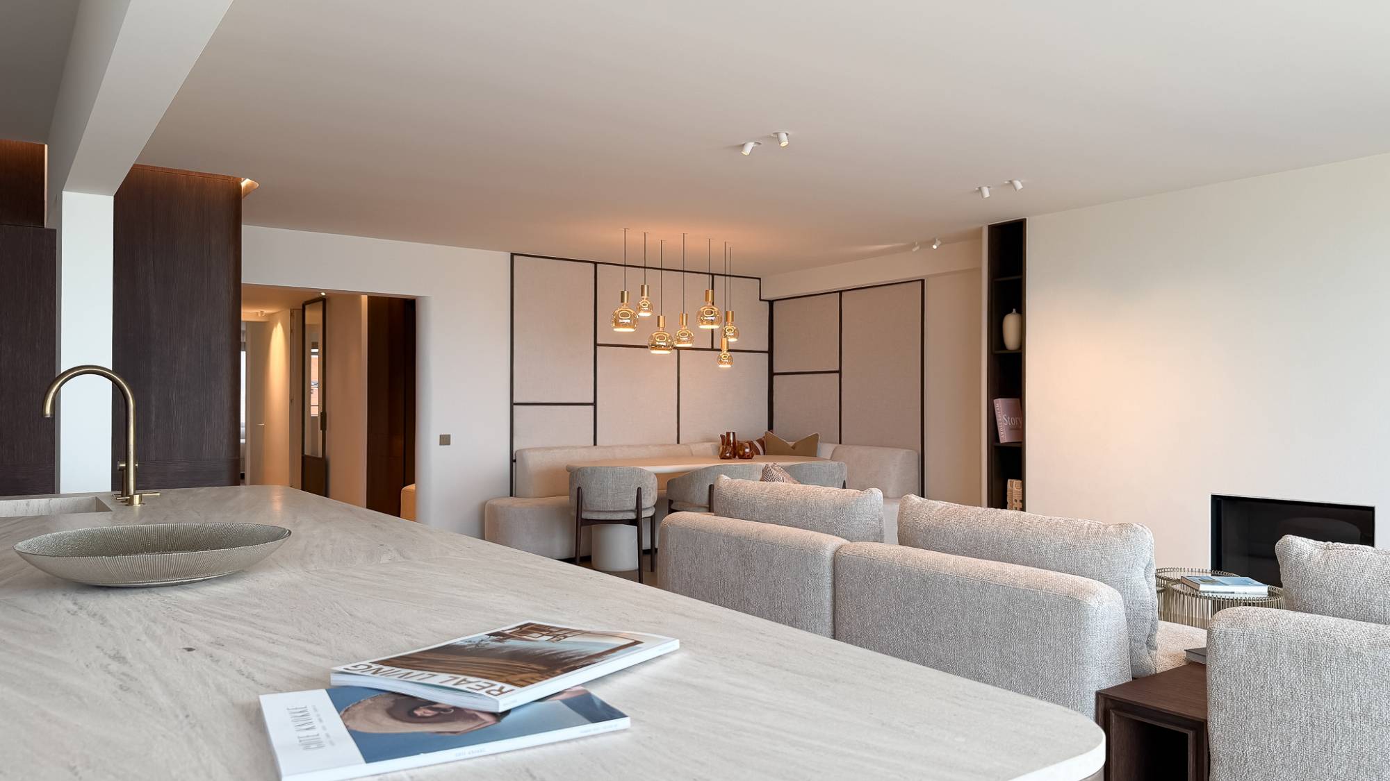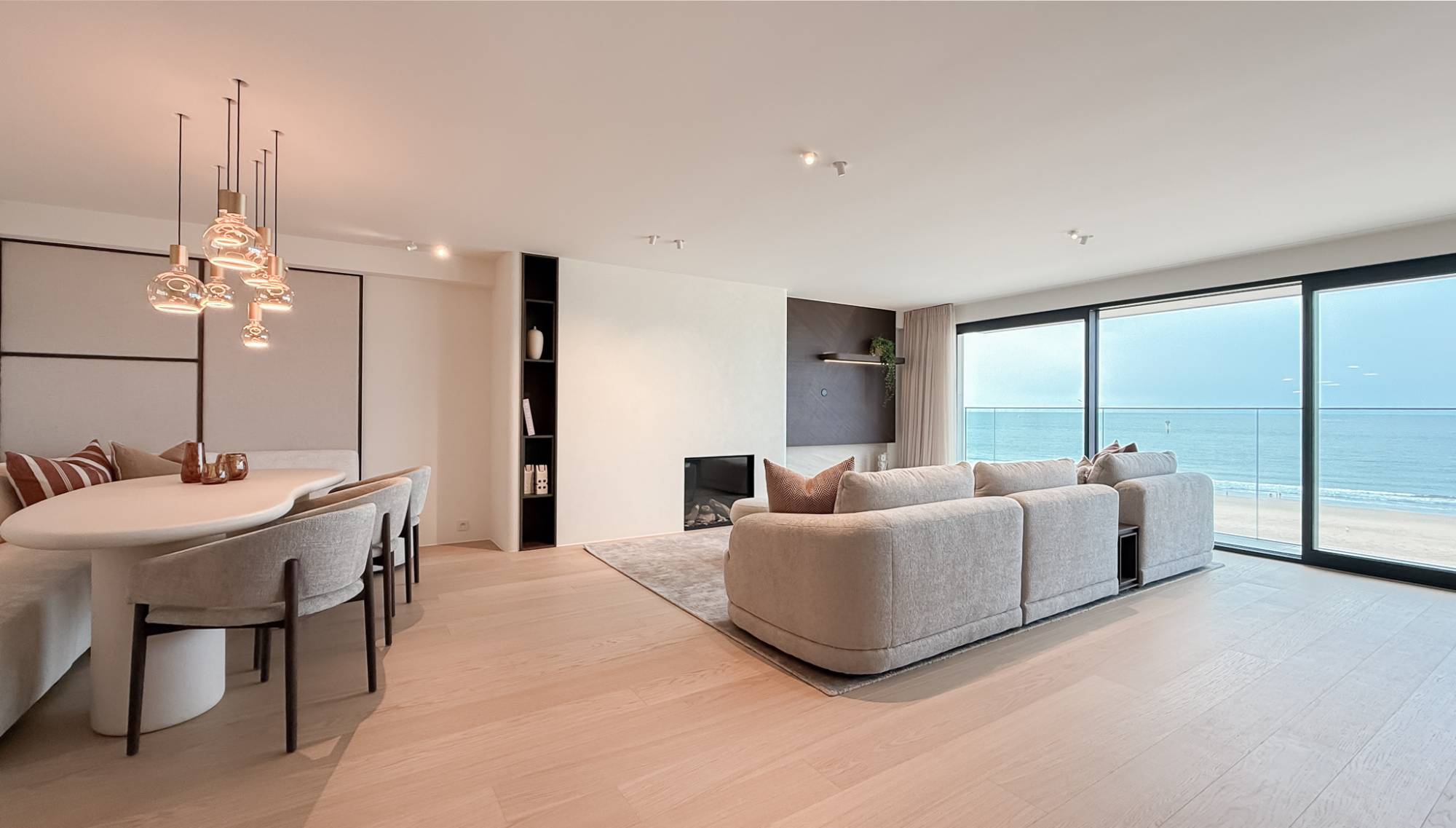 Indeling: een ruime inkomhal met vestiaire en gastentoilet leidt naar de open en lichtrijke leefruimte, waar grote raampartijen een naadloze verbinding creëren met de kustlijn. De open keuken, uitgerust met een stijlvol centraal eiland, vormt het warme hart van deze woonst – perfect voor wie graag ontvangt in een luxueuze setting.