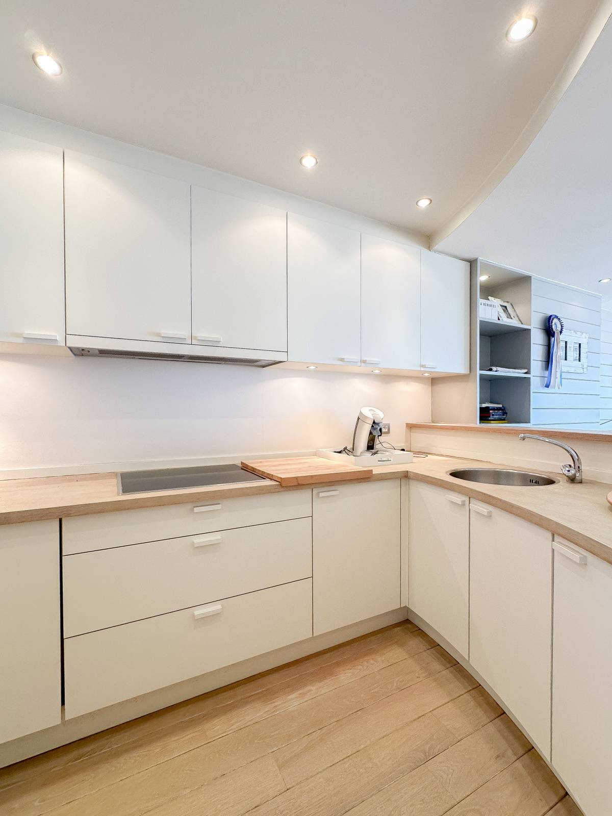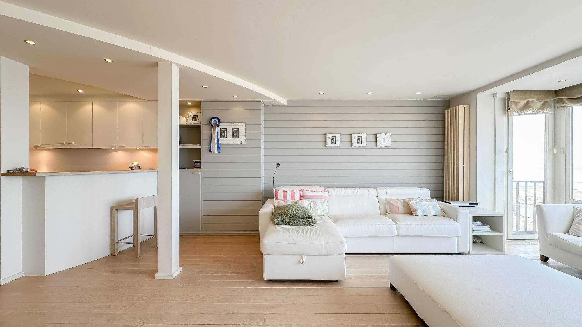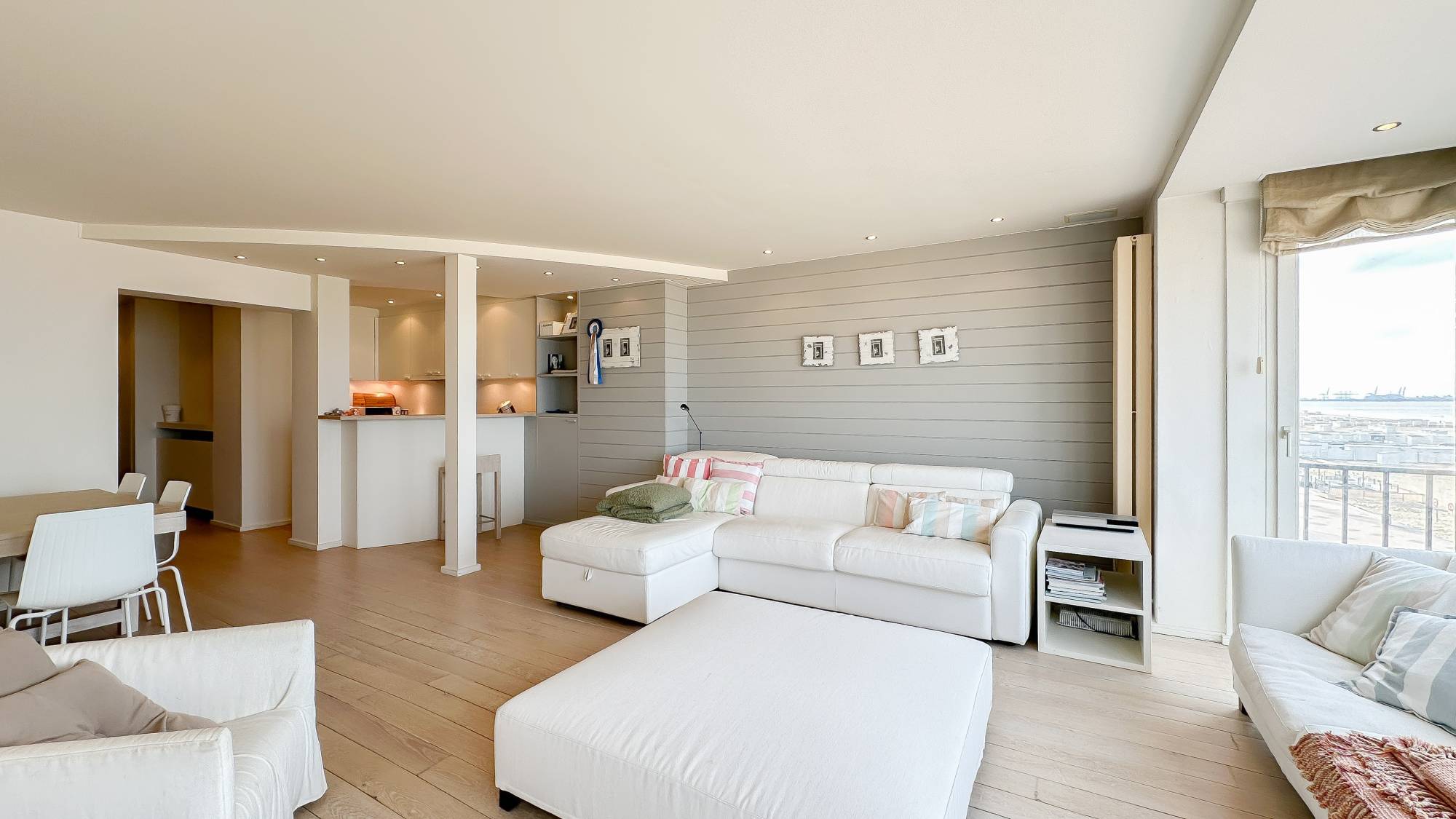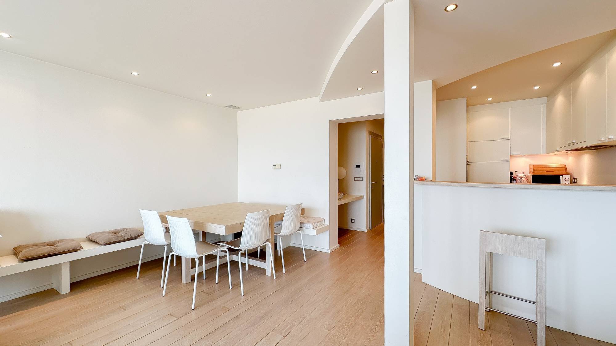 Samenstelling: Inkomhal met gastentoilet en vestiaire. Ruime woonkamer met open zicht op zee. Open keuken met keukeneiland en gezellig ontbijthoekje. Eetkamer. Berging voor wasmachine en droogkast.