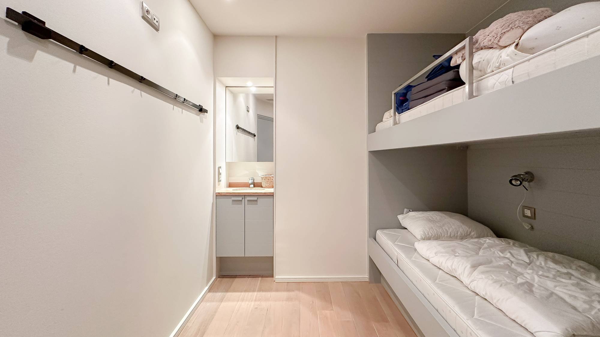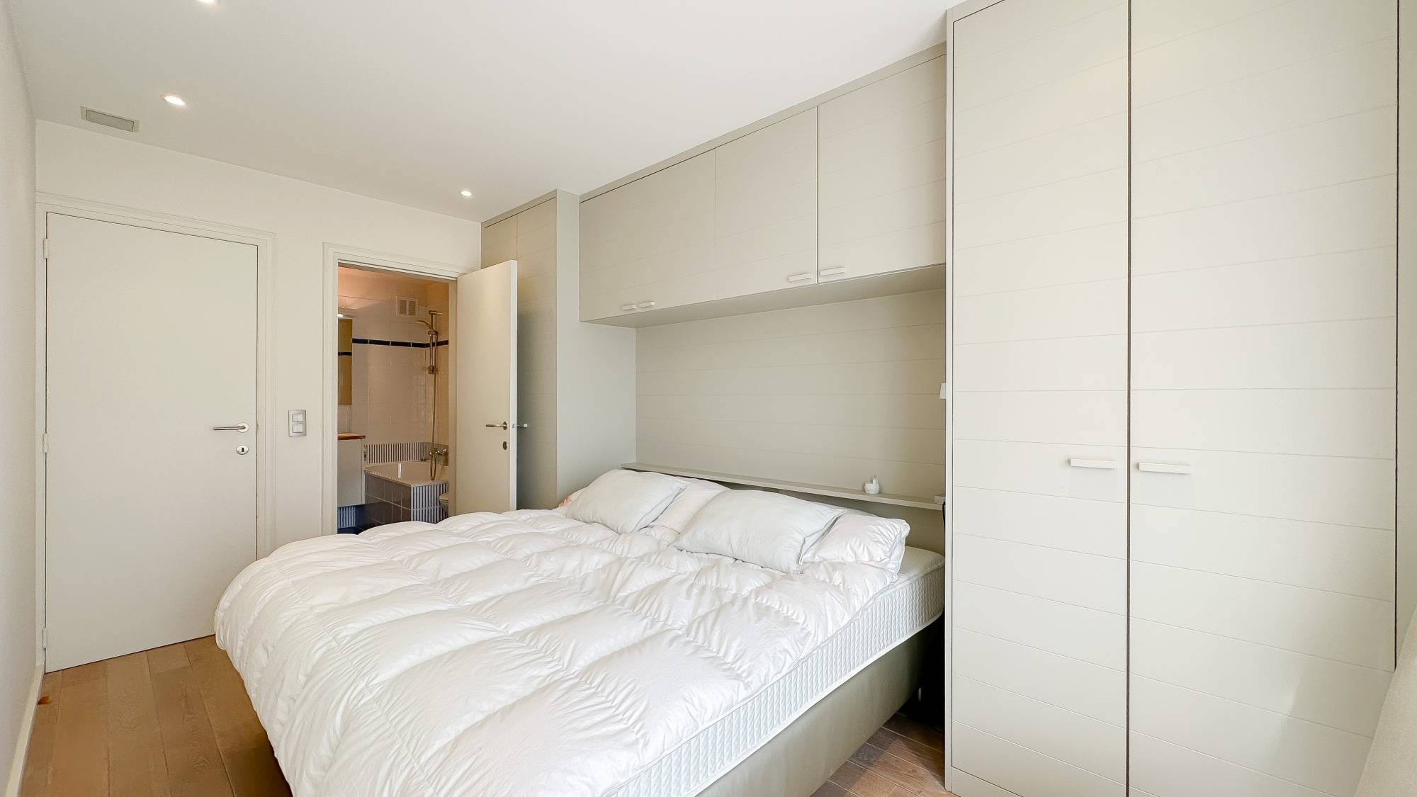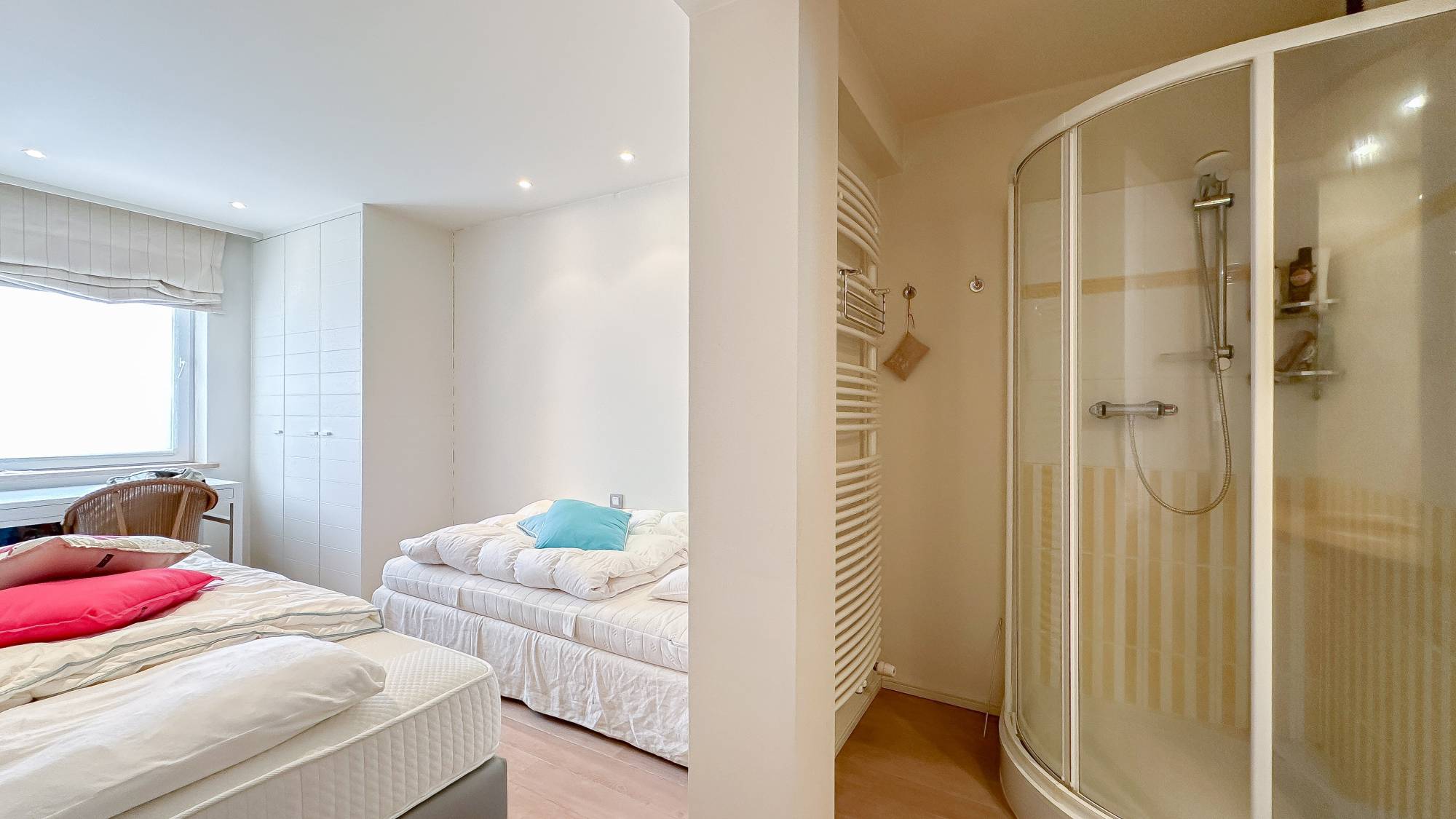 Er zijn 3 slaapkamers. 2 Slaapkamers geven uit op een zonnig terras aan de achterzijde. De hoofdslaapkamer beschikt over een badkamer. De 2e slaapkamer beschikt over een eigen douchekamer en een bureauhoekje. 3e slaapkamer waar momenteel een stapelbed is en een lavabomeubel.