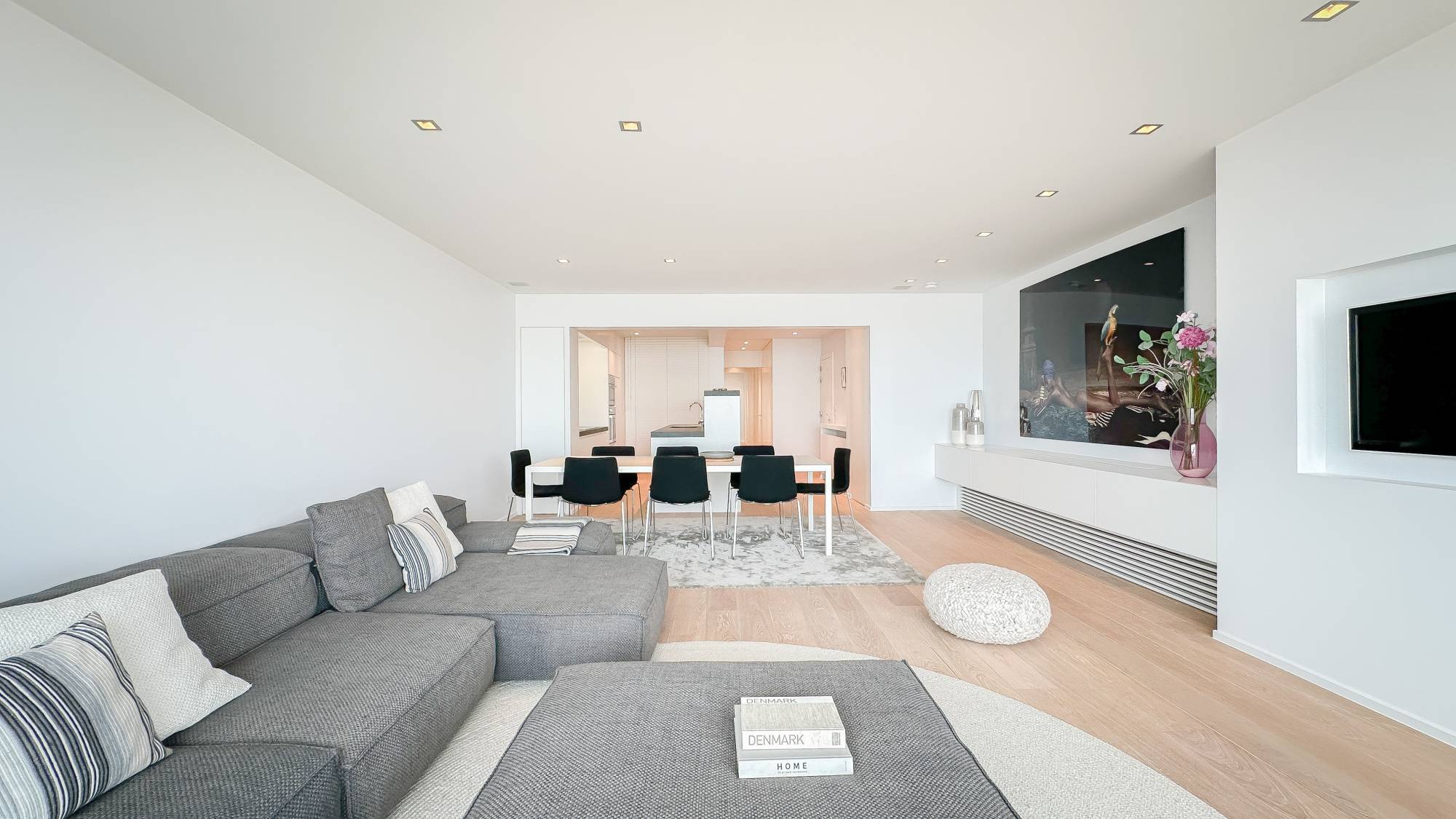 Samenstelling: Inkomhal met gastentoilet en vestiaire. Ruime woonkamer met grote raampartijen, uitgevend op een terras over de volledige breedte van het appartement en genietend van een prachtig FRONTAAL ZEEZICHT.