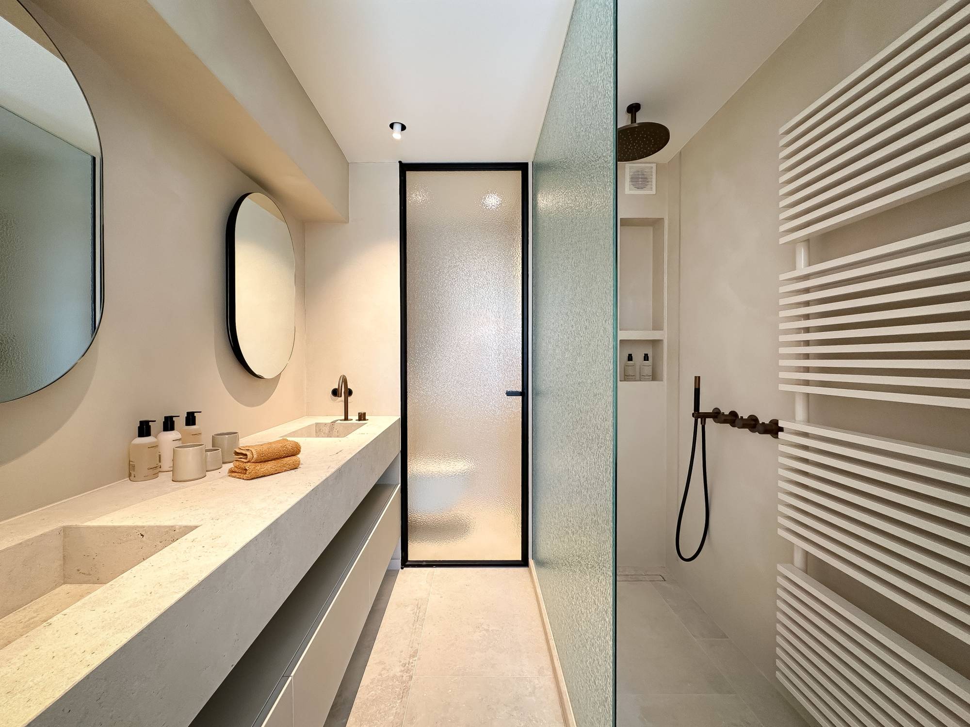 Indeling: De ruime inkomhal met gastentoilet en vestiaire leidt naar de open, moderne keuken met een gezellige ontbijthoek, die aansluit op de stijlvolle eetkamer. De lichte en sfeervolle woonkamer bevindt zich naast de eetruimte. Hier vind je ook de eerste volwaardige slaapkamer, voorzien van ingemaakte kasten en een ensuite badkamer.