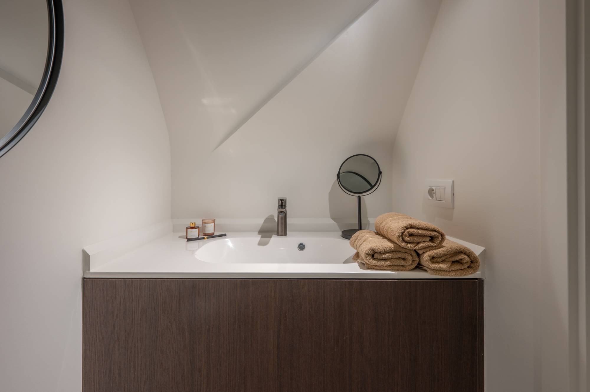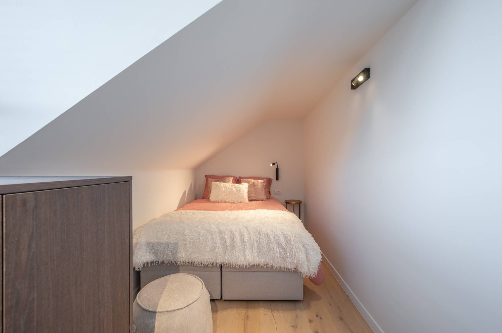 Het appartement beschikt over drie slaapkamers, een badkamer en een aparte douchekamer. Daarnaast zijn er twee privatieve kelderbergingen aanwezig. In de residentie is ook een gemeenschappelijke fietsenberging voorzien.