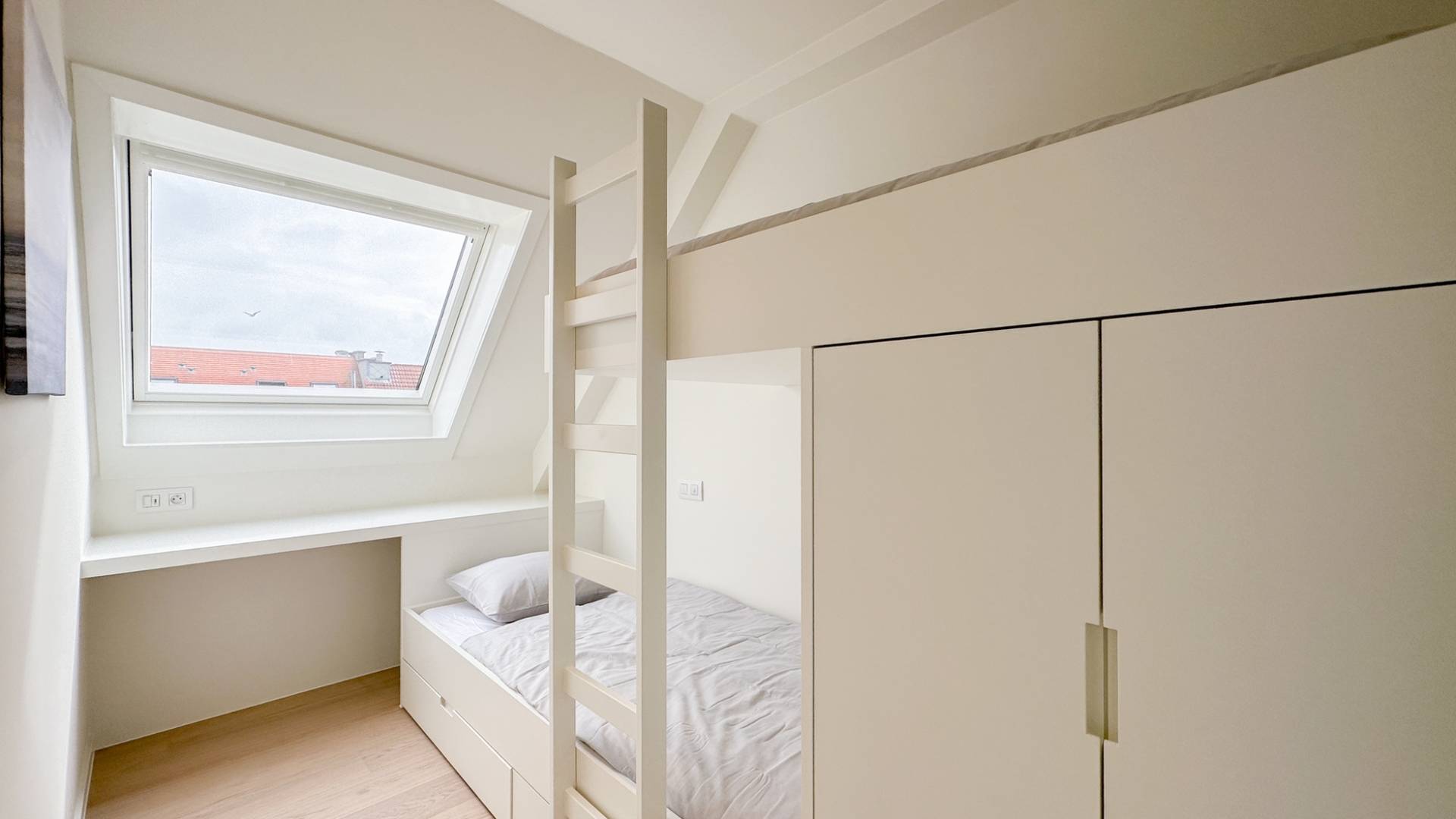 Indeling: Inkom met gastentoilet. Keuken voorzien van alle moderne comfort en een eiland met ontbijthoek. Toegang tot het terras achteraan geschikt voor een ontbijt in het zonnetje. Een eerste kinderkamer aan de achterzijde met bureel. Aan de voorzijde van het appartement de eet- en woonkamer met toegang tot het WESTGERICHTE TERRAS. Bureauhoek.
