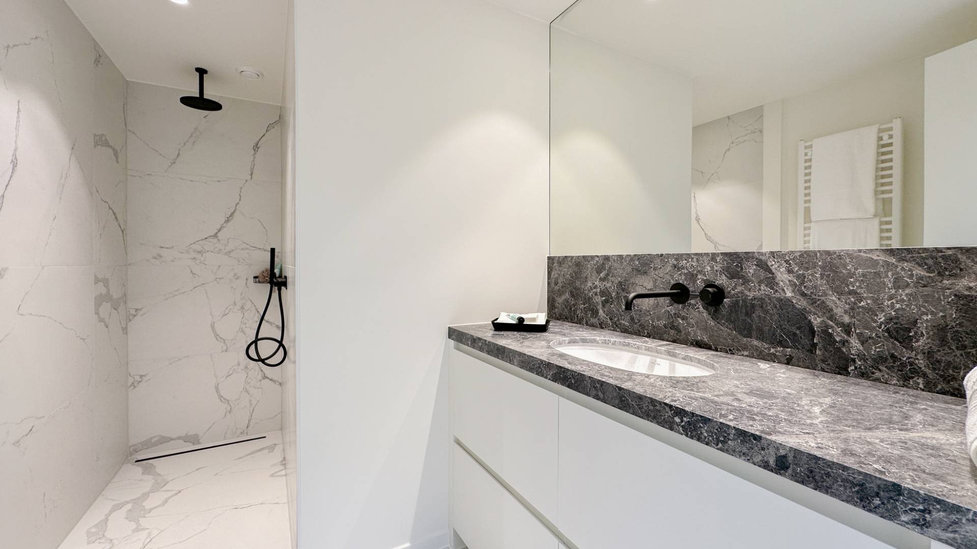 Op het bovenste niveau bevinden zich 3 slaapkamers met ingemaakte kasten waarvan een met een ensuite douchekamer met toilet. Twee van de drie slaapkamers op dit niveau zijn geschikt voor een dubbel bed en er is een bijkomende, aparte douchekamer met toilet.