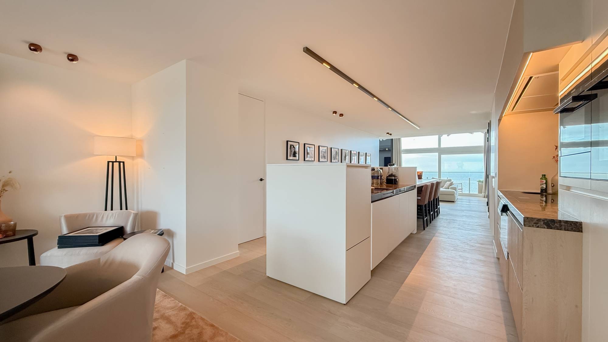 Deze unieke eigendom staat voor pure verfijning en maximaal wooncomfort. De leefruimte met gashaard vormt het warme hart van het appartement, waar het uitzicht op zee centraal staat. De aangrenzende eetruimte en op maat ontworpen keuken creëren een harmonieuze flow die uitnodigt tot ontspannen en genieten. Een elegante inkomhal met vestiaire en gastentoilet zorgt voor een stijlvolle ontvangst, terwijl een praktische berging extra comfort biedt.