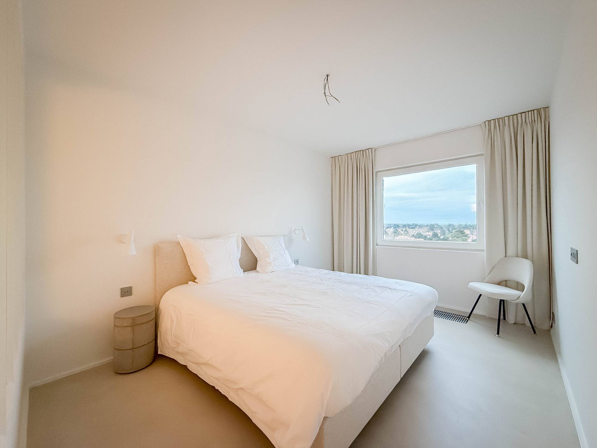 Indeling: Inkomhal met gastentoilet en vestiaire. Zonovergoten, lichte woonkamer op de hoek, met zowel een zuid- als zuidwestelijk georiënteerd terras als een prachtig zeezicht. De vloeren in het hele appartement zijn afgewerkt met beton ciré, wat een enorm ruimtelijk gevoel creëert. Eethoek. Open keuken, volledig geïnstalleerd met Miele huishoudtoestellen en een geïntegreerde wijnkoelkast.