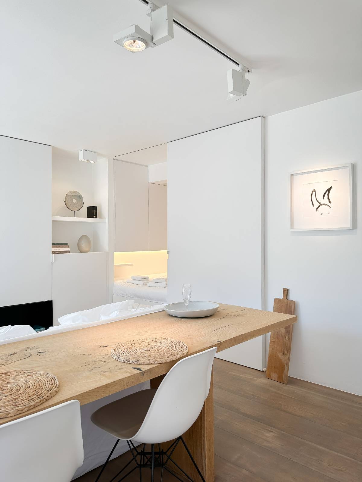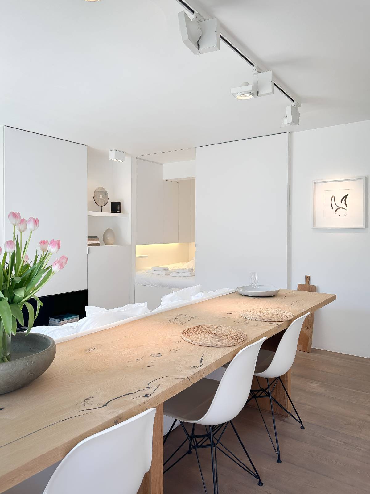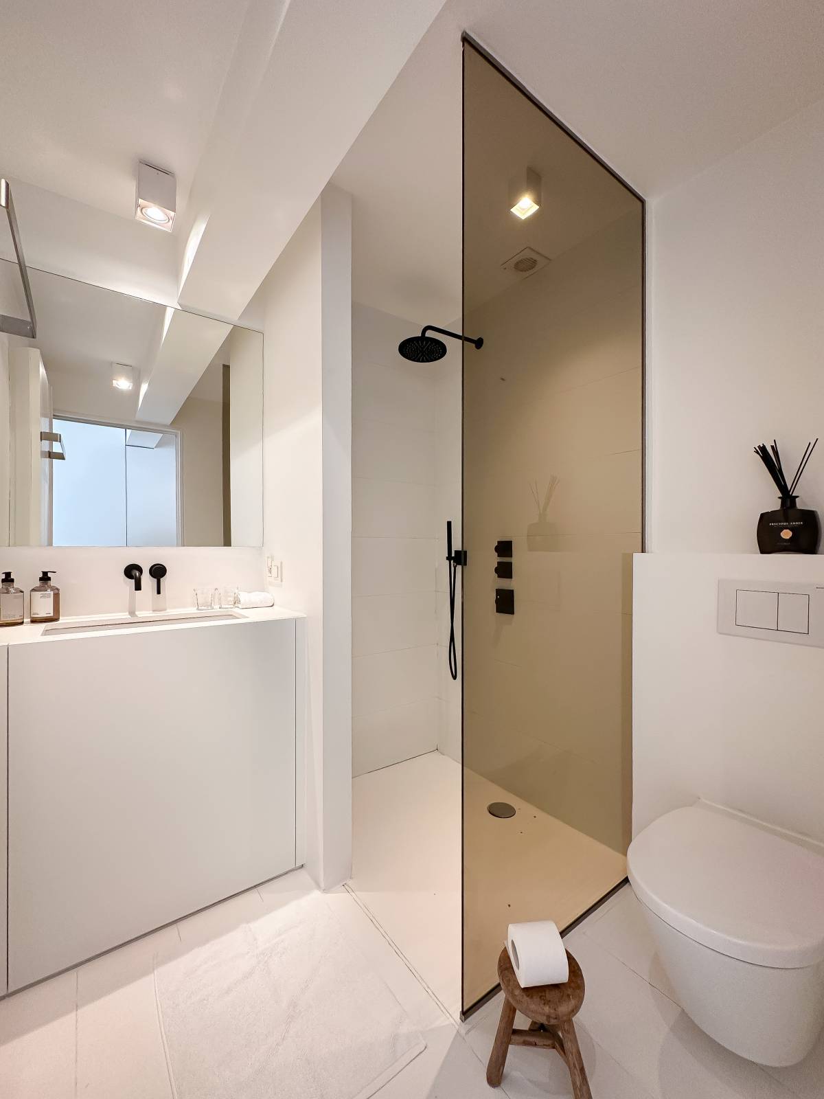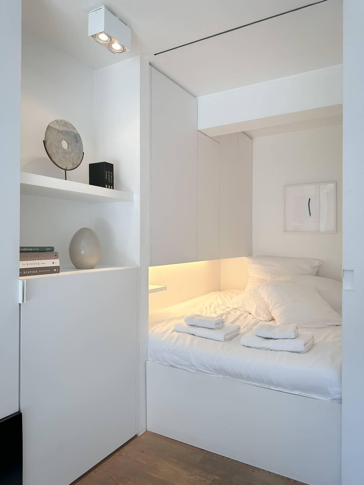 Aparte slaaphoek (dubbel bed) die omwille van zijn eenvoud, harmonieus deel uitmaakt van de woonruimte. De slaaphoek kan tevens afgesloten worden d.m.v. een shuifwand. Luxueuze douchekamer met inloopdouche, lavabo en toilet.