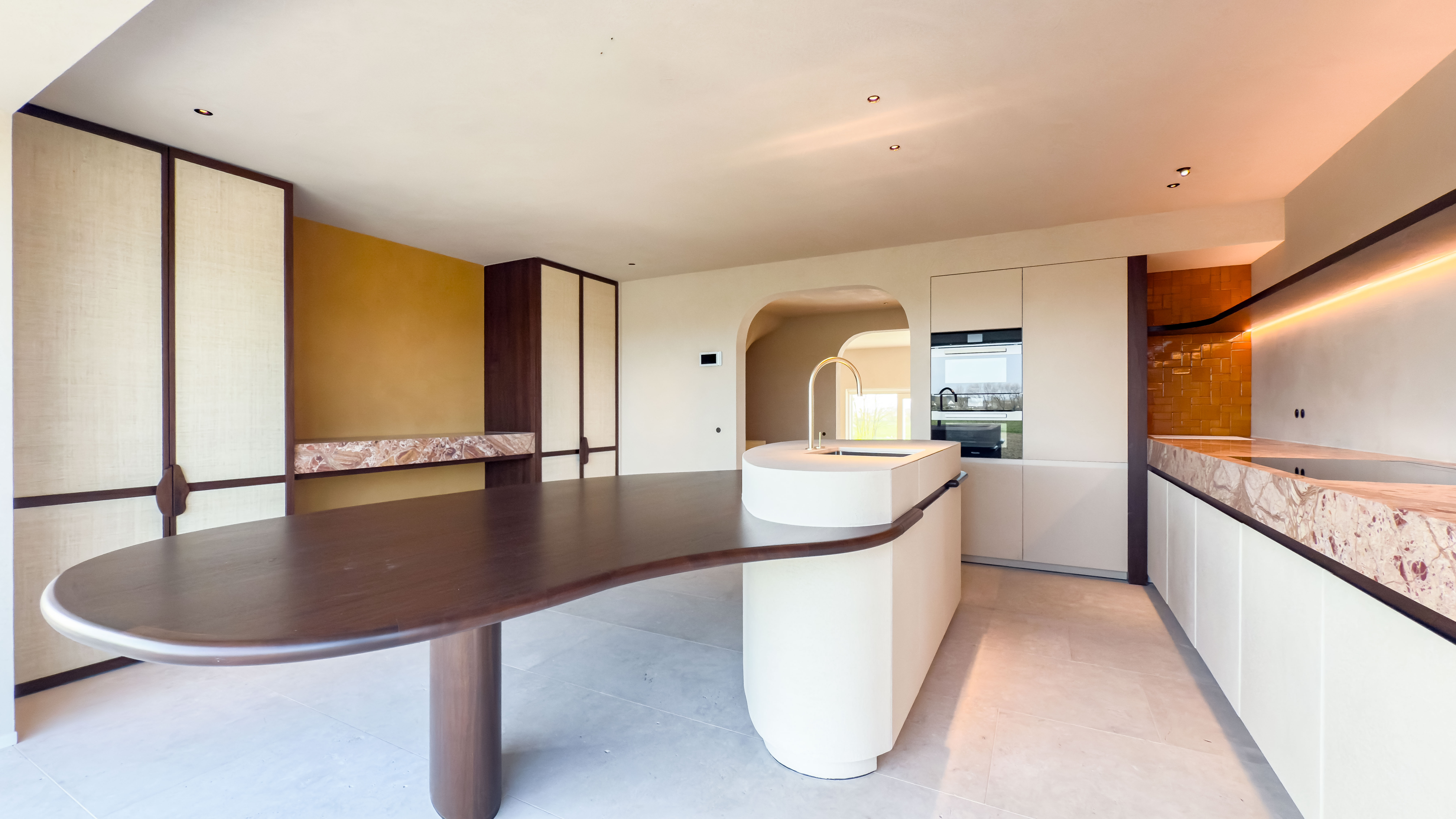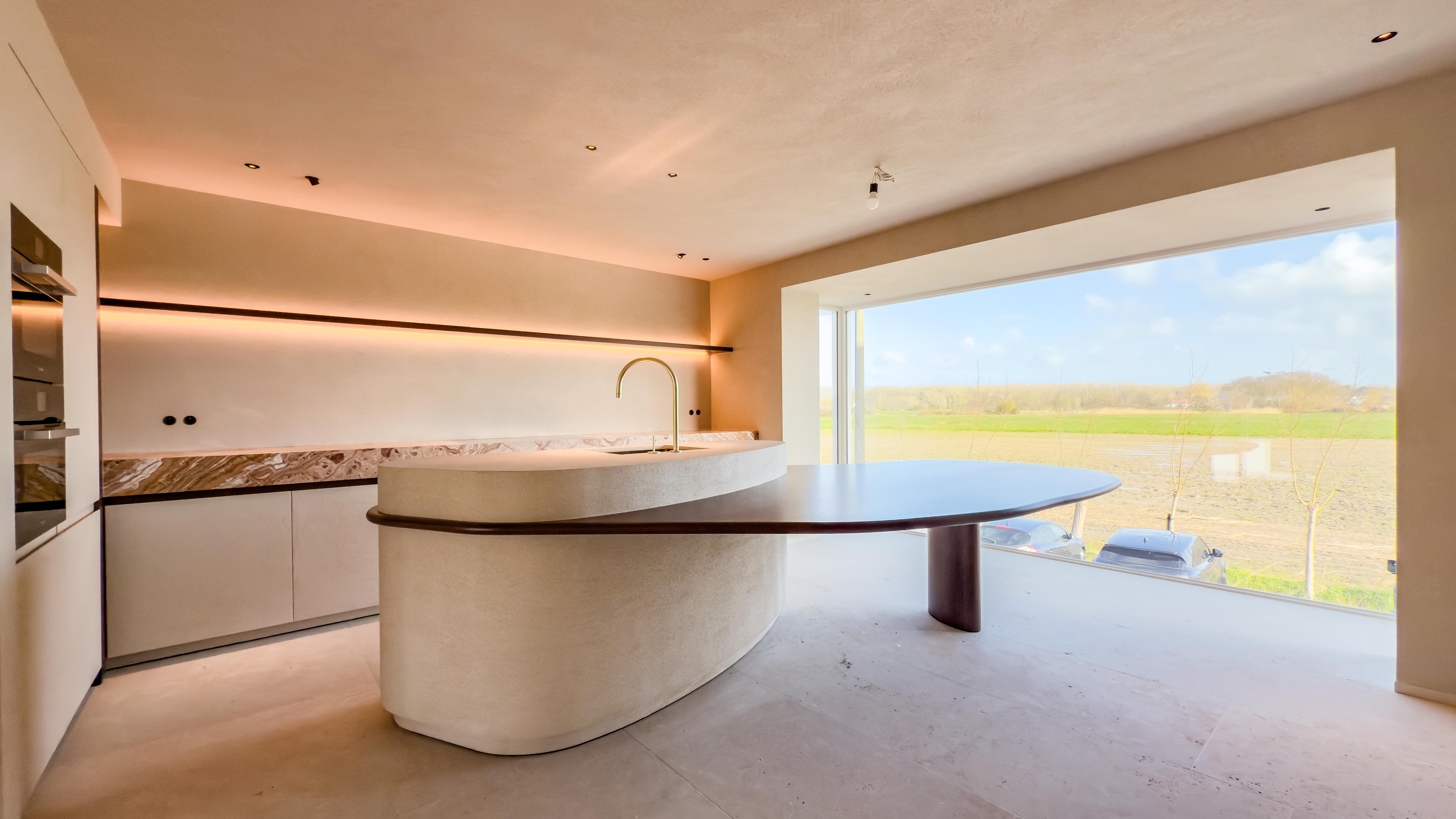 De leefverdieping vormt het kloppend hart van de woning. De woonkamer, gekenmerkt door haar hoge plafonds en open haard, baadt in het licht en opent zich naar een zonnig terras met een adembenemend zicht over de polders. De open keuken, uitgerust met hoogwaardige Miele-toestellen en een elegant keukeneiland met geïntegreerde eettafel, nodigt uit tot verfijnd wonen en ontvangen, met het landschap als permanent decor.