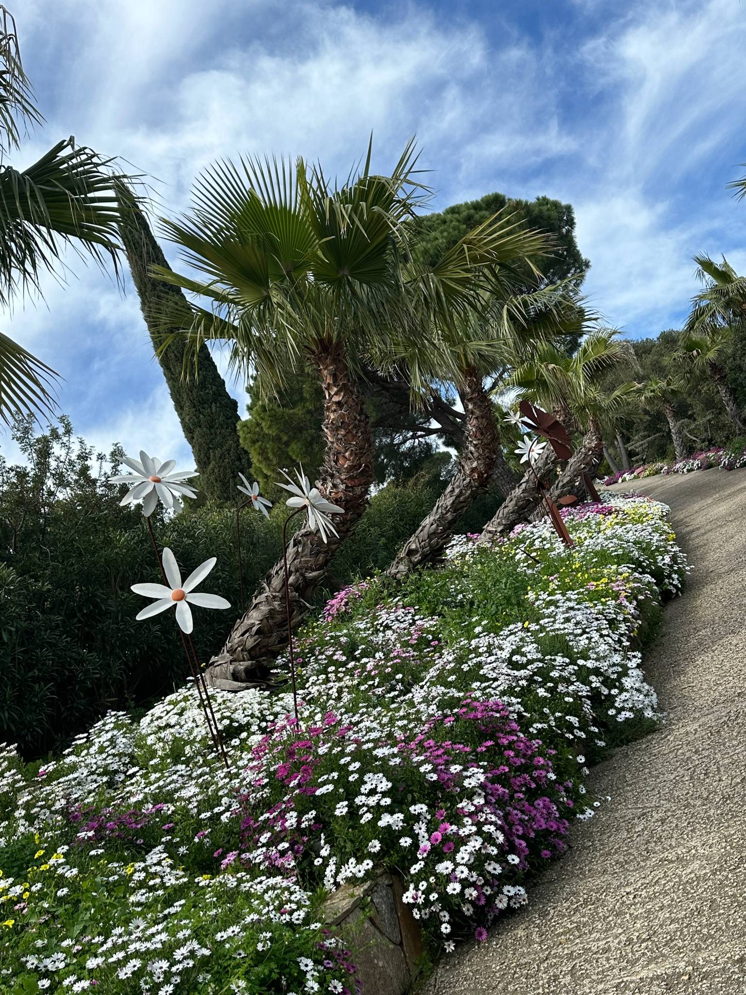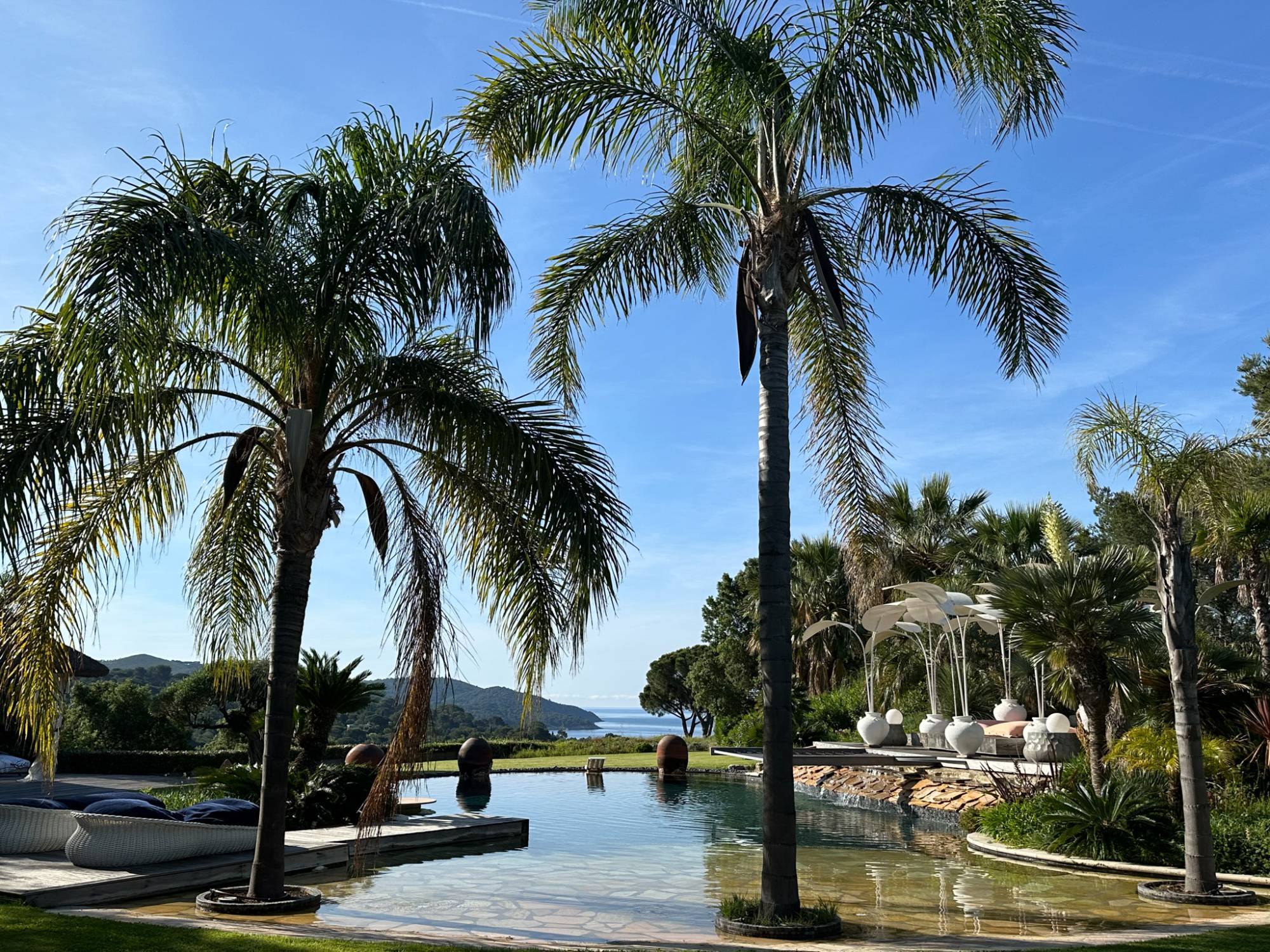 De uitgestrekte tuin, versierd met prachtige palmbomen, paradijsvogels, olijfbomen en andere mediterrane planten, beschikt over twee zwembaden, waarvan één verwarmd met een tegenstroomsysteem. De buitenruimte wordt verder verfraaid met een lounge in Polynesische stijl, een fitnessruimte en een prachtig patio om het milde klimaat van de regio te genieten.