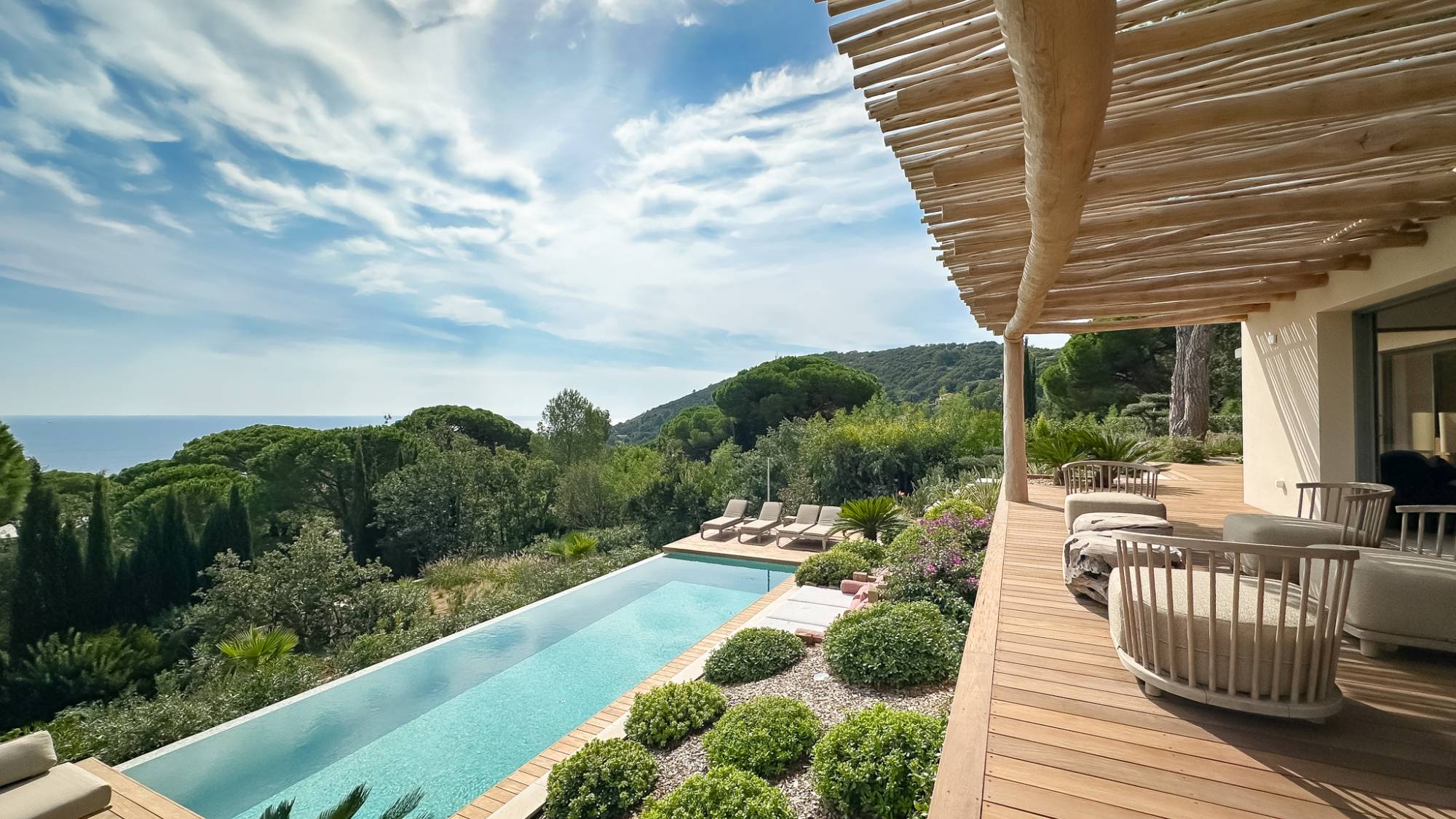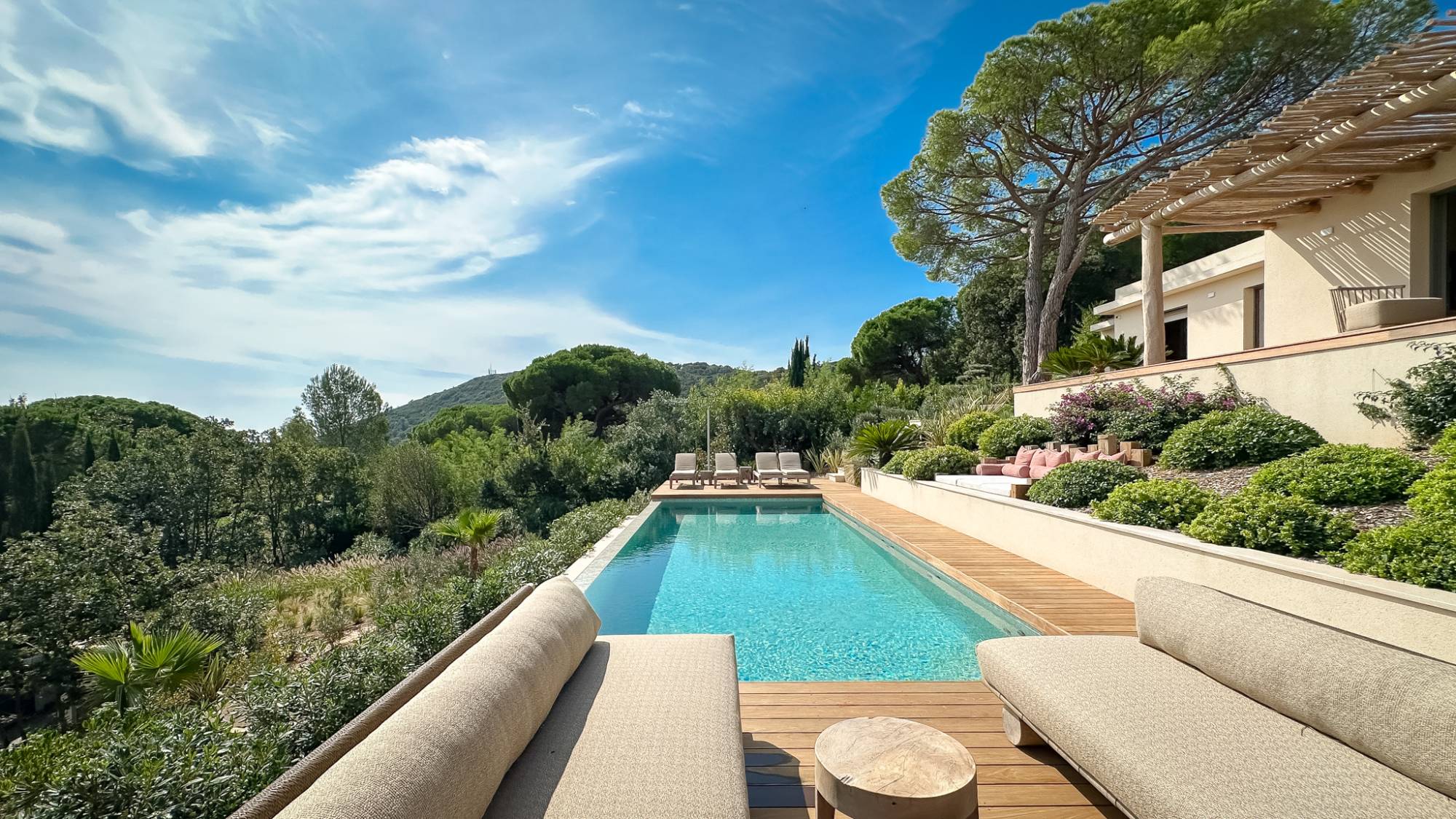 Het verwarmde, zoutbehandelde infinity zwembad, het poolhouse en de aangrenzende terrassen van exotisch hout en natuursteen passen perfect in het pand en het aangelegde park met mediterrane planten. Een jeu-de-boulesbaan is ook aanwezig in de tuin.