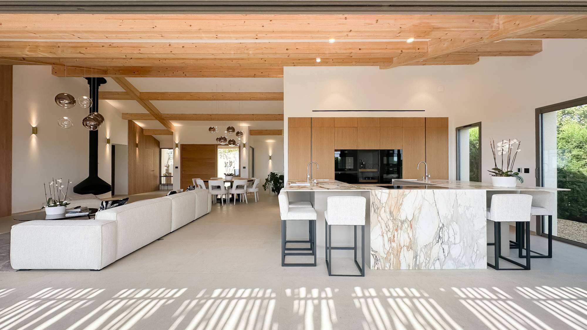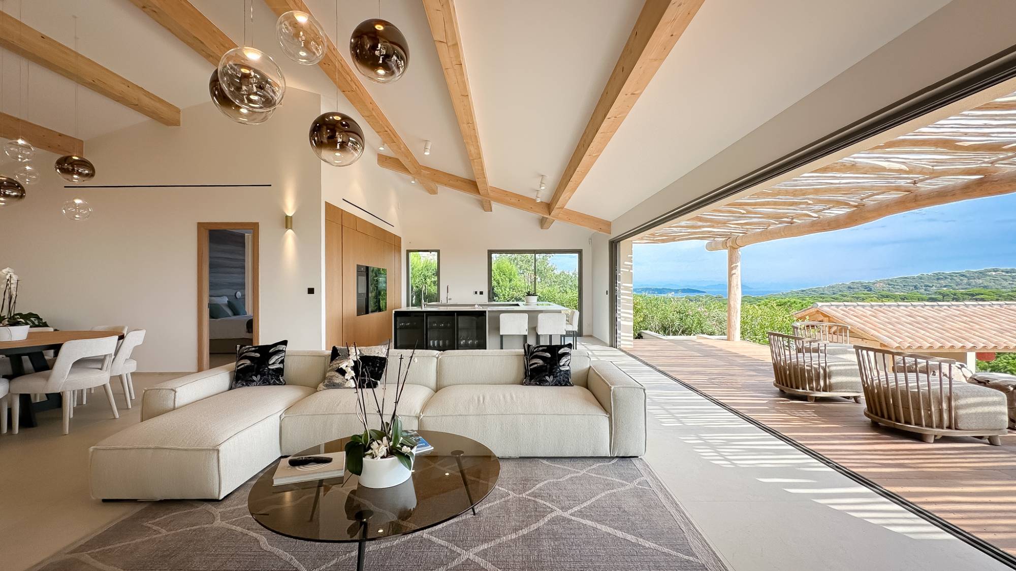 De zeer grote woonkamer, met een prachtig volume onder de dakstructuur en een panoramisch schuifraam, strekt zich uit naar het terras met uitzicht op het park en het dak van parasolden, en biedt een prachtig dubbel zeezicht. De luxe keuken met een eiland of de hangende open haard integreert perfect in deze ruimte.