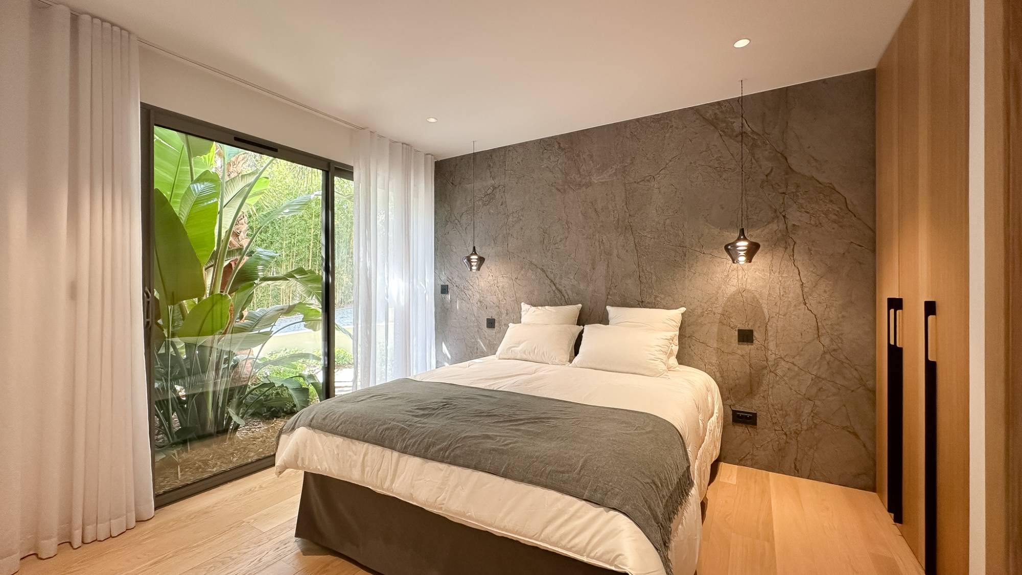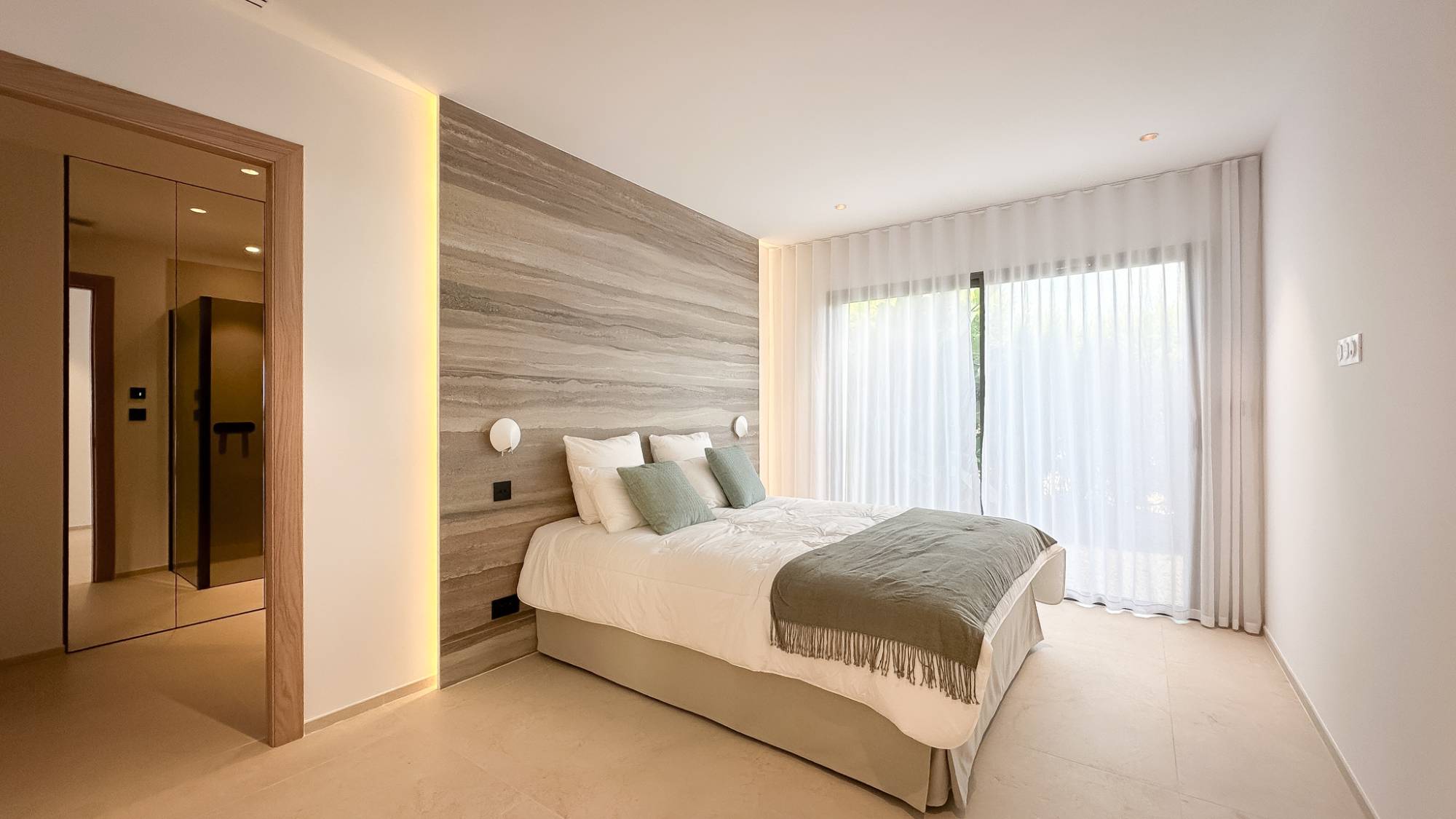 Aan de nachtkant biedt de villa 4 slaapkamers en suite, elk met een eigen badkamer uitgerust met luxe hangend Corian meubilair, natuurlijke eiken fronten en verzonken messing fittingen. Aparte toiletten voor elke suite.