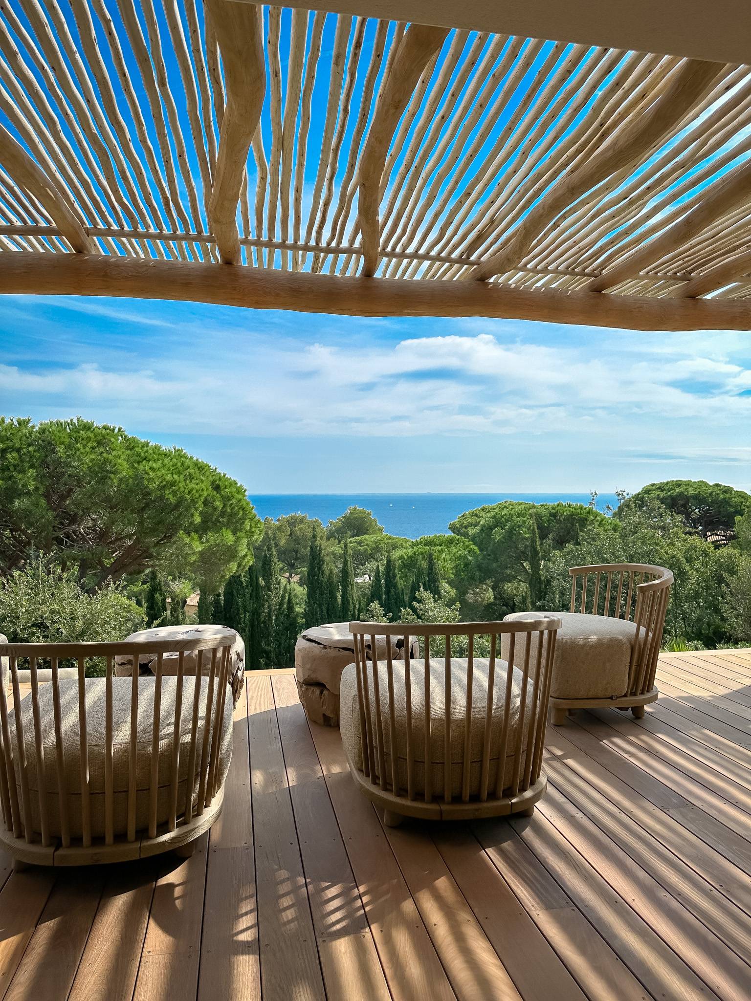 Deze villa is een waar voorrecht en zal gegarandeerd uw hart stelen. Het biedt een prachtig dubbel zeezicht: enerzijds met uitzicht op de baai van Saint-Tropez, omlijst door een dak van parasolden en bergen op de achtergrond, en anderzijds op het strand van l’Escalet.