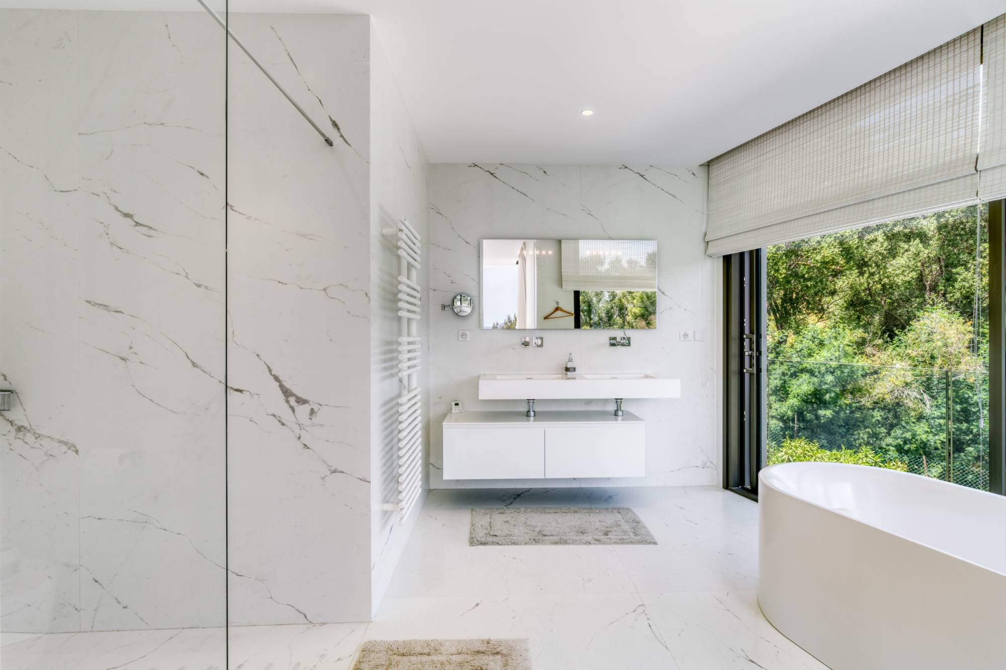 Het interieur, doordrenkt met natuurlijk licht dankzij de grote raampartijen, beslaat drie niveaus en biedt hoogwaardige afwerkingen. De hoofdverdieping, volledig gericht op de zee, onthult een spectaculair panoramisch uitzicht van 180 graden. Het bevat een royale woonkamer met open haard, een volledig uitgeruste keuken, een eetkamer, een bijkeuken en een luxe master suite met een inloopkast en een elegante badkamer. Vanuit elke ruimte is er directe toegang tot een groot terras, waar de eindeloze blauwe zee deel uitmaakt van het decor.