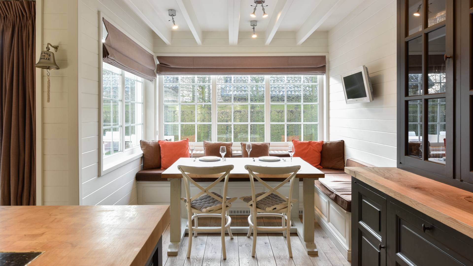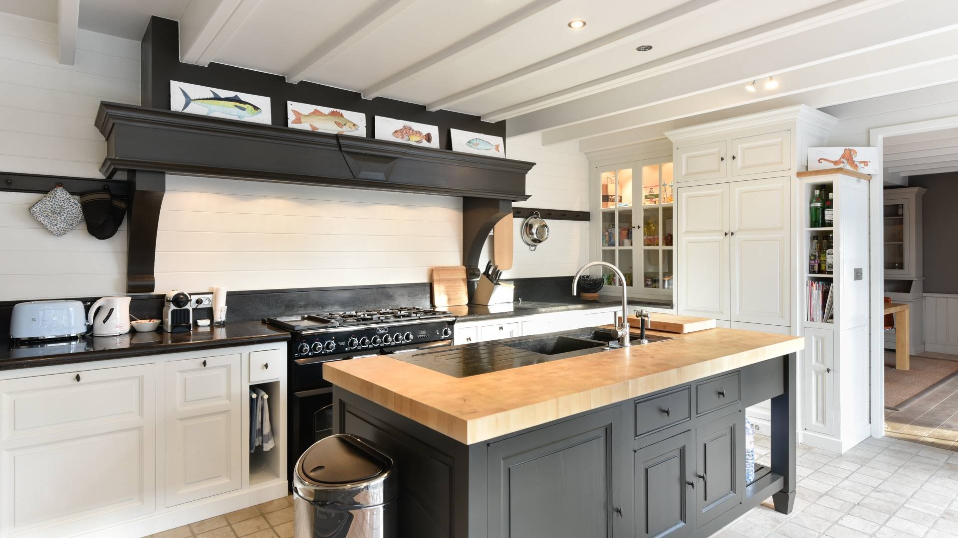 Afzonderlijke keuken met keukeneiland en "Falcon" fornuis. Knusse ontbijthoek. Op de gelijkvloerse verdieping bevindt er zich eveneens een afzonderlijke bureelruimte.