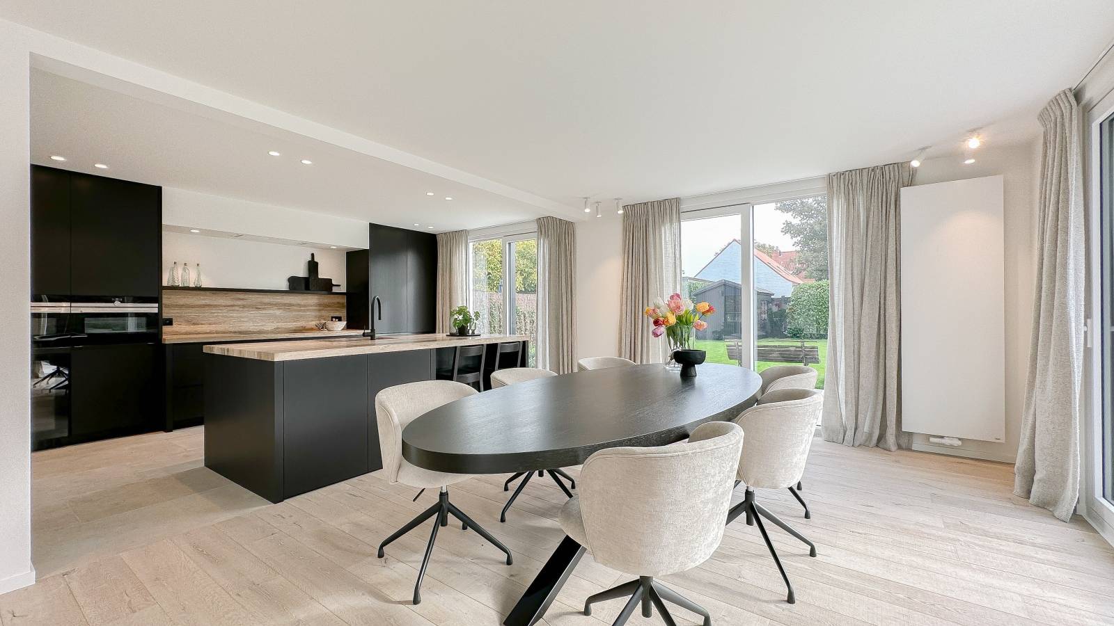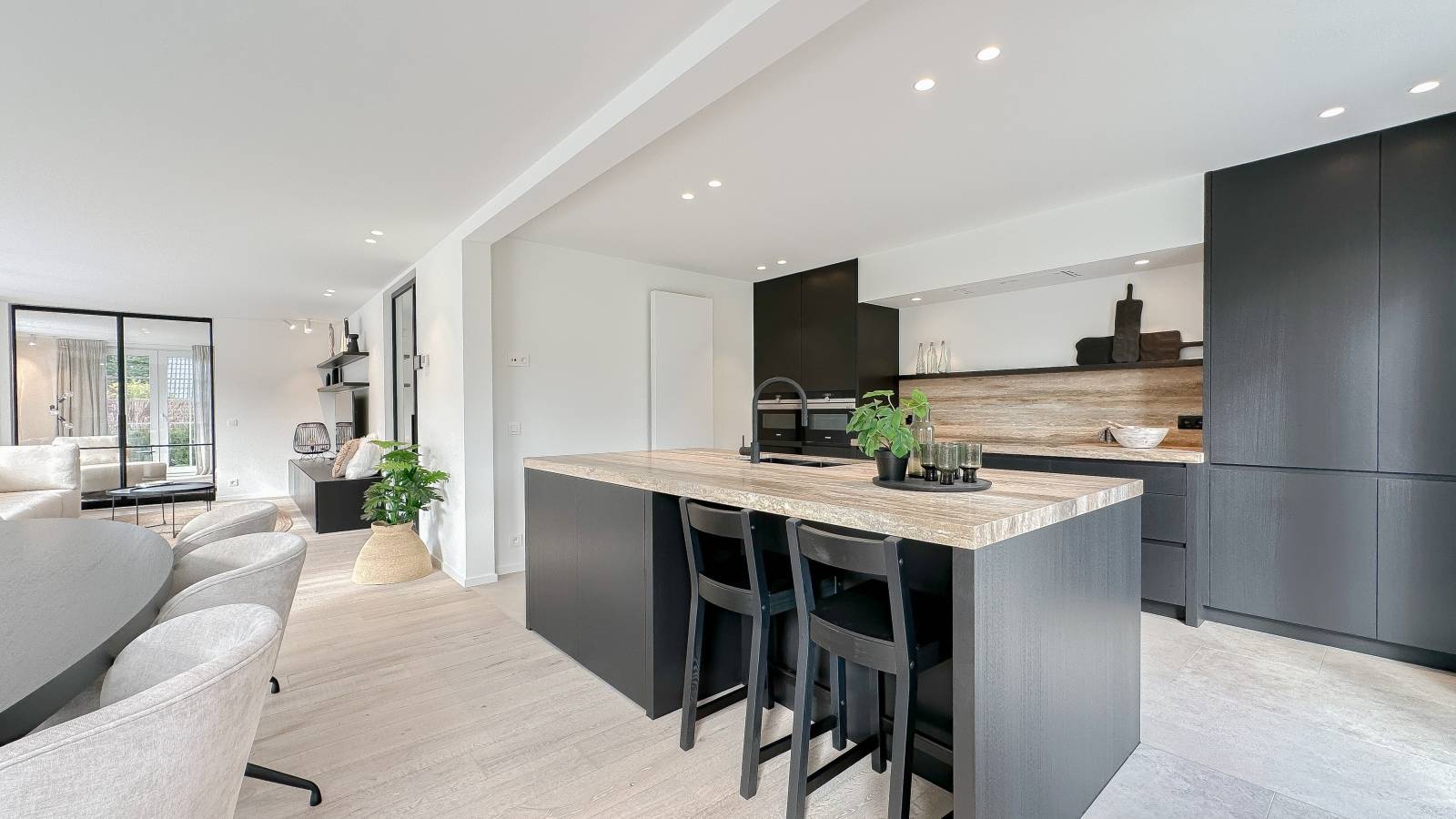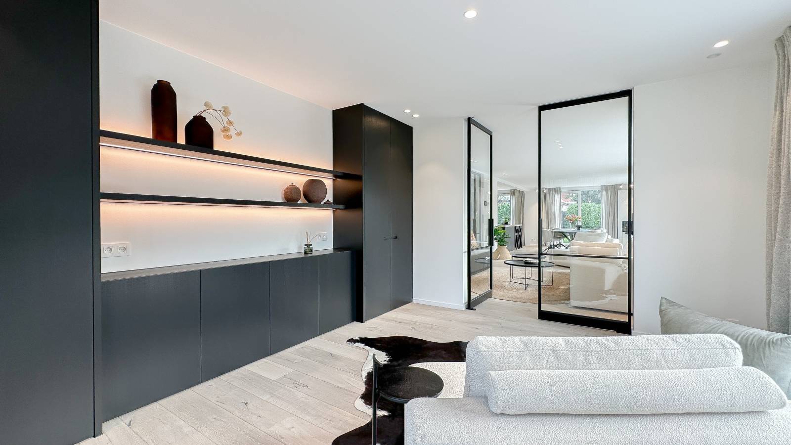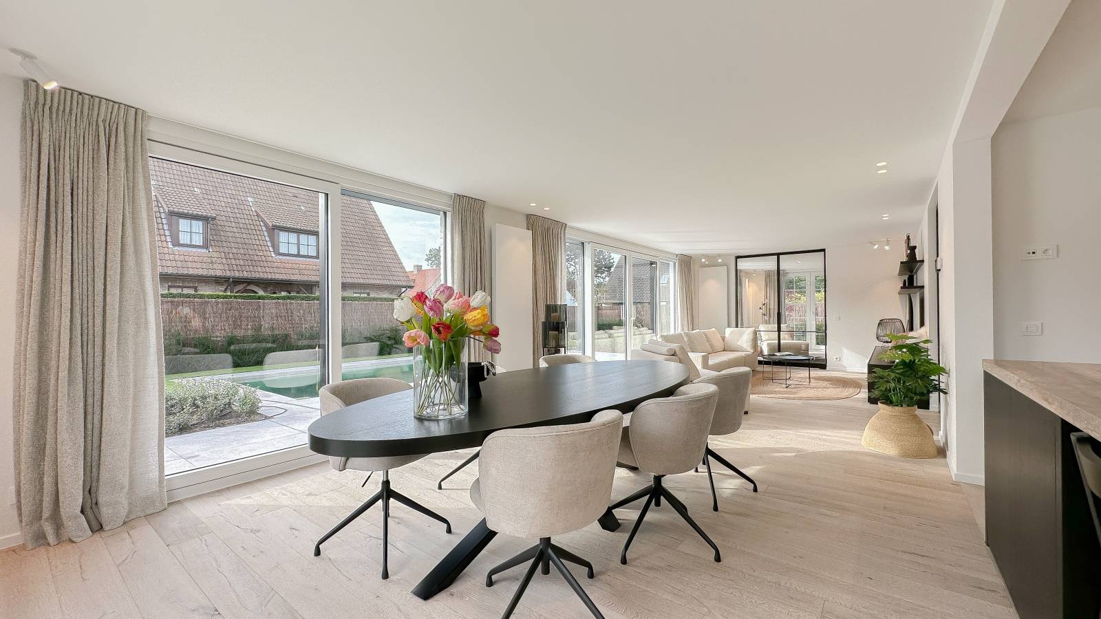 Indeling: Bij binnenkomst betreedt u een ruime inkomhal met gastentoilet en vestiaire. De lichtrijke woonkamer, omringd door grote raampartijen, baadt in het zonlicht en geeft uit op een aangenaam zuidgericht terras met een verwarmd zwembad. De eetkamer sluit naadloos aan op de volledig uitgeruste open keuken, ideaal voor gezellige momenten. Daarnaast is er een bureau dat perfect kan dienen als werk- of hobbyruimte.