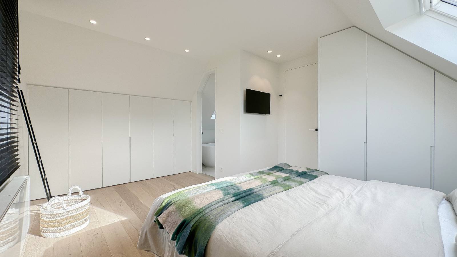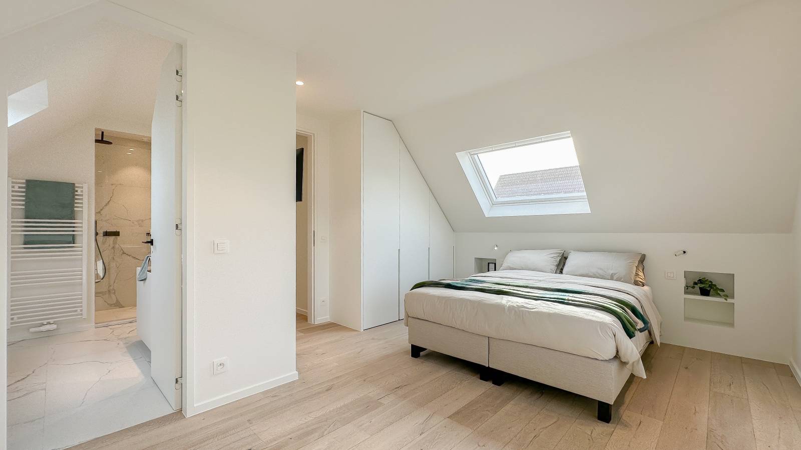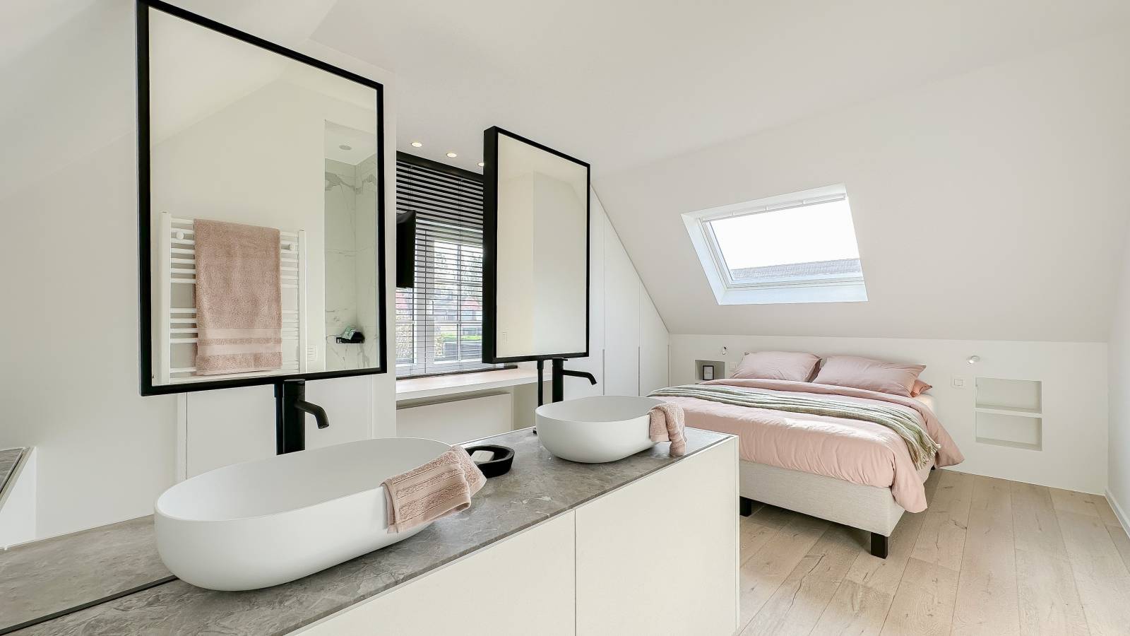 De bovenverdieping omvat vier slaapkamers, waaronder twee royale suites met elk een eigen luxueuze badkamer.