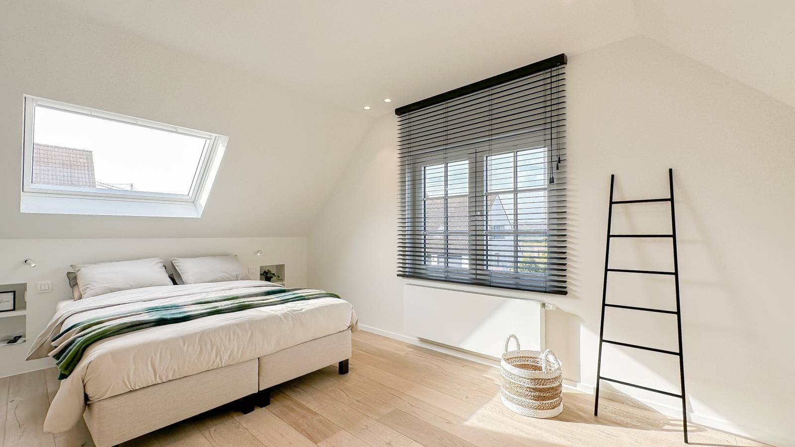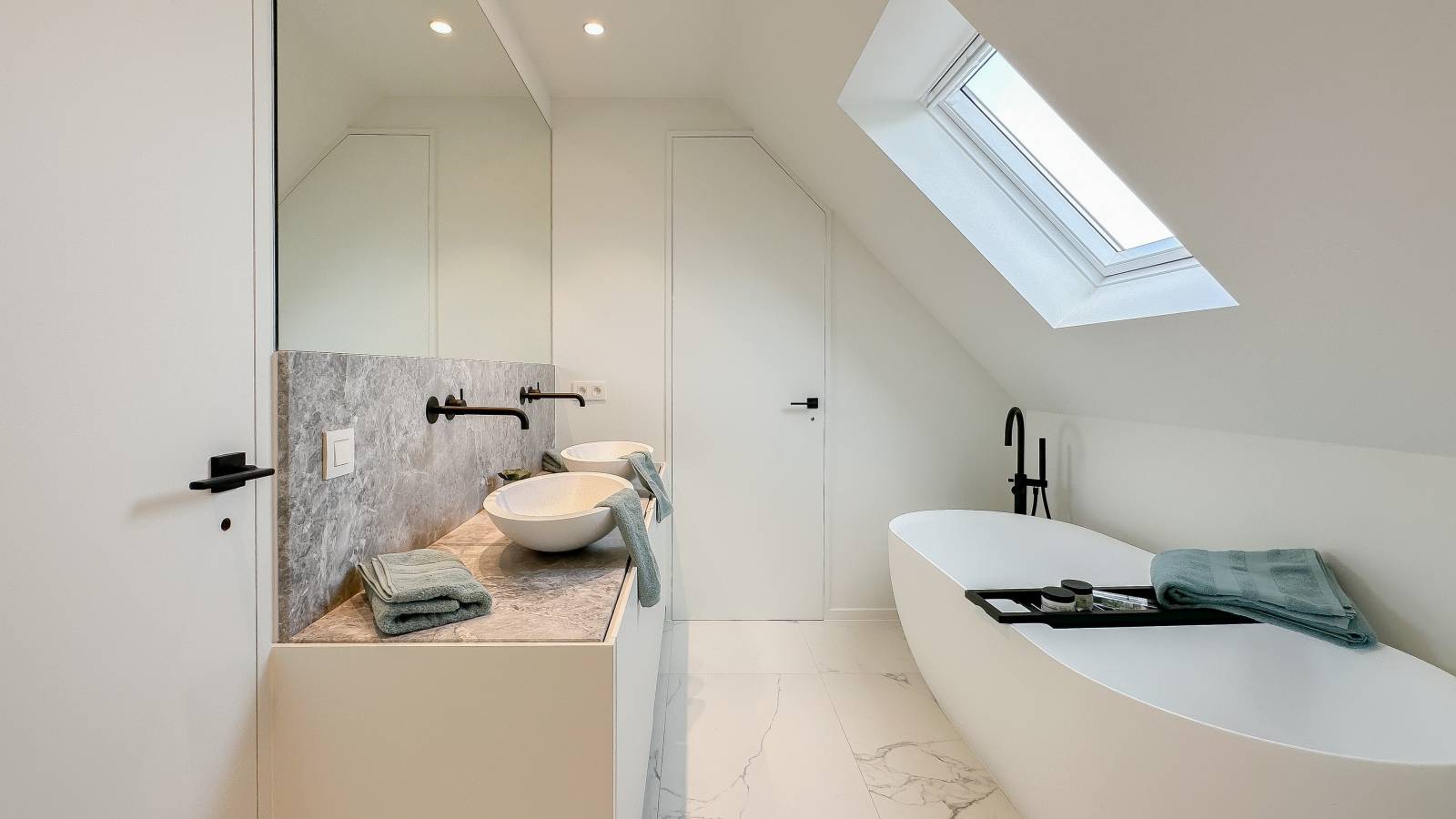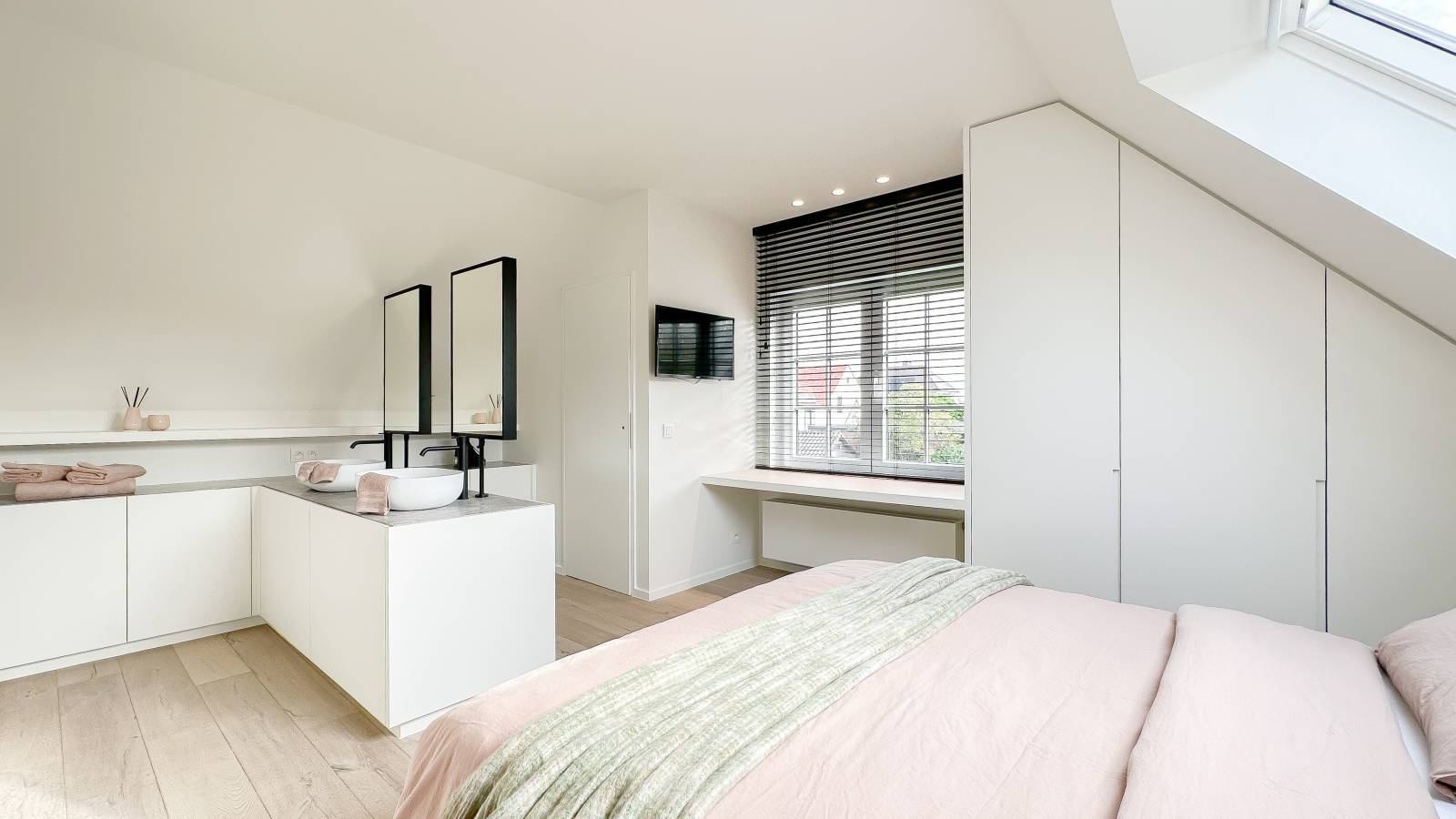 De bovenverdieping omvat vier slaapkamers, waaronder twee royale suites met elk een eigen luxueuze badkamer.