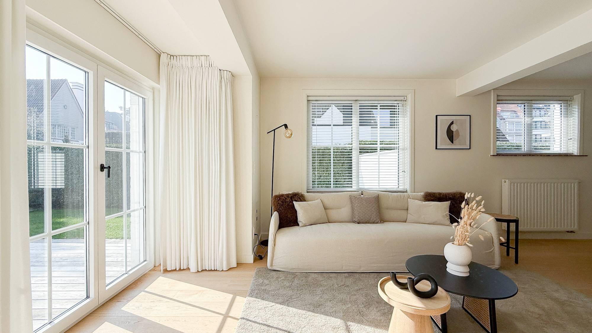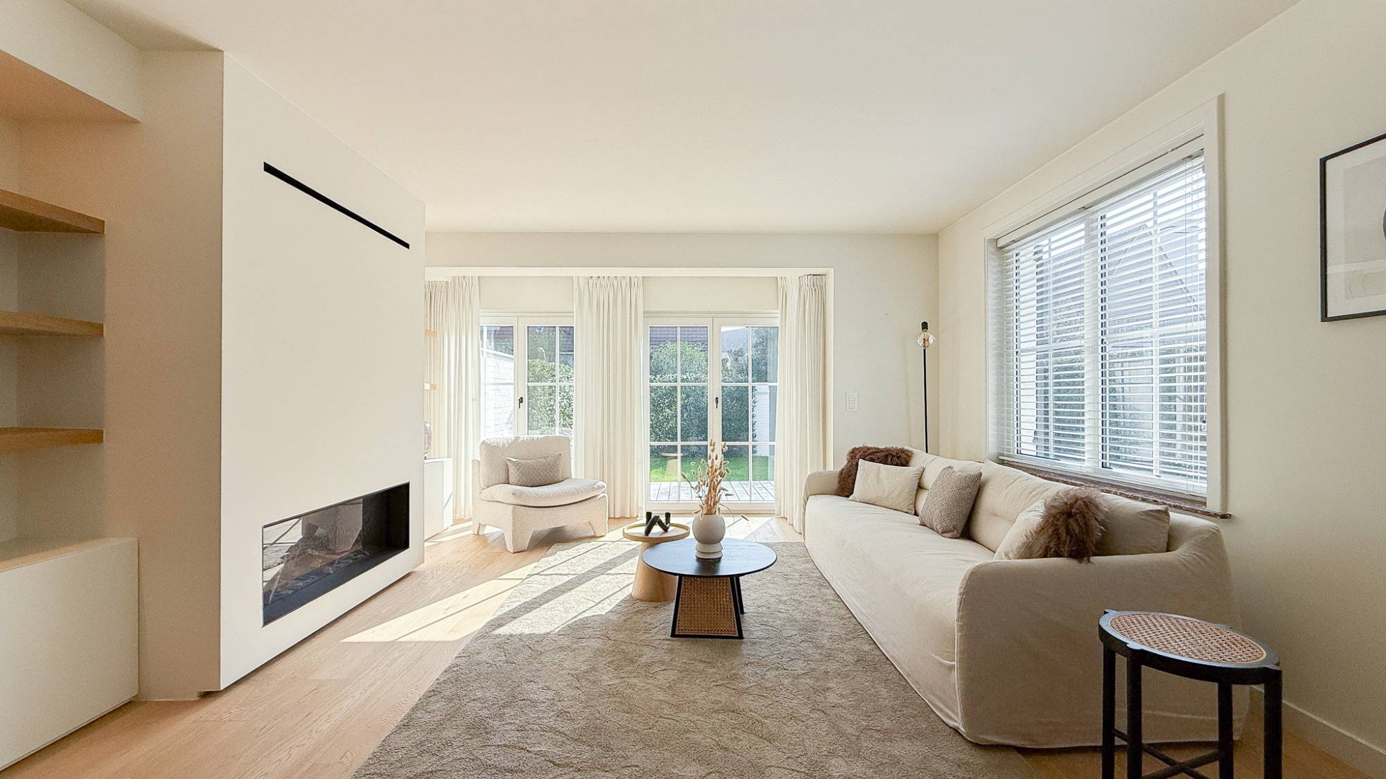 De woning verwelkomt u via een verzorgde inkomhal met gastentoilet en vestiaire. De lichtrijke leefruimte met zithoek, eetplaats en gezellige open haard geniet van een directe verbinding met de zonnige tuin. Grote raampartijen zorgen voor een aangename lichtinval en een mooi contact met buiten.