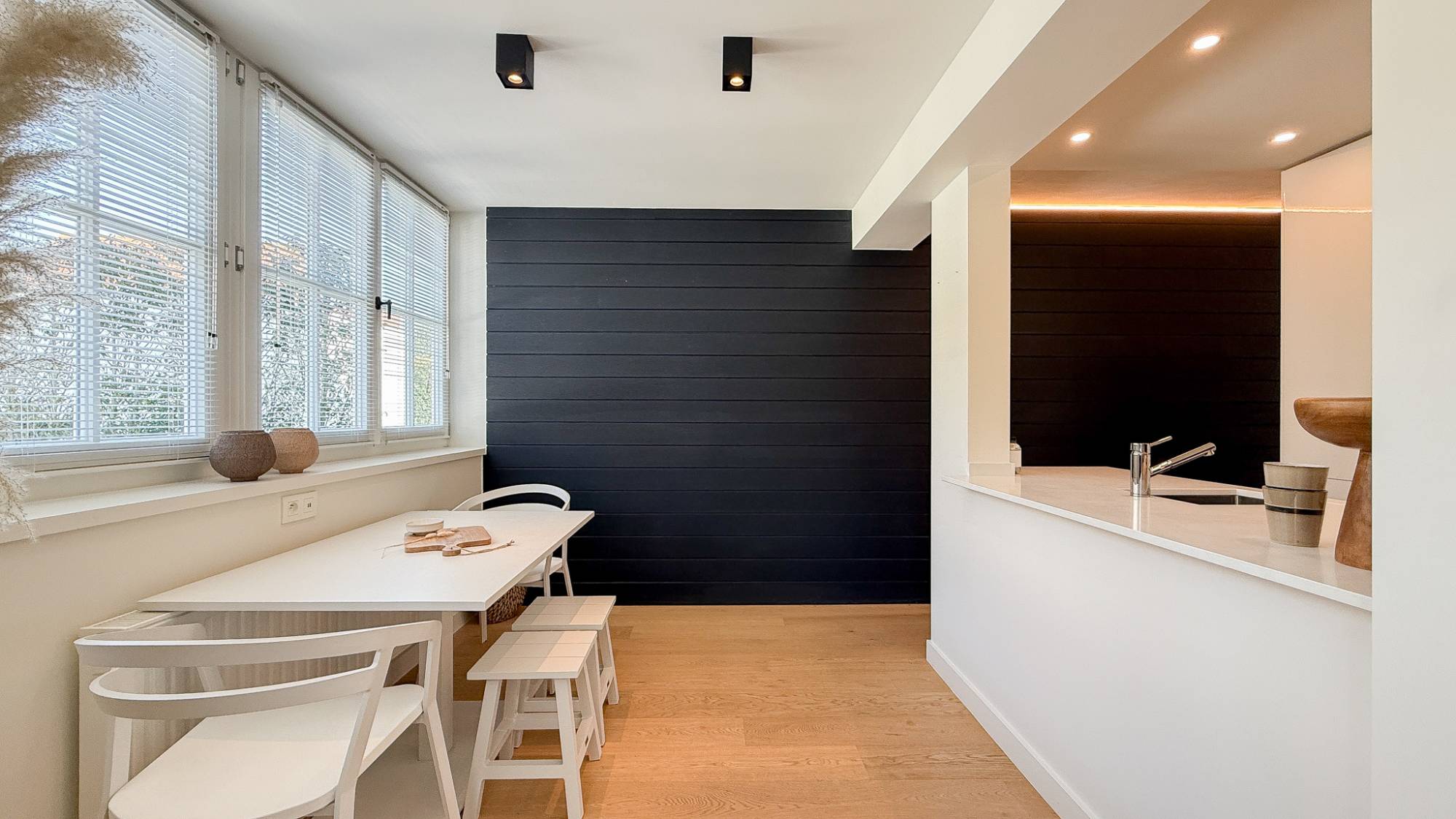 De volledig uitgeruste keuken met ontbijthoek biedt alle hedendaags comfort en sluit perfect aan op de leefruimte.