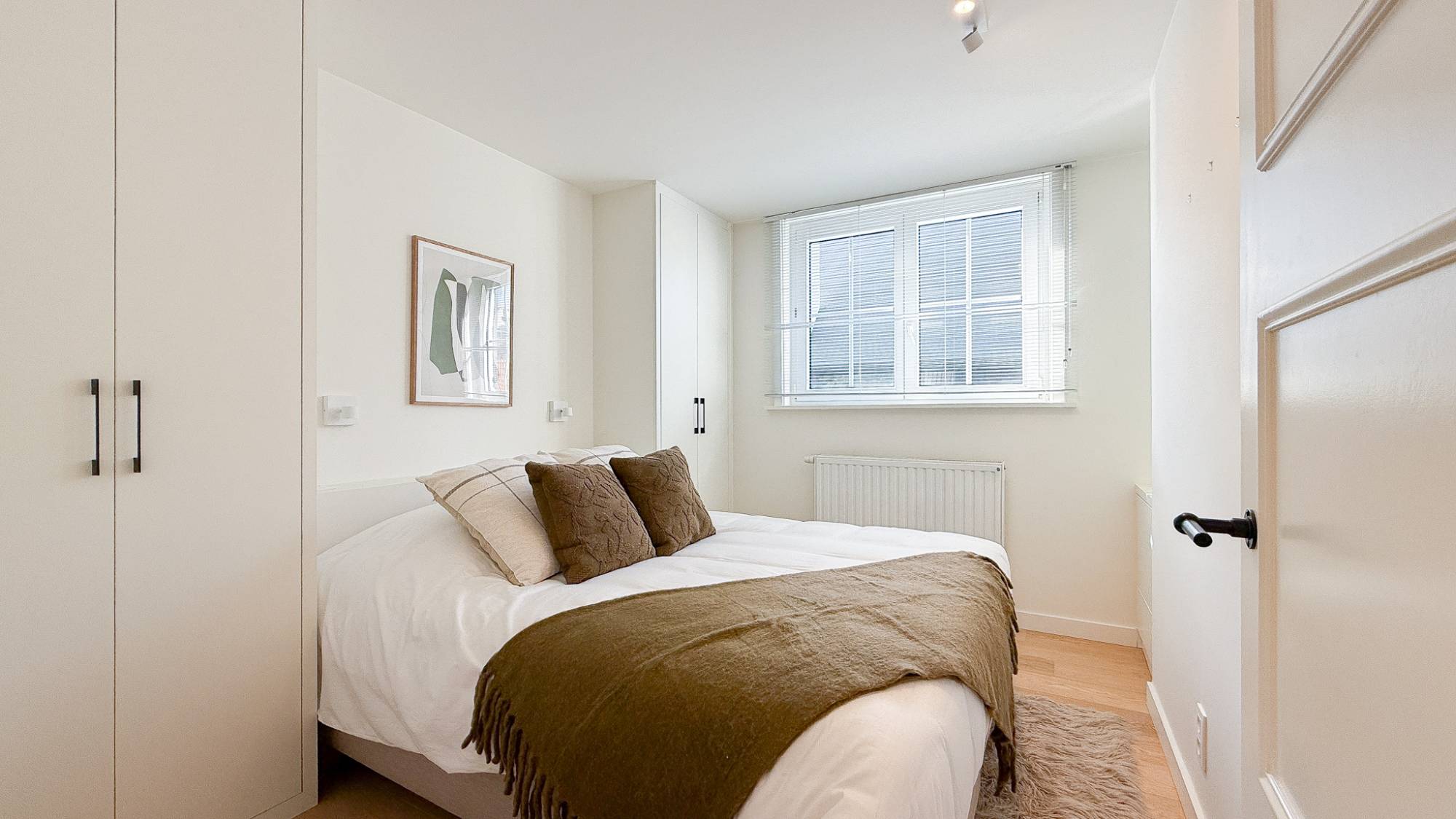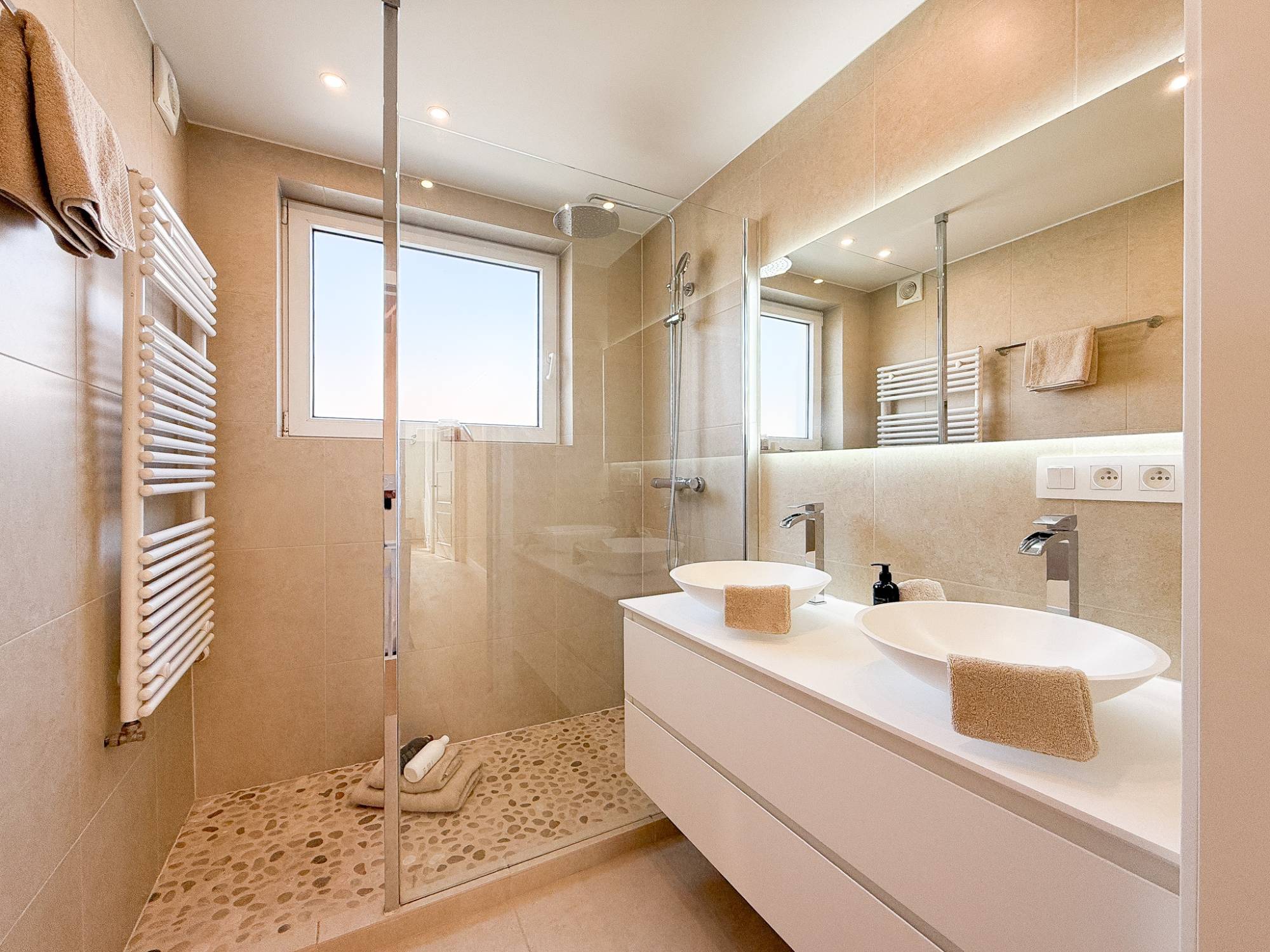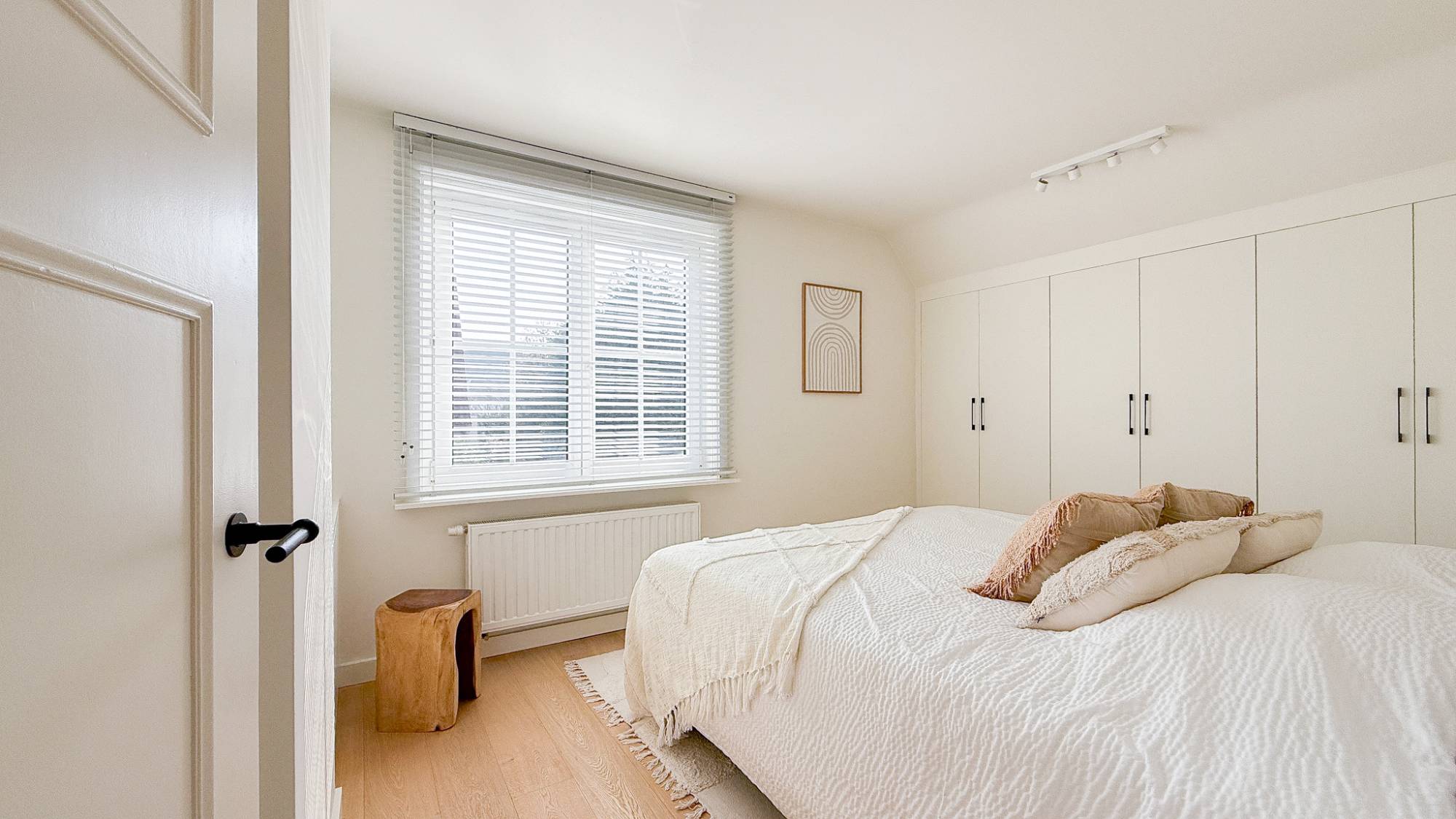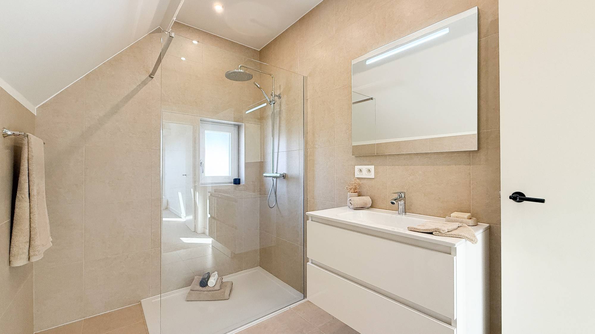 Op de eerste verdieping bevindt zich de ruime master bedroom met ingemaakte kasten. Verder is er een tweede volwaardige slaapkamer met ingemaakte kasten en een derde, kleinere kamer die zich uitstekend leent als bureau, dressing of kinderkamer. Daarnaast is er een aparte douchekamer, bestaande uit dubbele lavabo, douche en toilet.