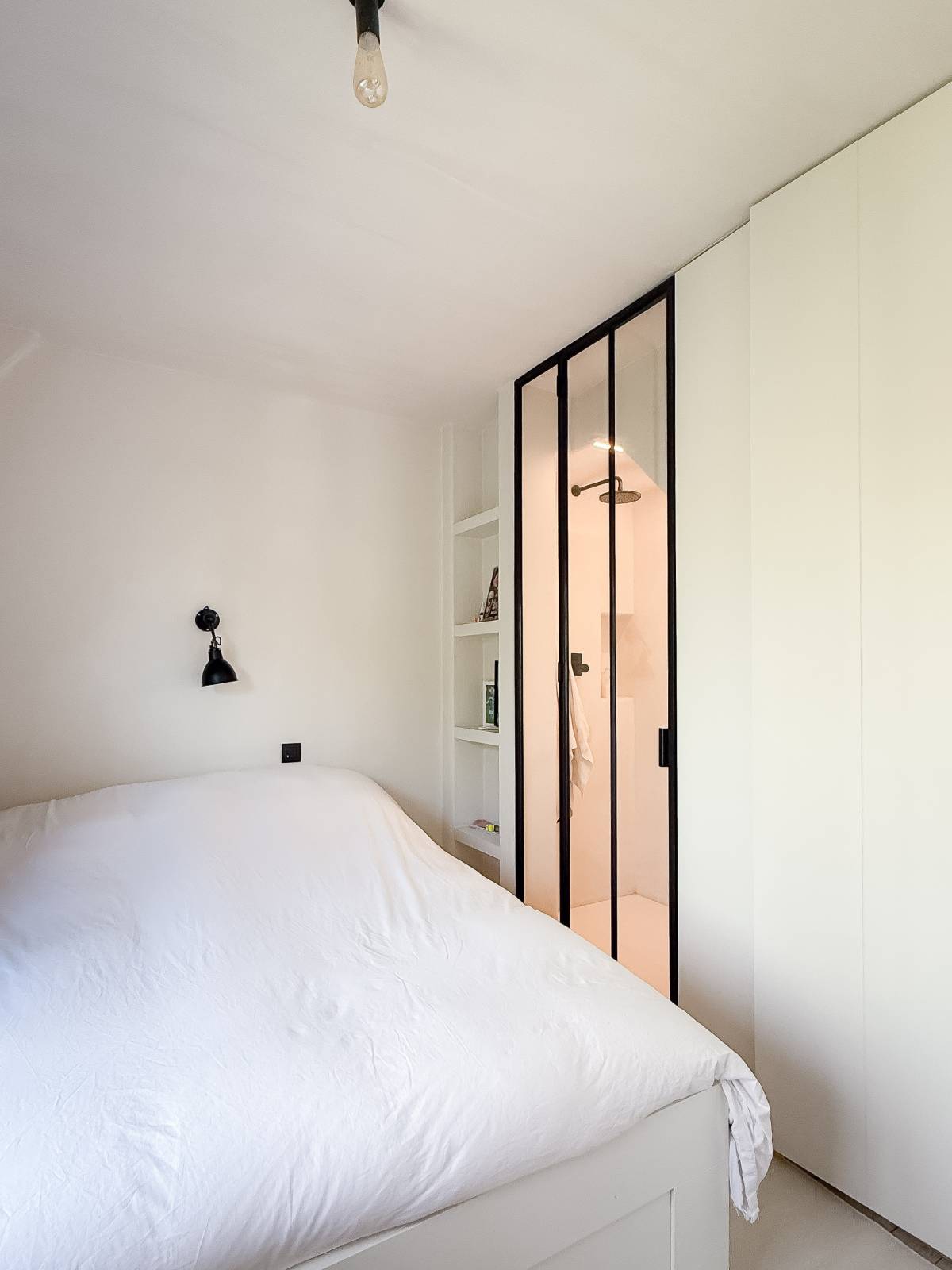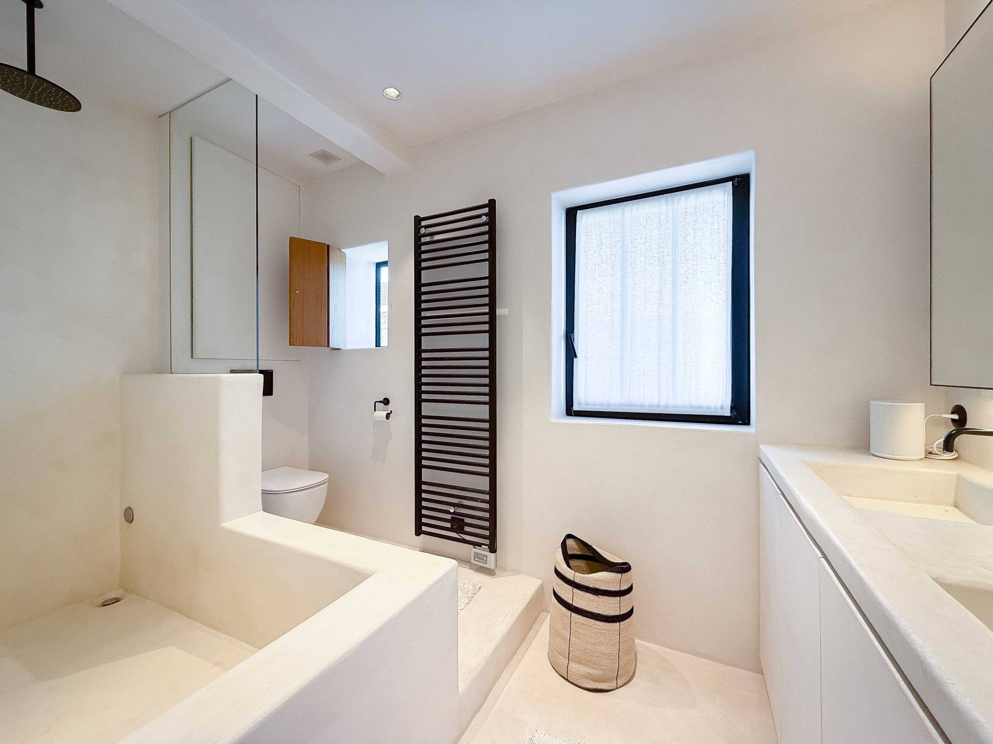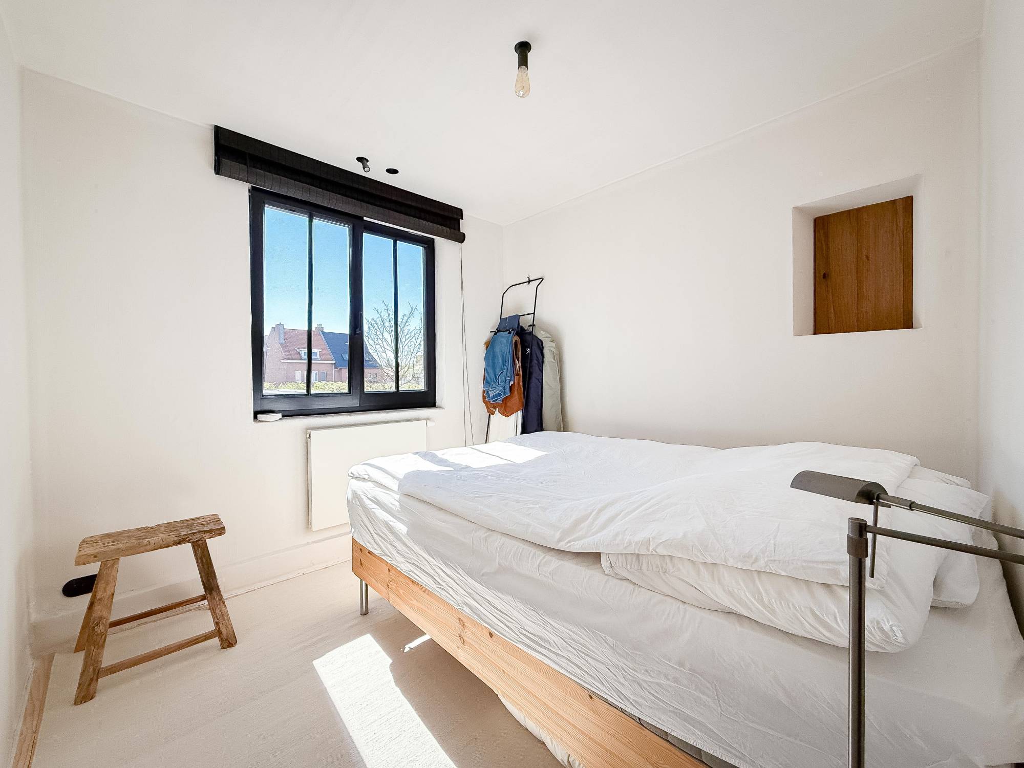 Op de eerste verdieping bevinden zich drie volwaardige slaapkamers. De stijlvolle badkamer beschikt over een dubbele wastafel, een ligbad/douche en een toilet, allemaal afgewerkt in onderhoudsvriendelijke beton ciré. Eén van de slaapkamers geniet bovendien van een eigen en suite douchekamer, ideaal voor gasten of tieners. De tweede verdieping biedt ruimte aan een vierde slaapkamer, voorzien van ingemaakte kasten.