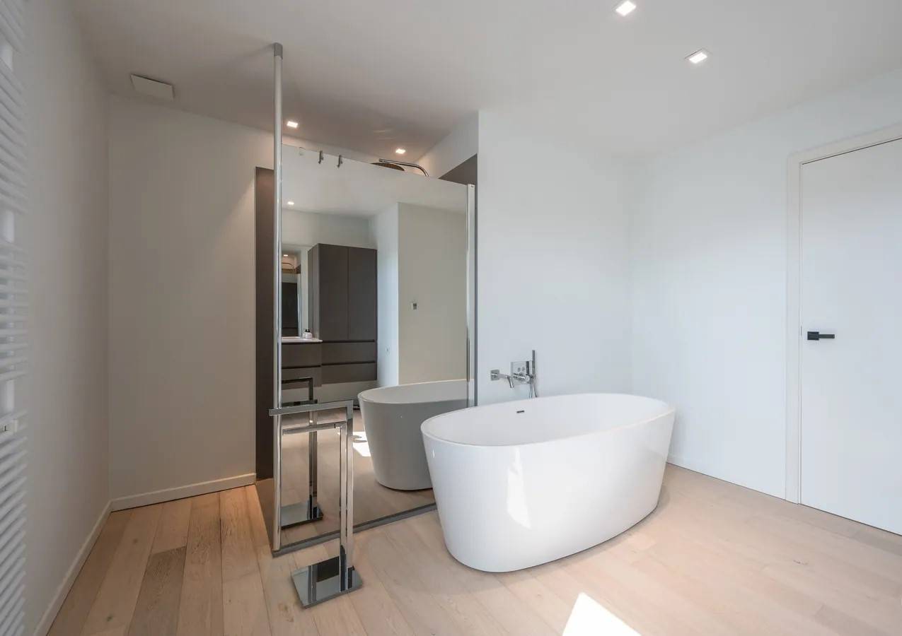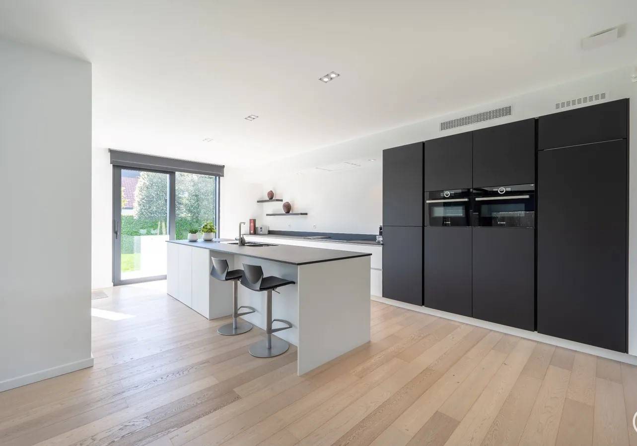Indeling: Het gelijkvloers verwelkomt je met een ruime inkomhal, maatwerk vestiairekast, designverlichting en plafondhoge deuren in glas/metaal. De leefruimte is afgewerkt met eiken parket, inbouwspots met dimmers en elegante raamdecoratie. De open keuken is uitgevoerd in Nano Nero/Bianco met een zwart granieten werkblad en voorzien van kwaliteitsvolle inbouwtoestellen van Bosch en Novy.
