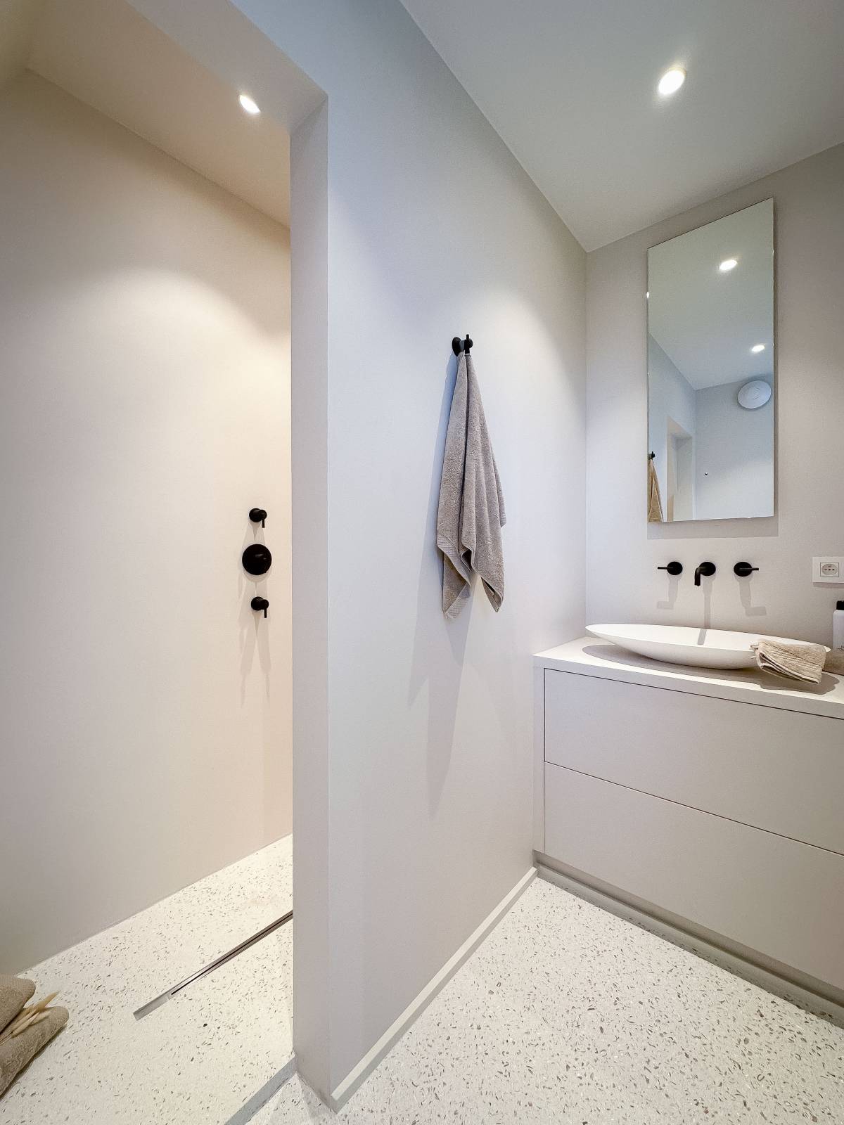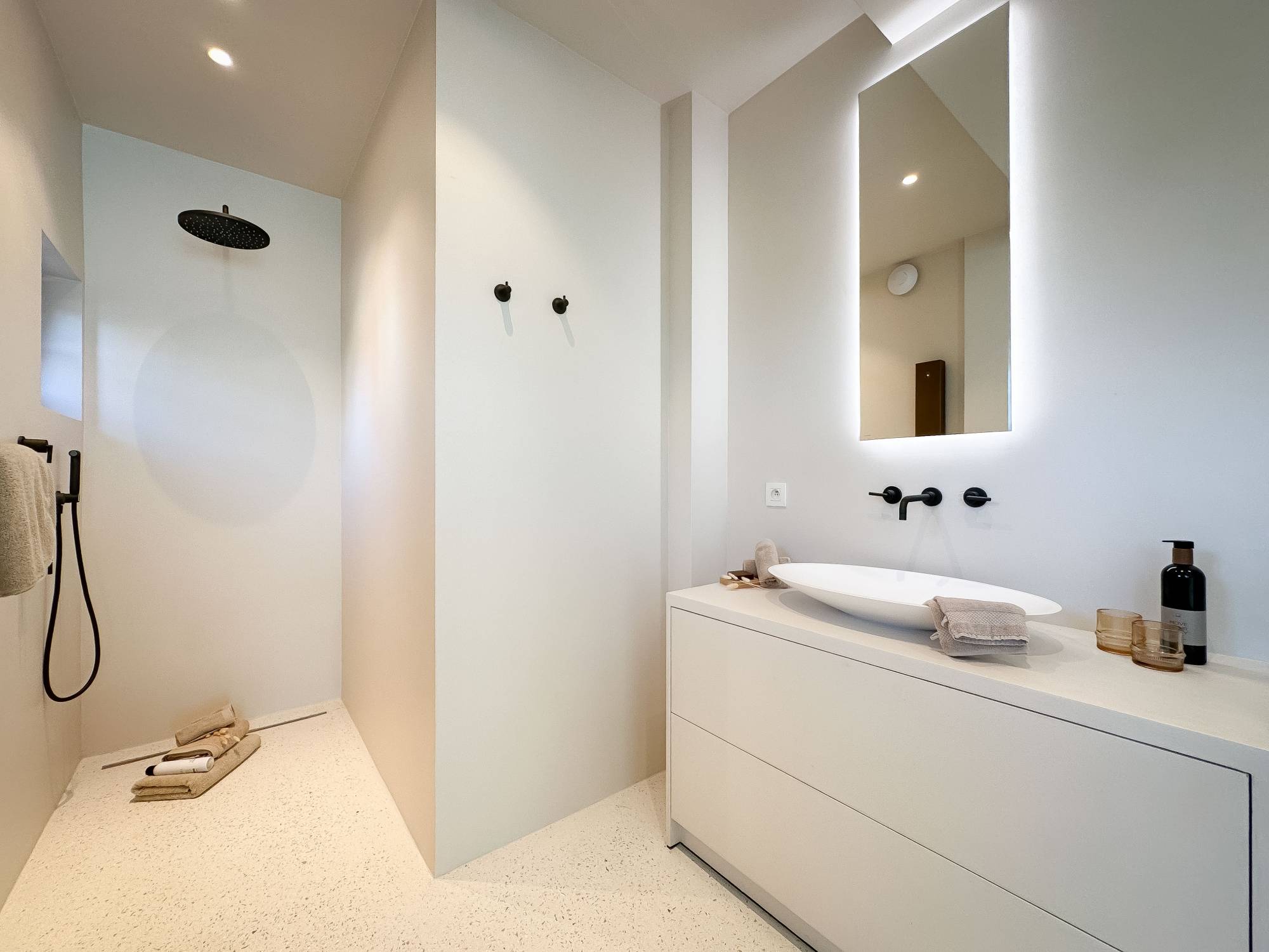 De 1e verdieping beschikt over 3 ruime slaapkamers, één beschikt over een ensuite badkamer met inloopdouche en toilet. Er is een 2e badkamer met ligbad en een apart toilet, wat zorgt voor extra comfort en privacy. De volledige bovenverdieping is afgewerkt met een granito terrazzo vloer.