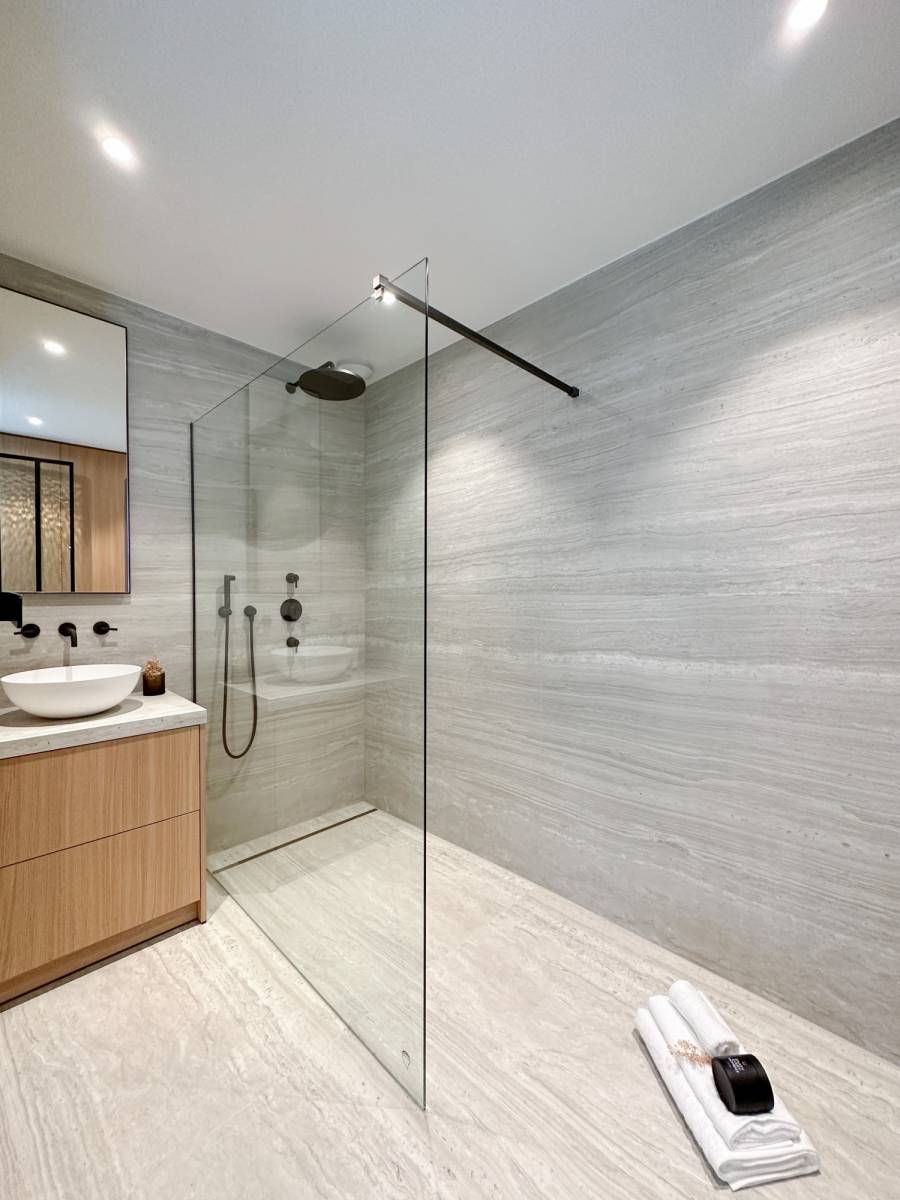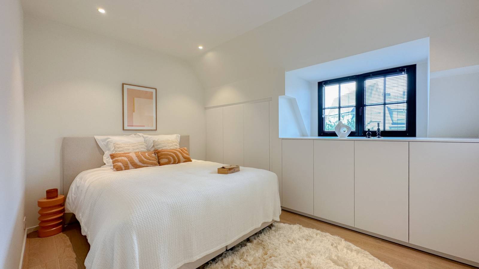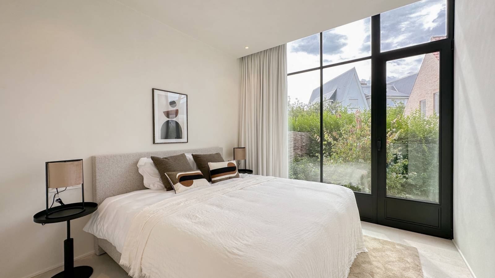 Op de gelijkvloerse verdieping bevindt zich de 1e slaapkamer met aansluitend een luxueus ingerichte douchekamer.