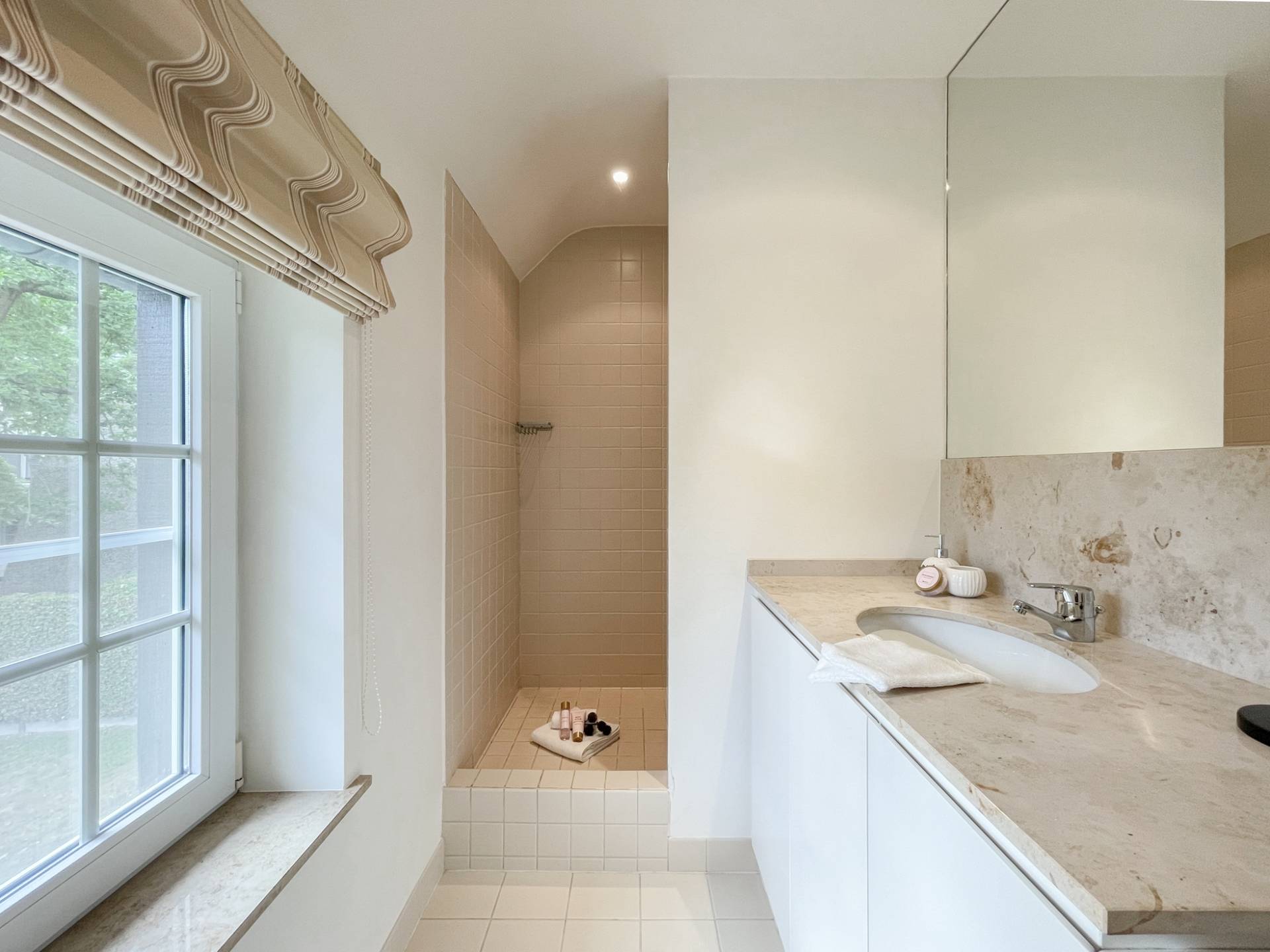 Op de 1e verdieping bevindt zich de nachthal / tv-hoek / bureelruimte. De master bedroom beschikt over een ensuite badkamer, bestaande uit ruime douche, lavabo en toilet. Ingemaakte kasten. Slaapkamer 2 en 3 beschikken eveneens over tal van ingemaakte kasten. Er is een afzonderlijke badkamer met ruime douche en lavabo. Apart toilet.