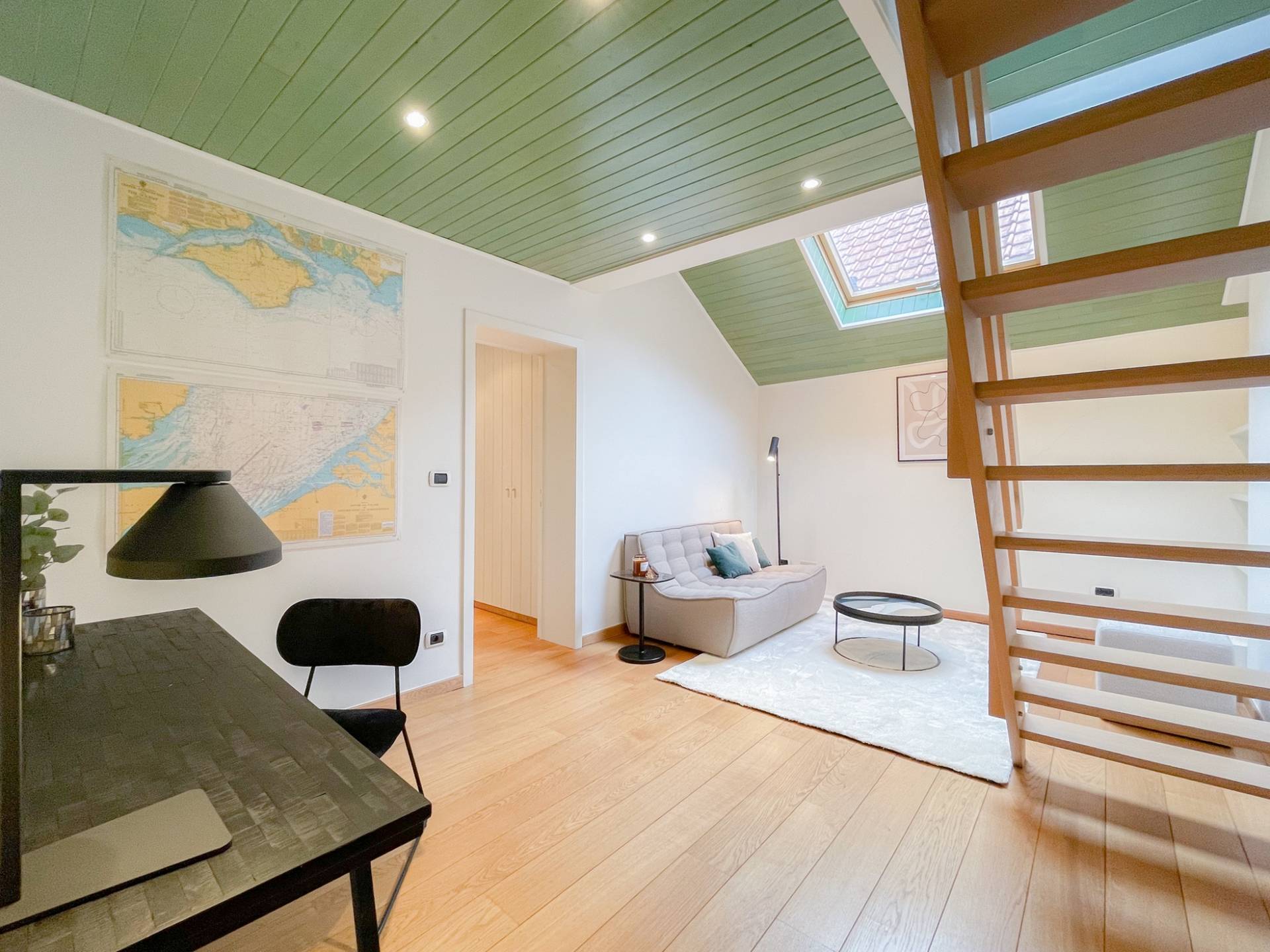 De 2e verdieping is ingericht als polyvalente ruimte waar zich momenteel 3 bijkomende slaaphoeken bevinden.