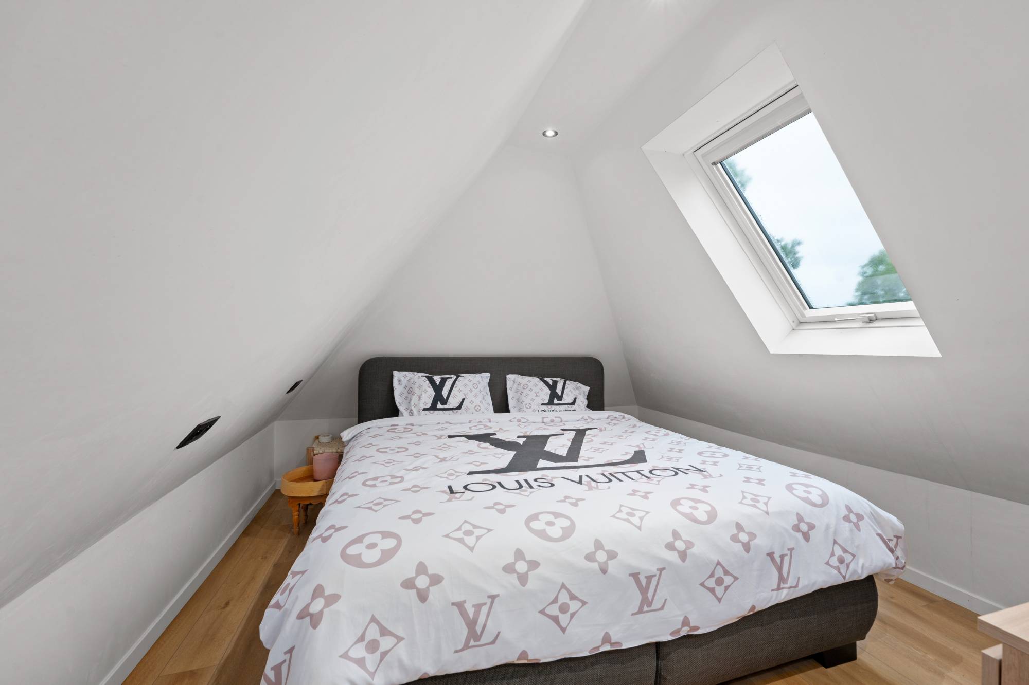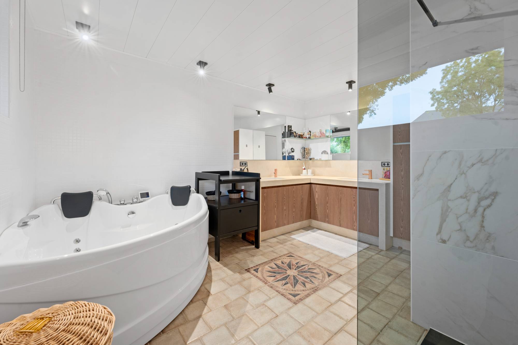 De keuken is praktisch ingedeeld en voorzien van alle huishoudelijke apparatuur. Op de gelijkvloerse verdieping is er een strijkkamer/bureau, een luxueuze badkamer met inloopdouche, dubbele lavabo en bubbelbad en een dressing. Zolderkamer met ensuite inloopdouche, perfect voor gasten.