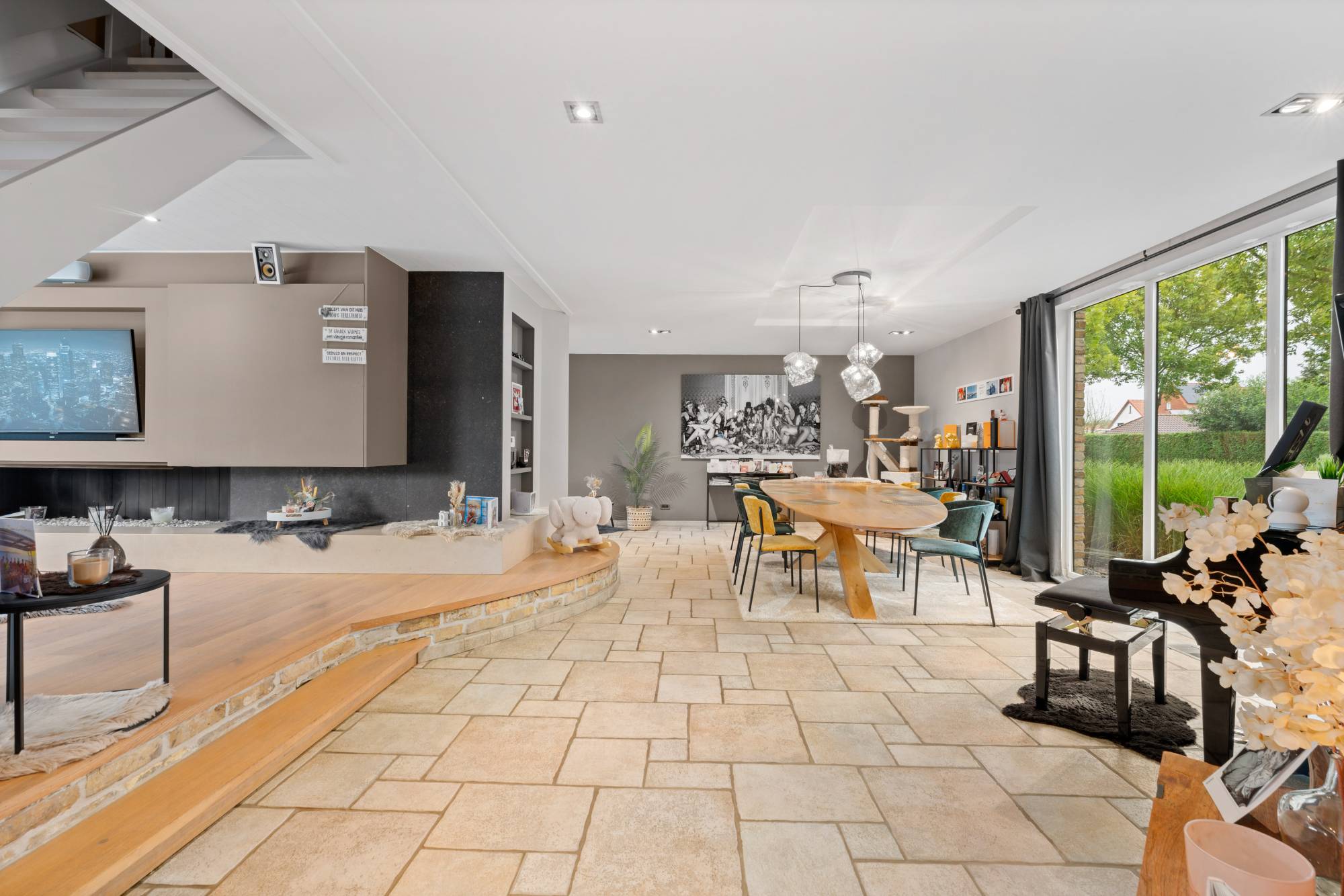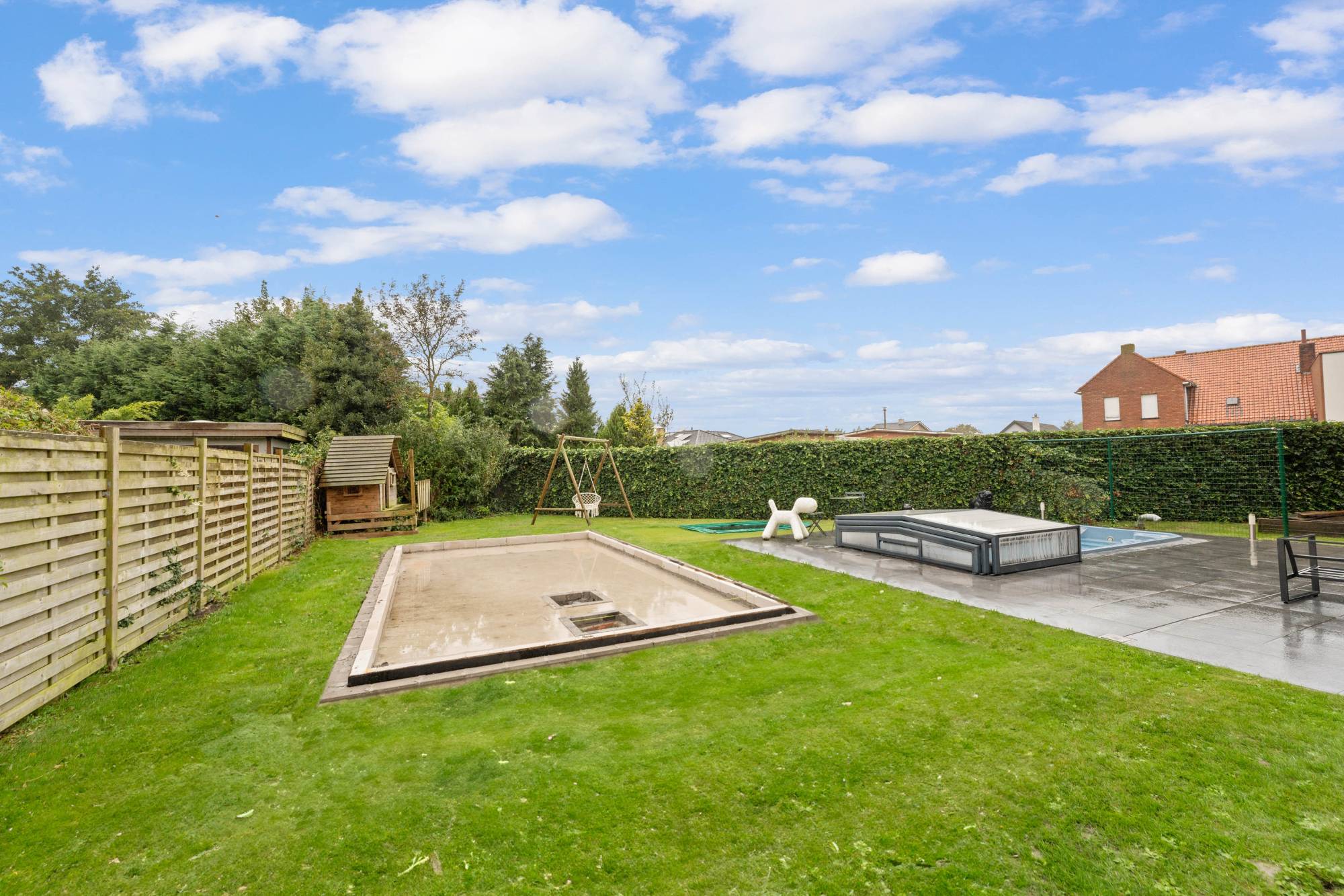 Er is een tv-hoek aanwezig, waar ook een open gashaard voorzien werd. In de tuin is er een verwarmd zwembad en de mogelijkheid tot het creëeren van een poolhouse!