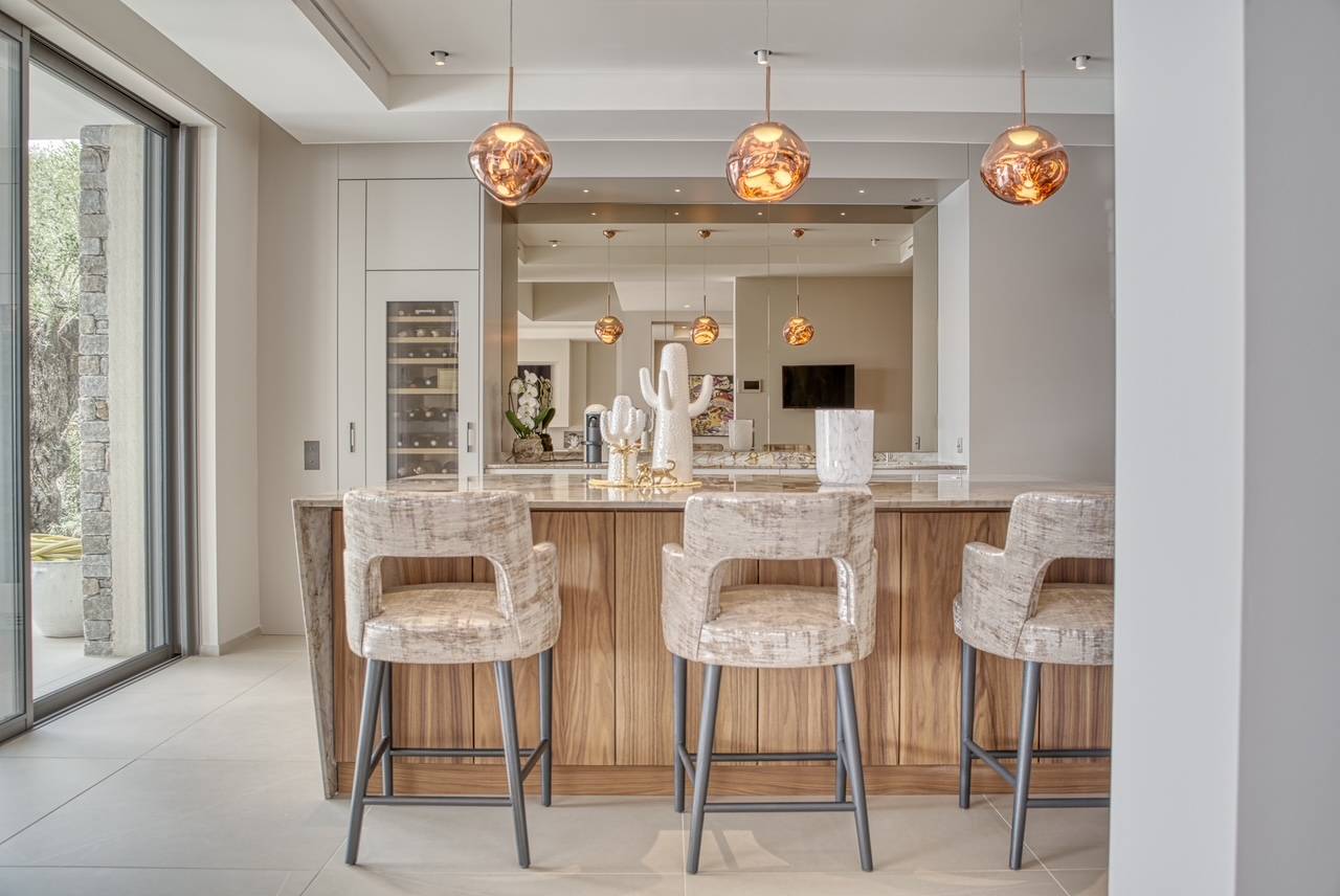 De lichtrijke leefruimtes gaan naadloos over in het buitenleven en geven uit op een ruim terras met verwarmd overloopzwembad — de ideale plek om te genieten van het indrukwekkende uitzicht. De moderne keuken met bijkeuken, eetruimte en woonkamer vormen samen een stijlvolle en uitnodigende leefomgeving.