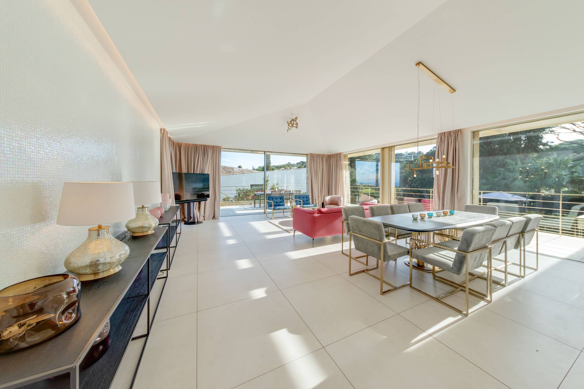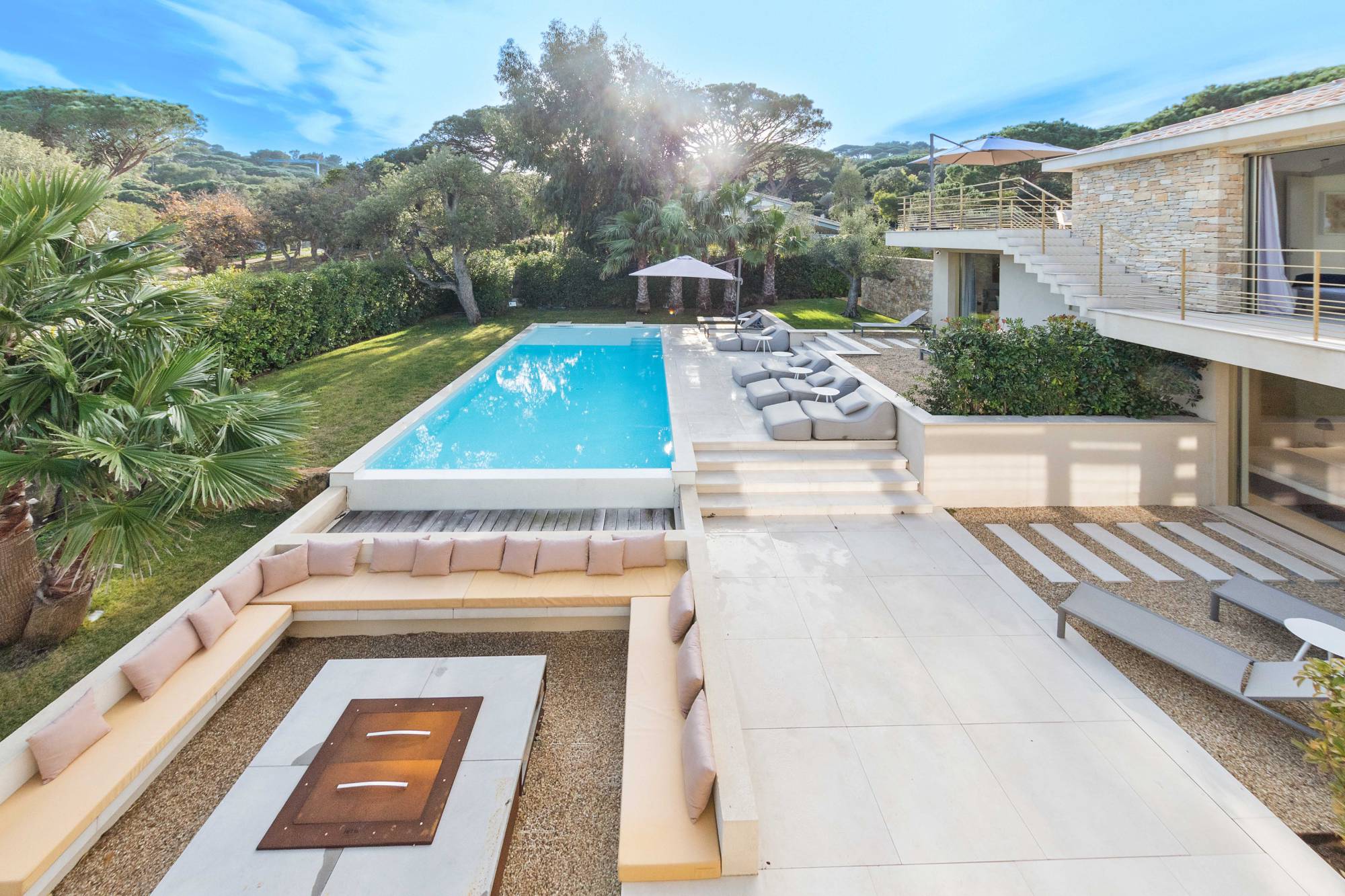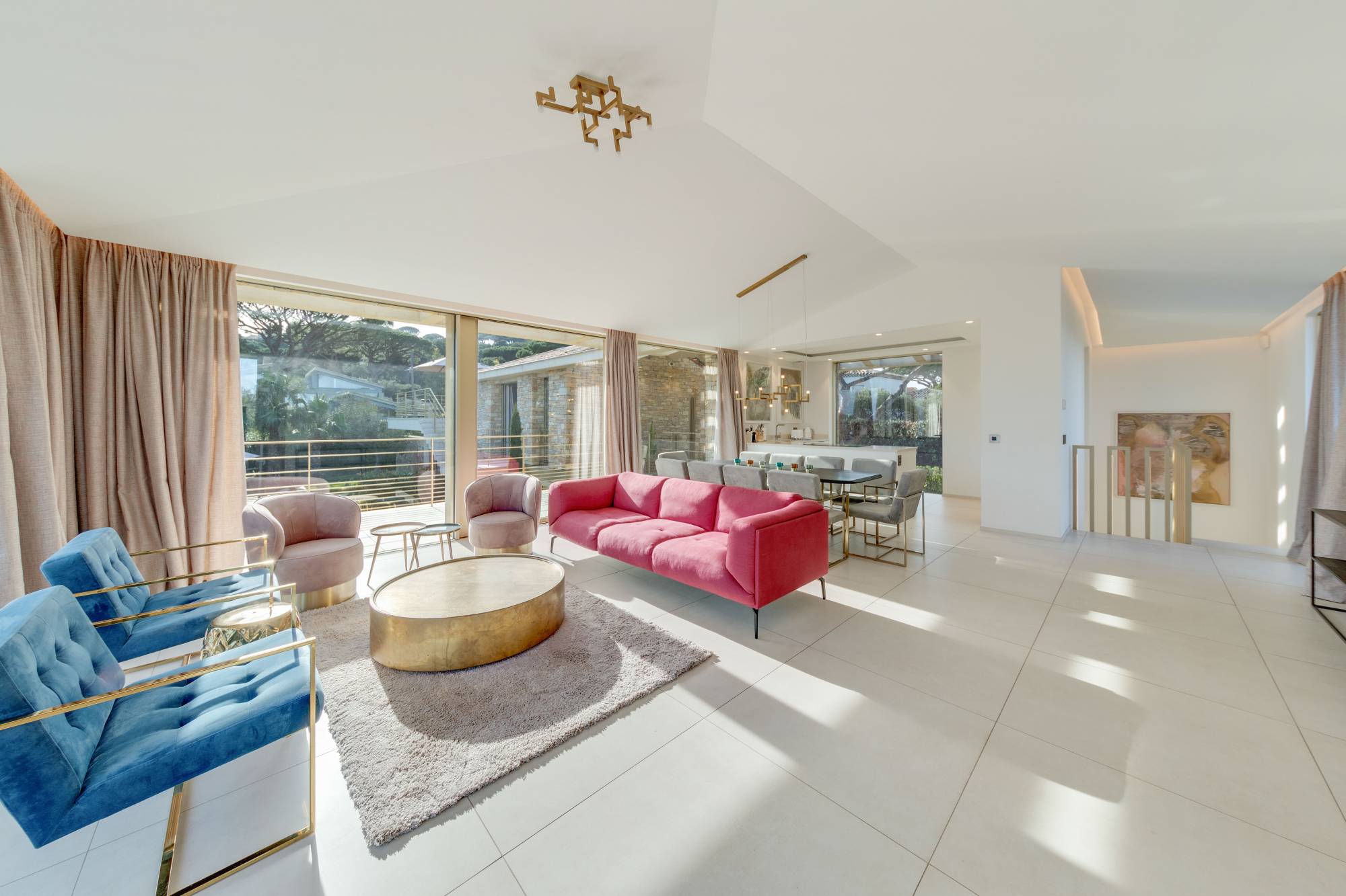 Deze villa is gebouwd in 2021 in een beveiligd woonpark naast het beroemde Plage des Salins in Saint-Tropez. Het heeft een chique, glamoureuze stijl met goudkleurige afwerking en een prachtig wit muurmozaïek met regenboogaccenten. Het beschikt over zonnige terrassen, een mooie tuin met een groot verwarmd zwembad en een prachtig uitzicht op zee.