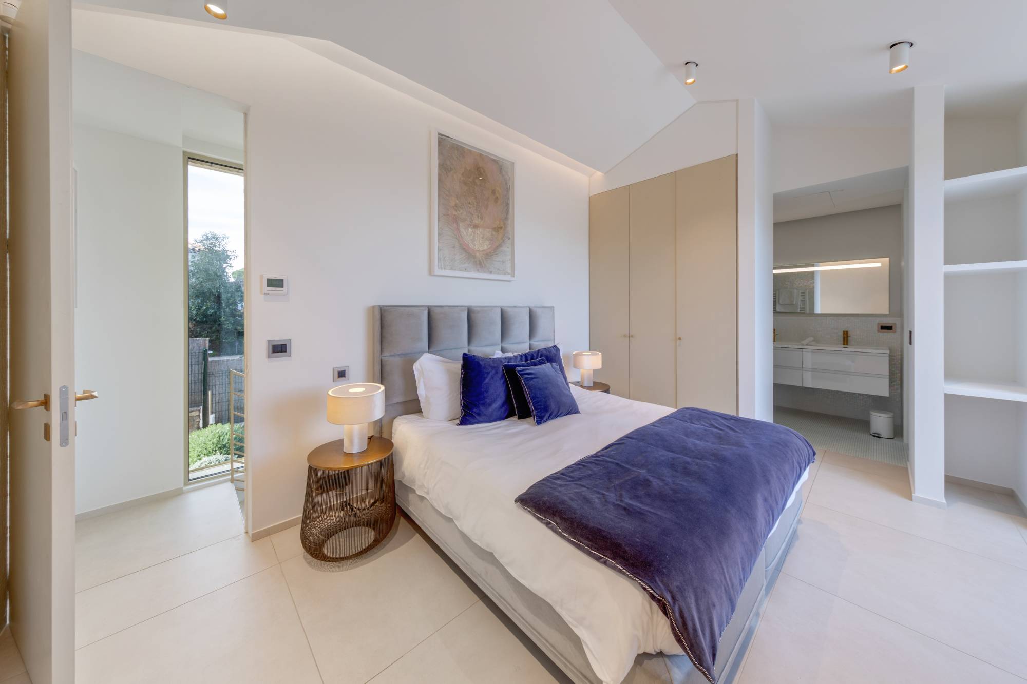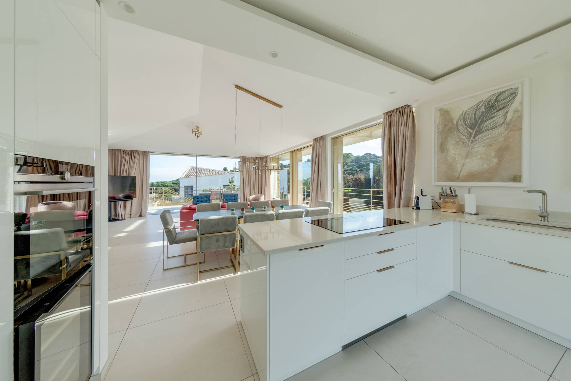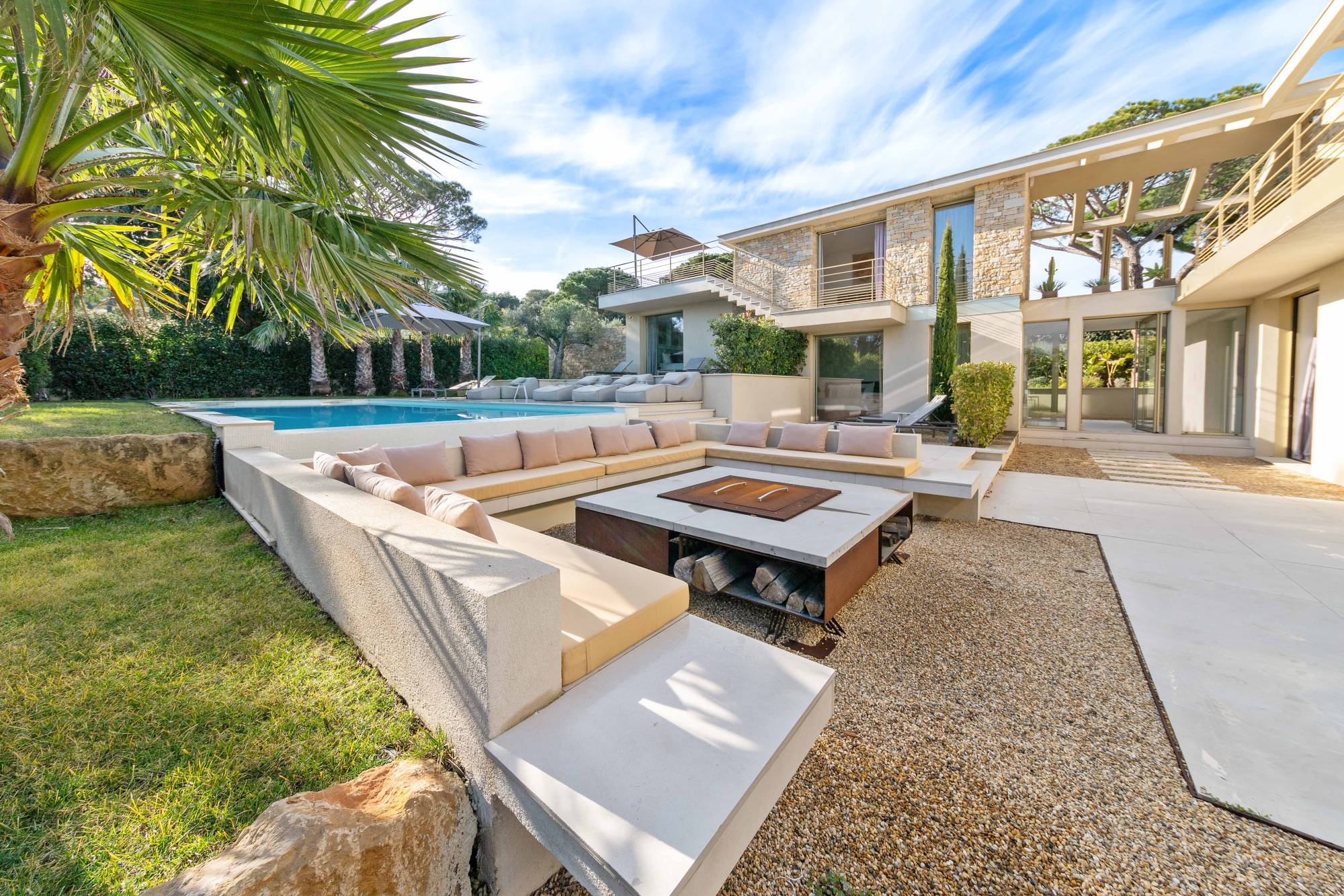 Deze villa is gebouwd in 2021 in een beveiligd woonpark naast het beroemde Plage des Salins in Saint-Tropez. Het heeft een chique, glamoureuze stijl met goudkleurige afwerking en een prachtig wit muurmozaïek met regenboogaccenten. Het beschikt over zonnige terrassen, een mooie tuin met een groot verwarmd zwembad en een prachtig uitzicht op zee.