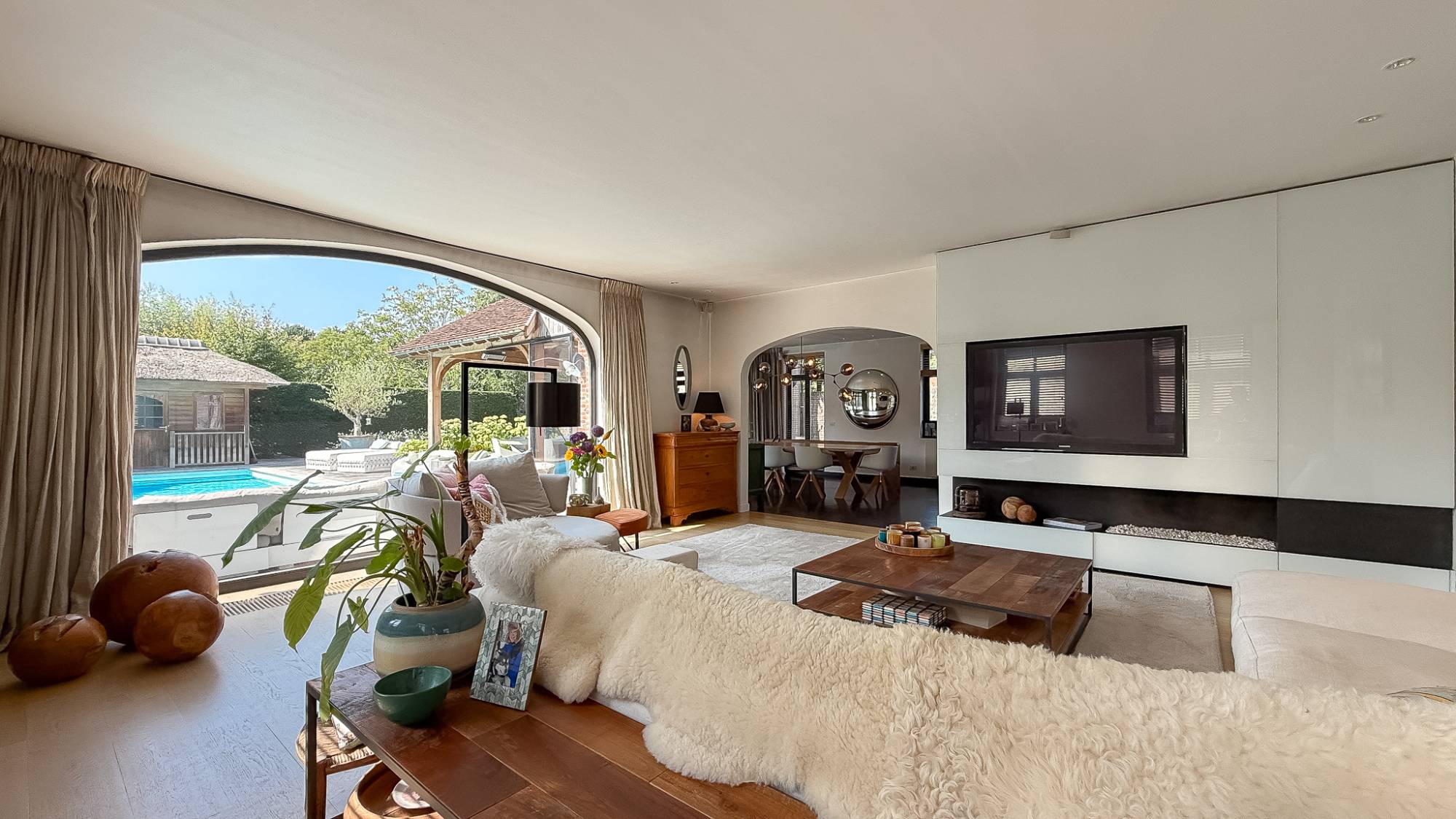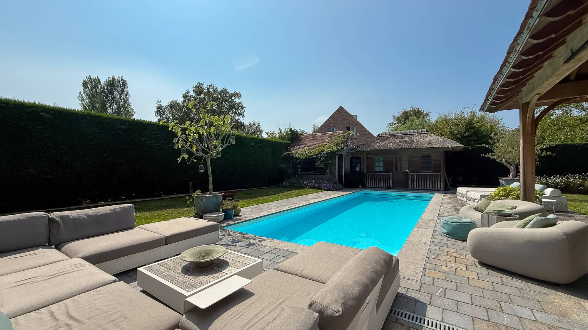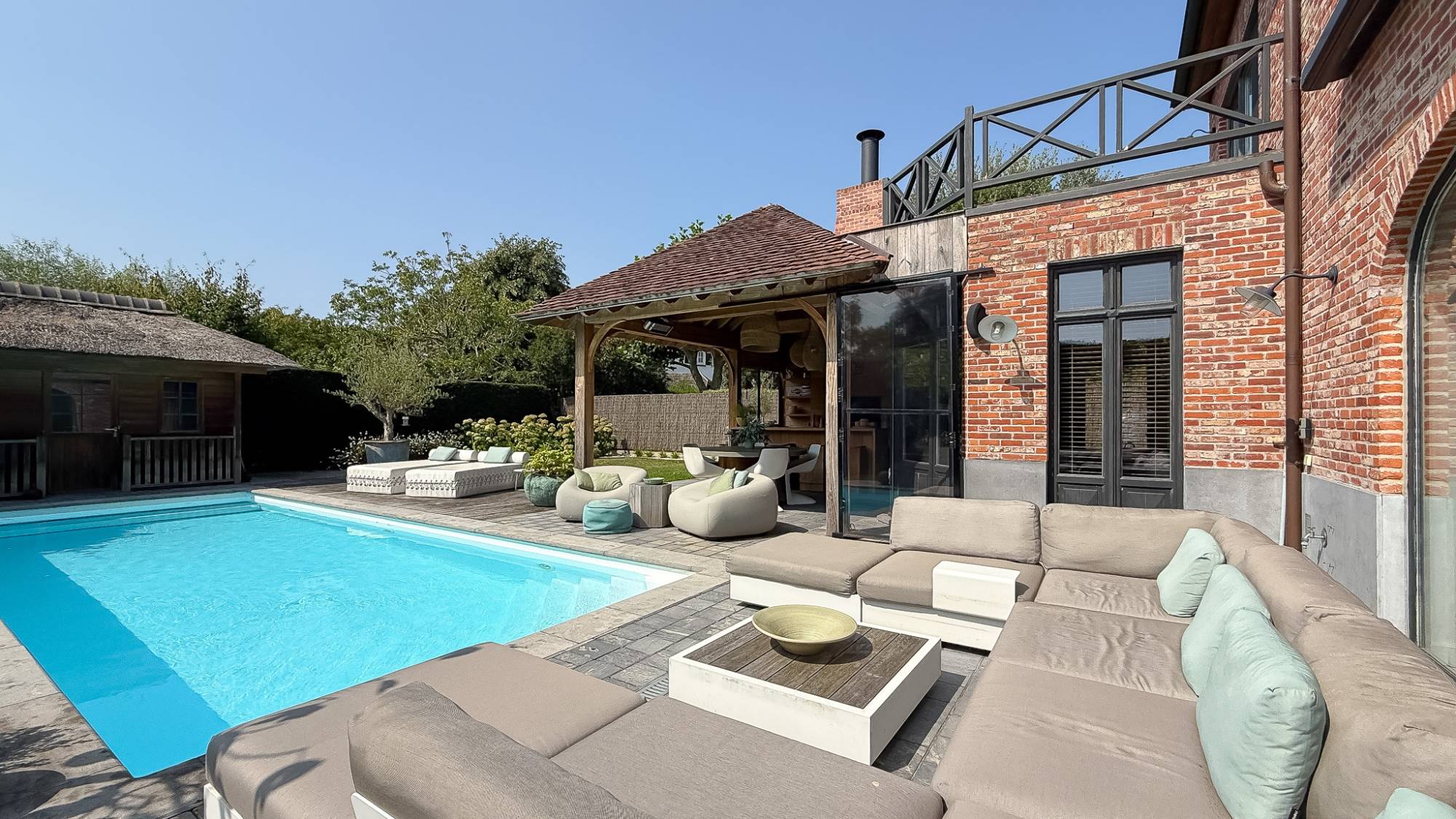 De leefruimte met open haard en eetkamer sluit naadloos aan op de moderne keuken en het overdekte terras met bar en grillhaard – dé plek om samen te genieten, zomer én winter. Op de verdiepingen wachten 5 volwaardige slaapkamers en 4 badkamers, waaronder een master suite met dressing en hammam, ontworpen als privé-oase.