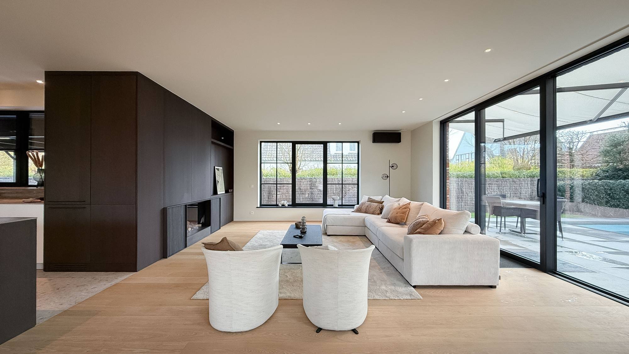 Bij binnenkomst wordt u verwelkomd in een ruime inkomhal met een personenlift die alle verdiepingen verbindt (-1 tot +1), een vestiaire en een gastentoilet. De lichtrijke leefruimte met een elegante gashaard omvat een gezellige zit- en eetplaats en geeft uit op de prachtig aangelegde tuin. De open keuken is volledig uitgerust met hoogwaardige toestellen en grenst aan een praktische bijkeuken/berging. Vanuit alle leefruimtes heeft u toegang tot de zonovergoten terrassen en het schitterende zwembad, dat een ultiem vakantiegevoel creëert.