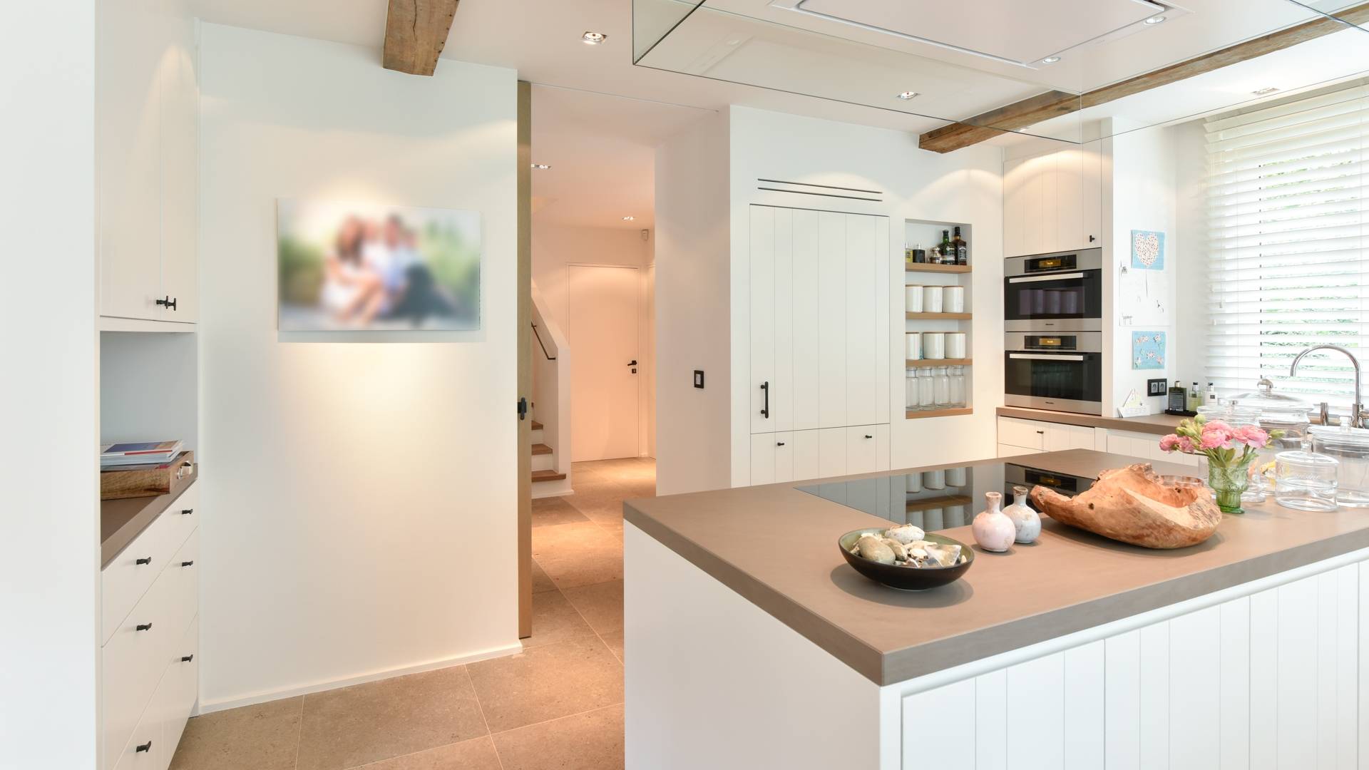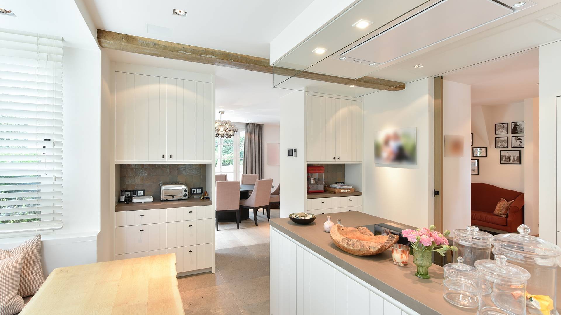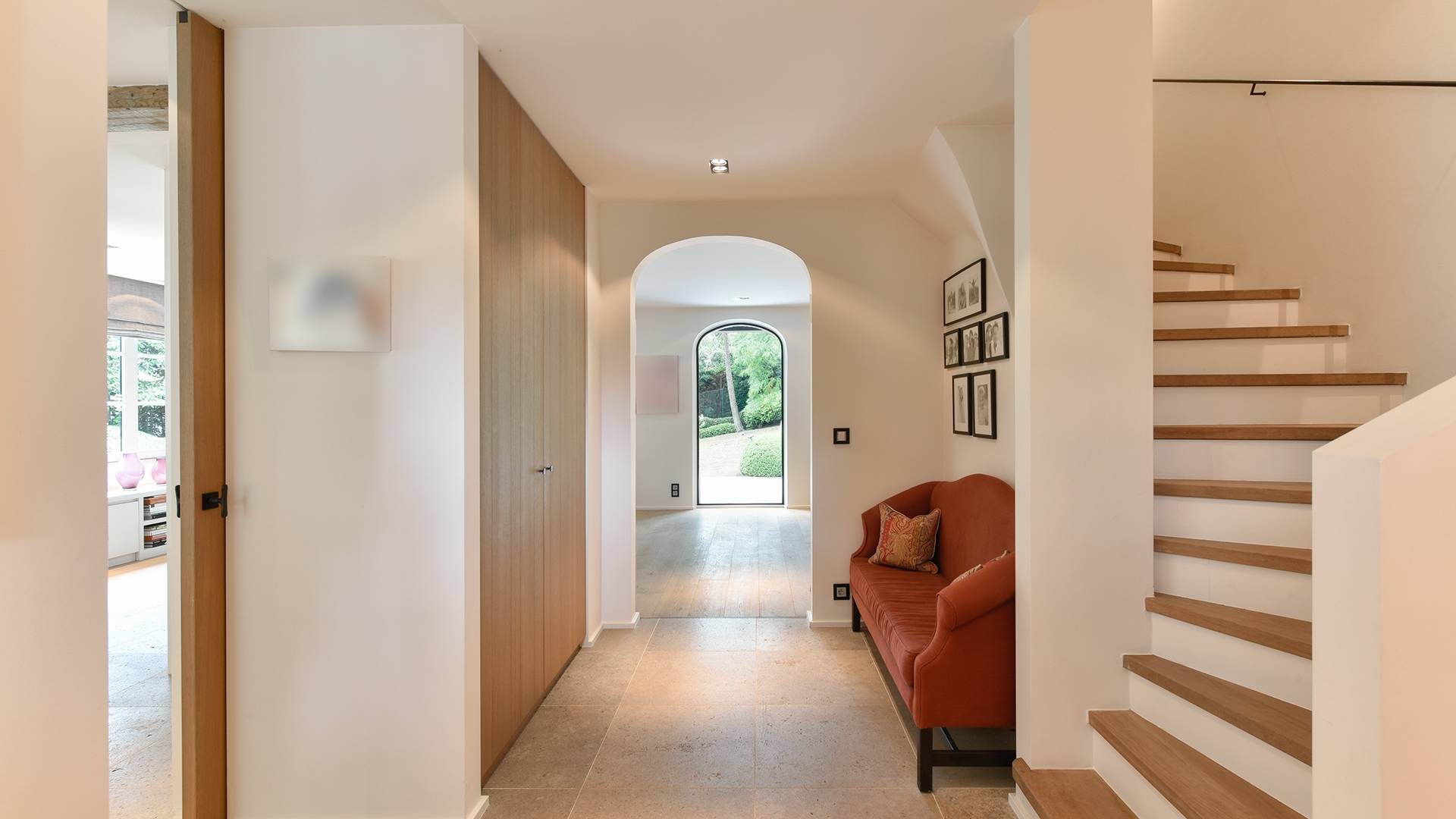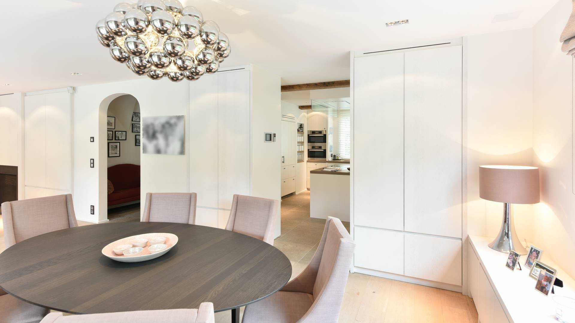 Samenstelling: Ruime inkom met vestiare en gastentoilet. De inkom biedt toegang tot zowel de woonkamer alsook tot de volledig ingerichte keuken met kookeiland en een eethoek met zitbank in de erker. Volgend op de keuken is de eetkamer met talrijke ingemaakte kasten en toegang tot het zonnige terras, net zoals de woonkamer die daarbovenop over een open haard beschikt.