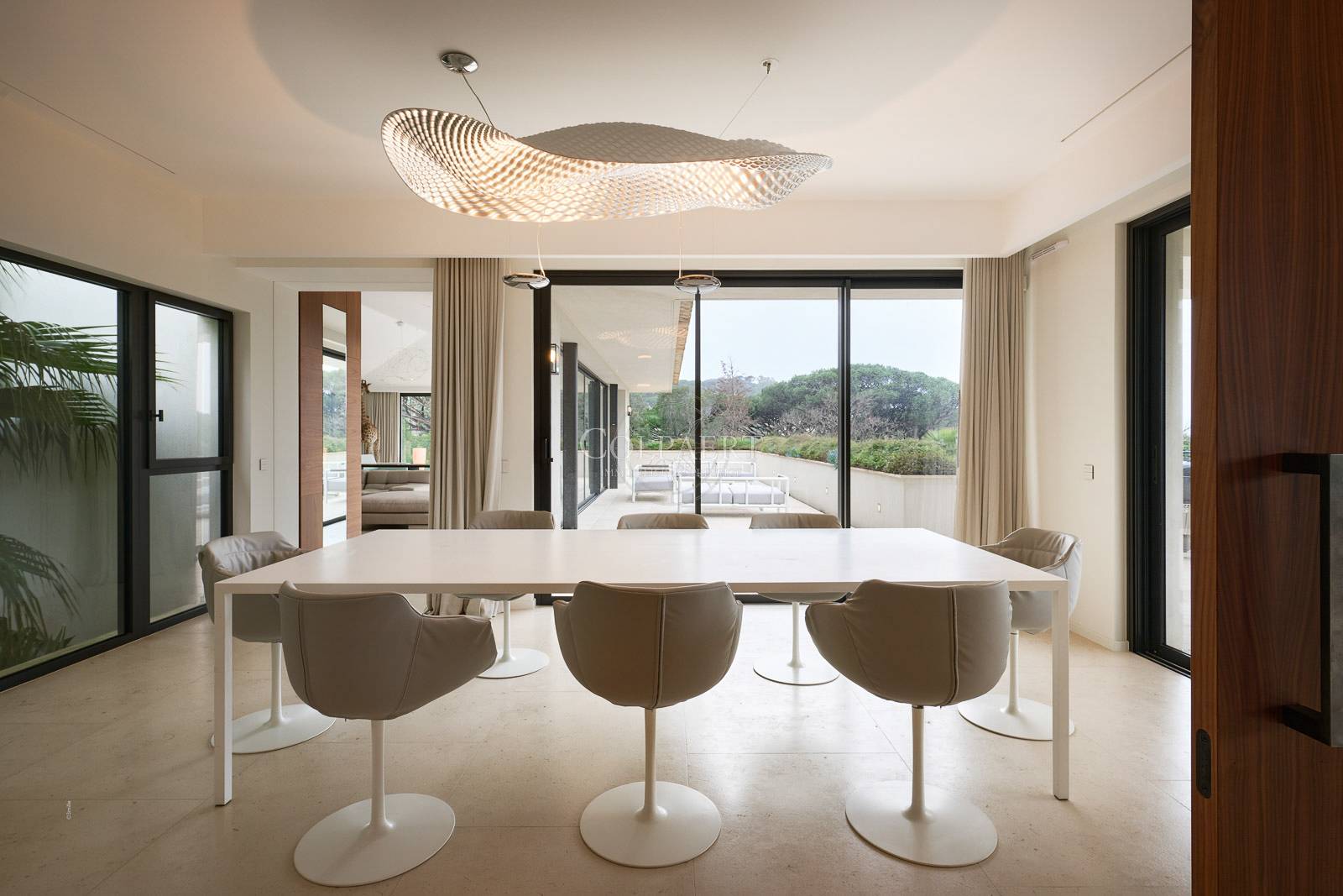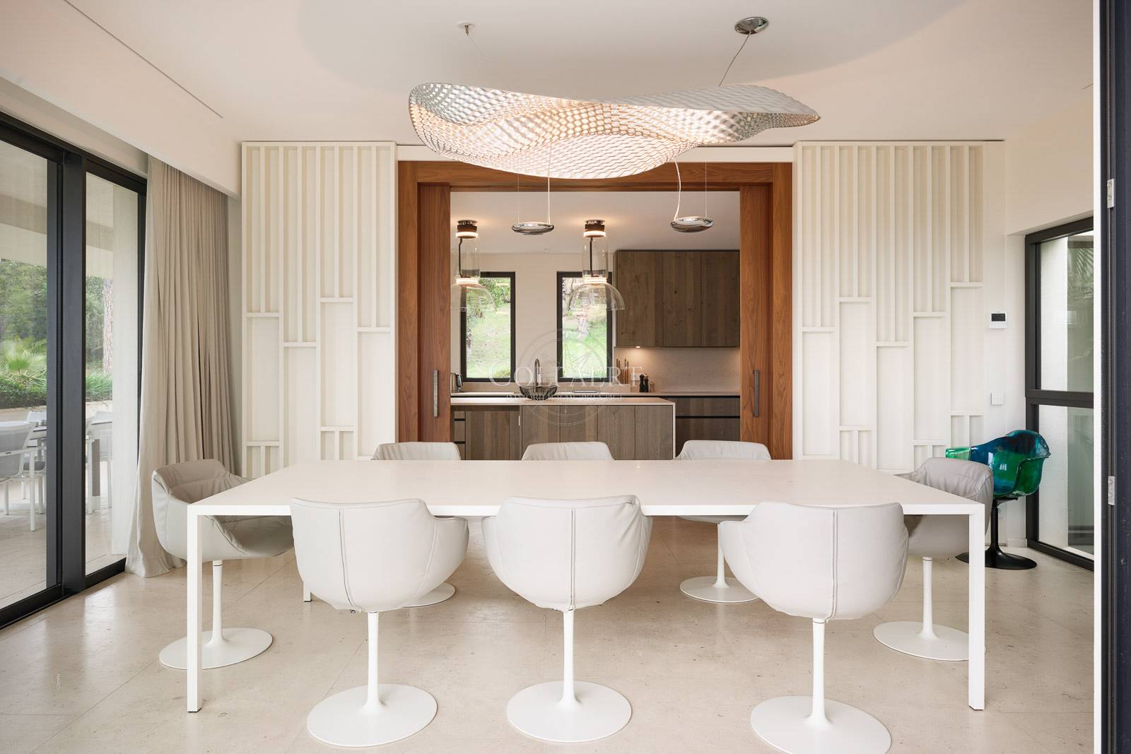 Het ontwerp van de villa legt de nadruk op transparantie en natuurlijke lichtinval, met grote raampartijen die de kamers overspoelen met daglicht en de hoogwaardige materialen en royale volumes benadrukken, typische kenmerken van een hoogwaardige realisatie.