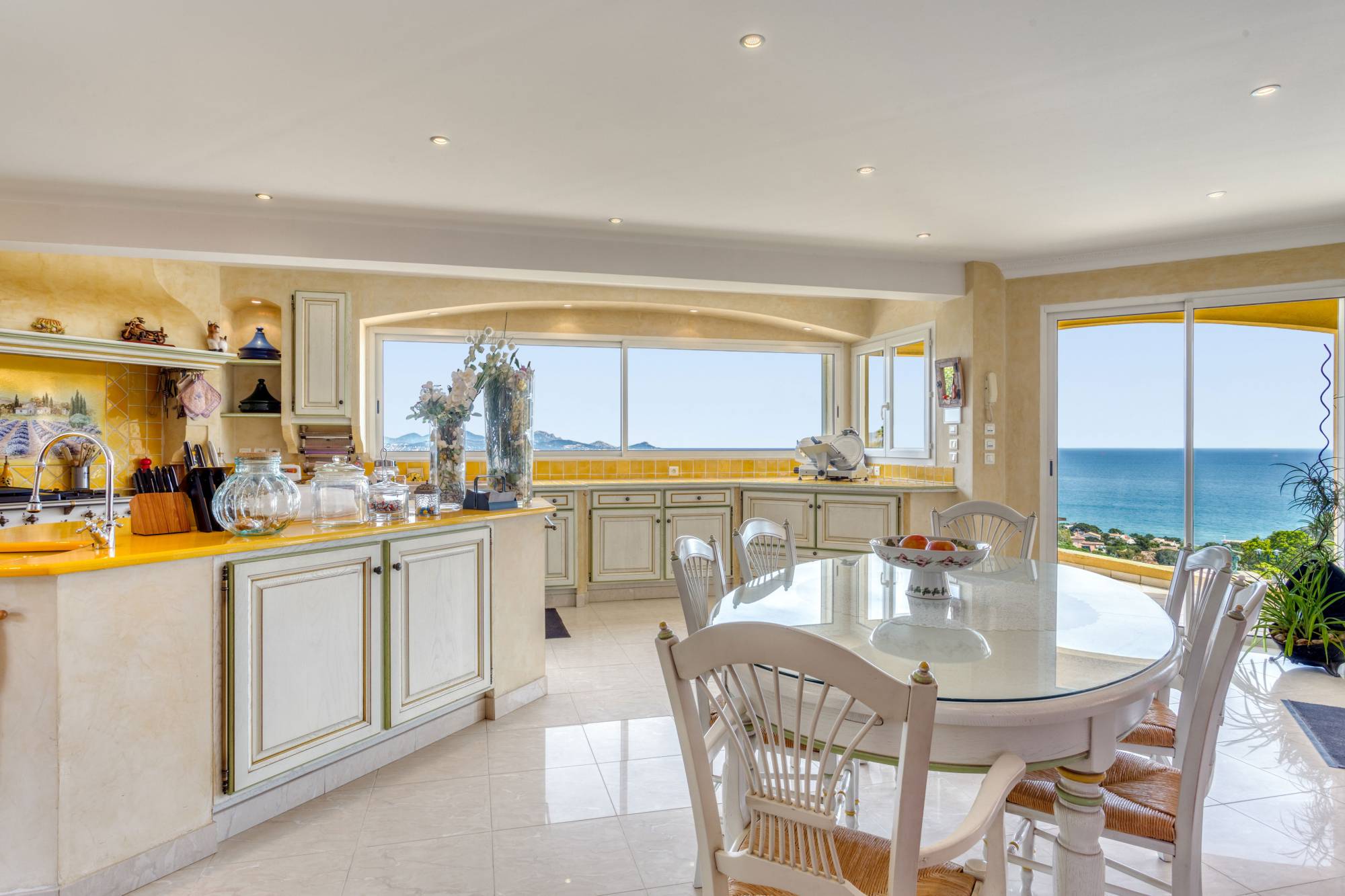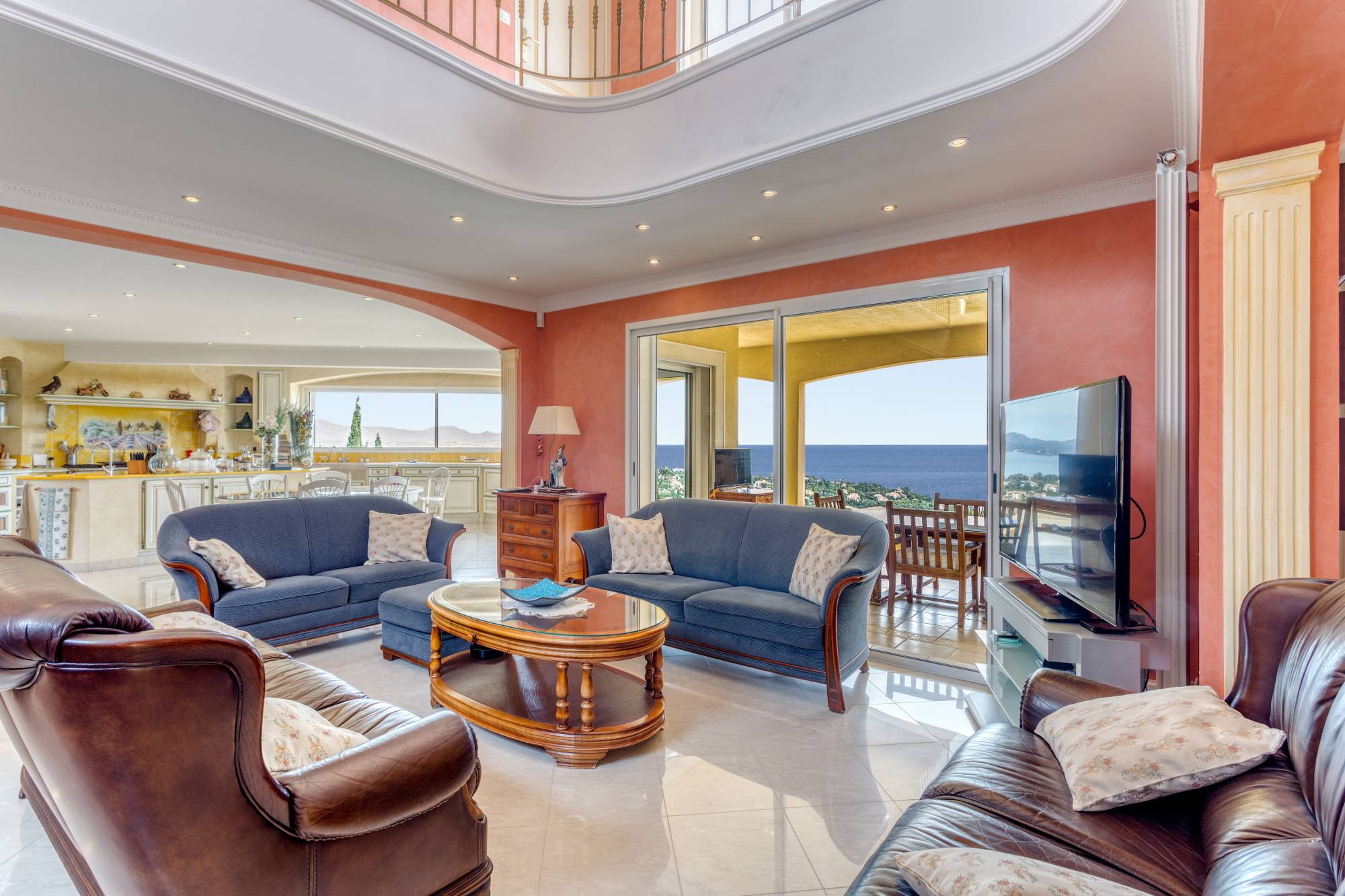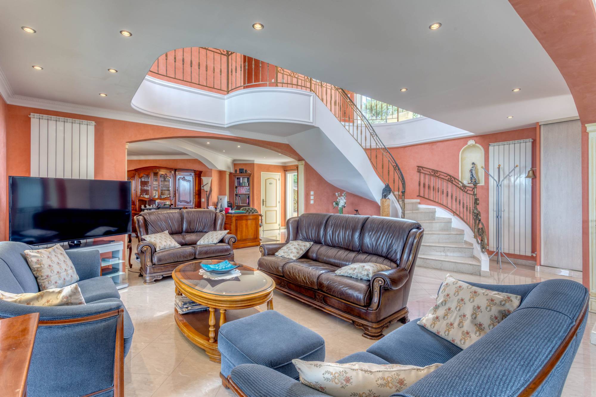 Deze villa, gebouwd op een perceel van 1.127 m2, bestaat uit een indrukwekkende inkomhal met mezzanine, een woon-eetkamer met een adembenemend uitzicht op zee, en een volledig uitgeruste open keuken.