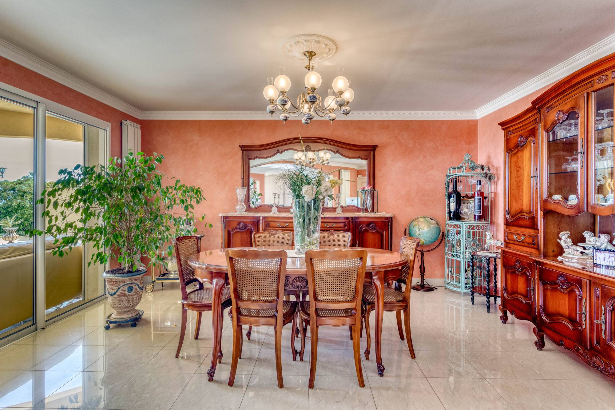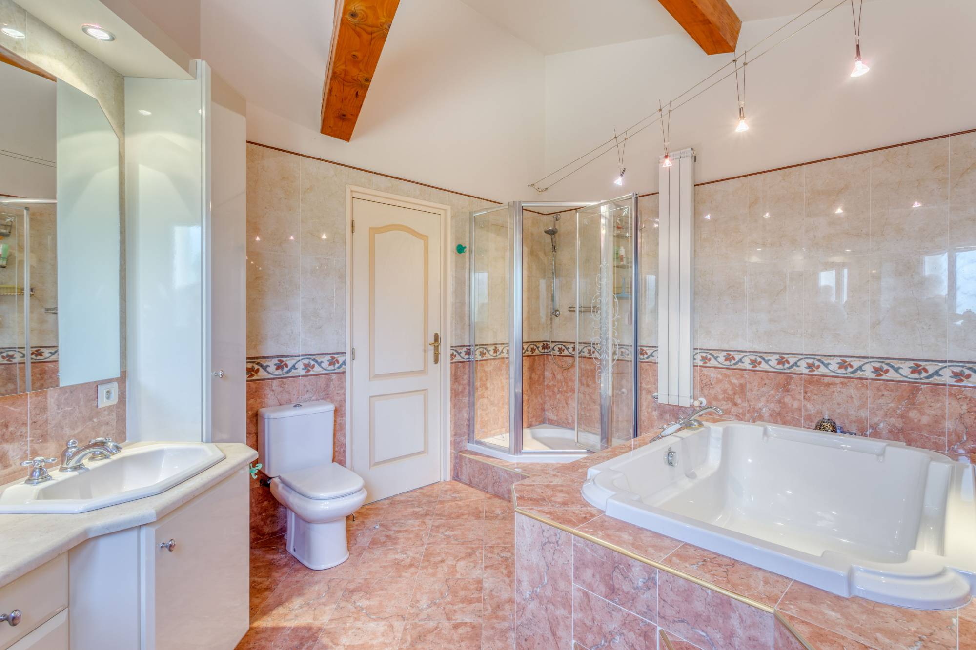 Op de bovenverdieping vindt u een hoofdslaapkamer met kleedruimte, badkamer en eigen terras, evenals vier andere slaapkamers, waarvan één met aangrenzende badkamer. Een extra badkamer completeert de bovenverdieping.