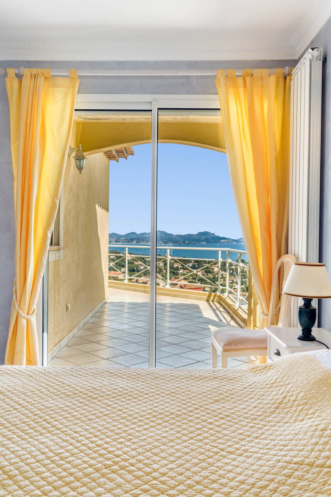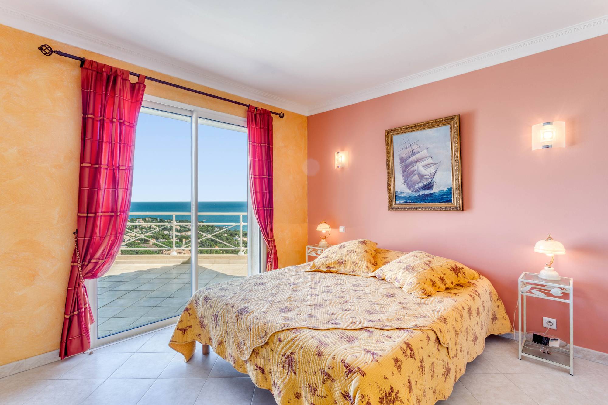 Een T2 met zeezicht, slaapkamer en doucheruimte opent naar het overdekt buitenterras.
