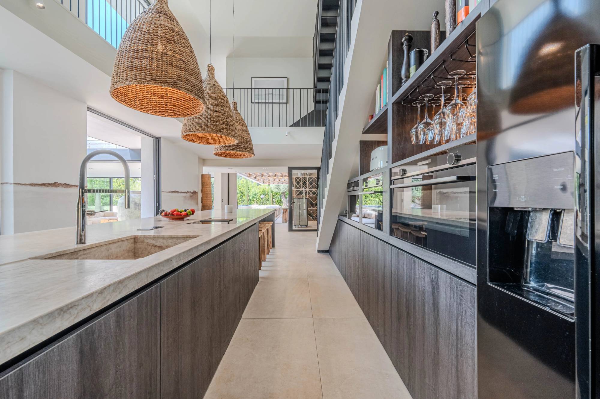 - Keuken van 80 m² met centraal eiland van "Perla Venata", uitgerust met 90 cm oven, magnetron, ingebouwde koffiezetter, Amerikaanse koelkast, inductiekookplaat met afzuiging, en wijnkoeler voor 500 flessen.