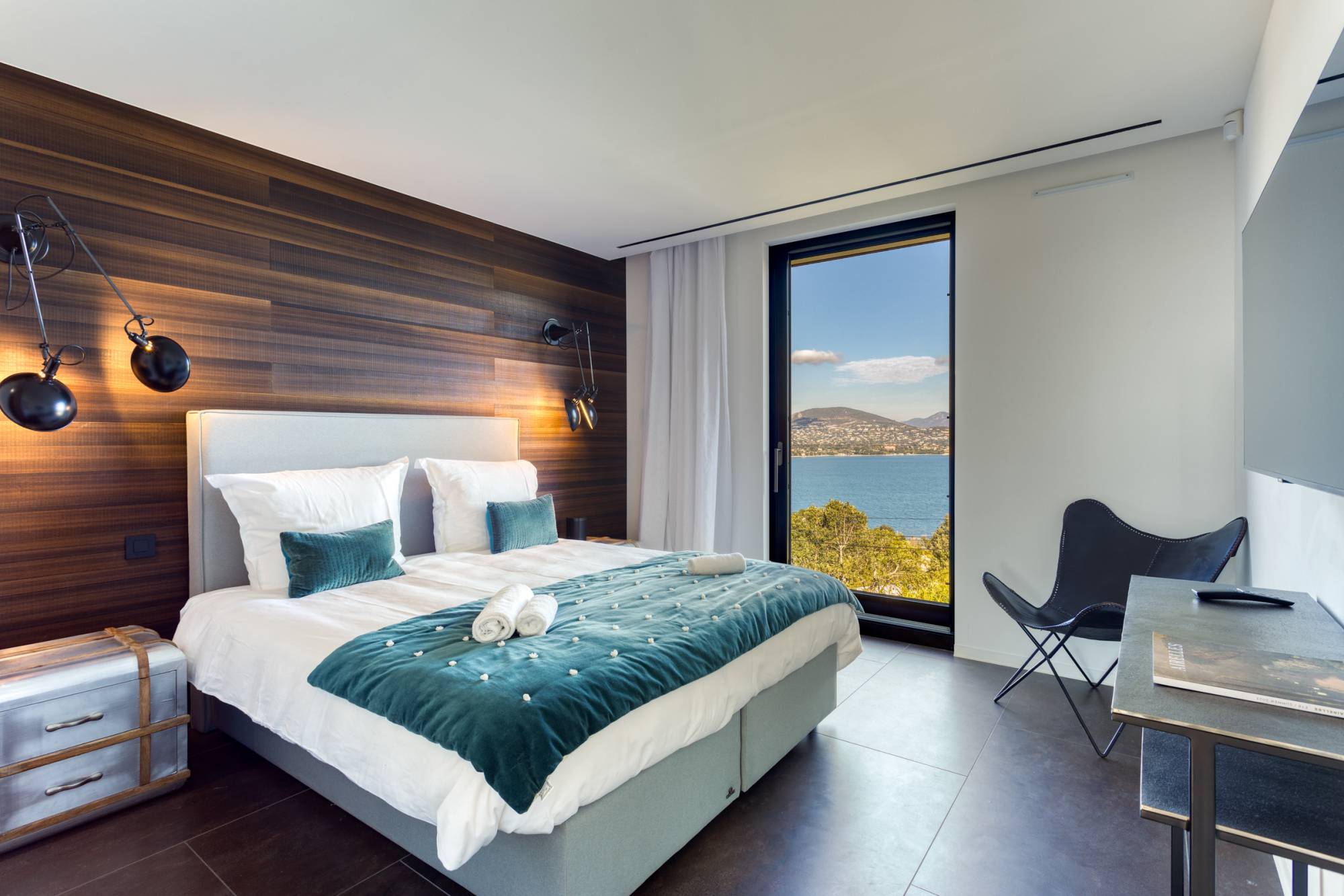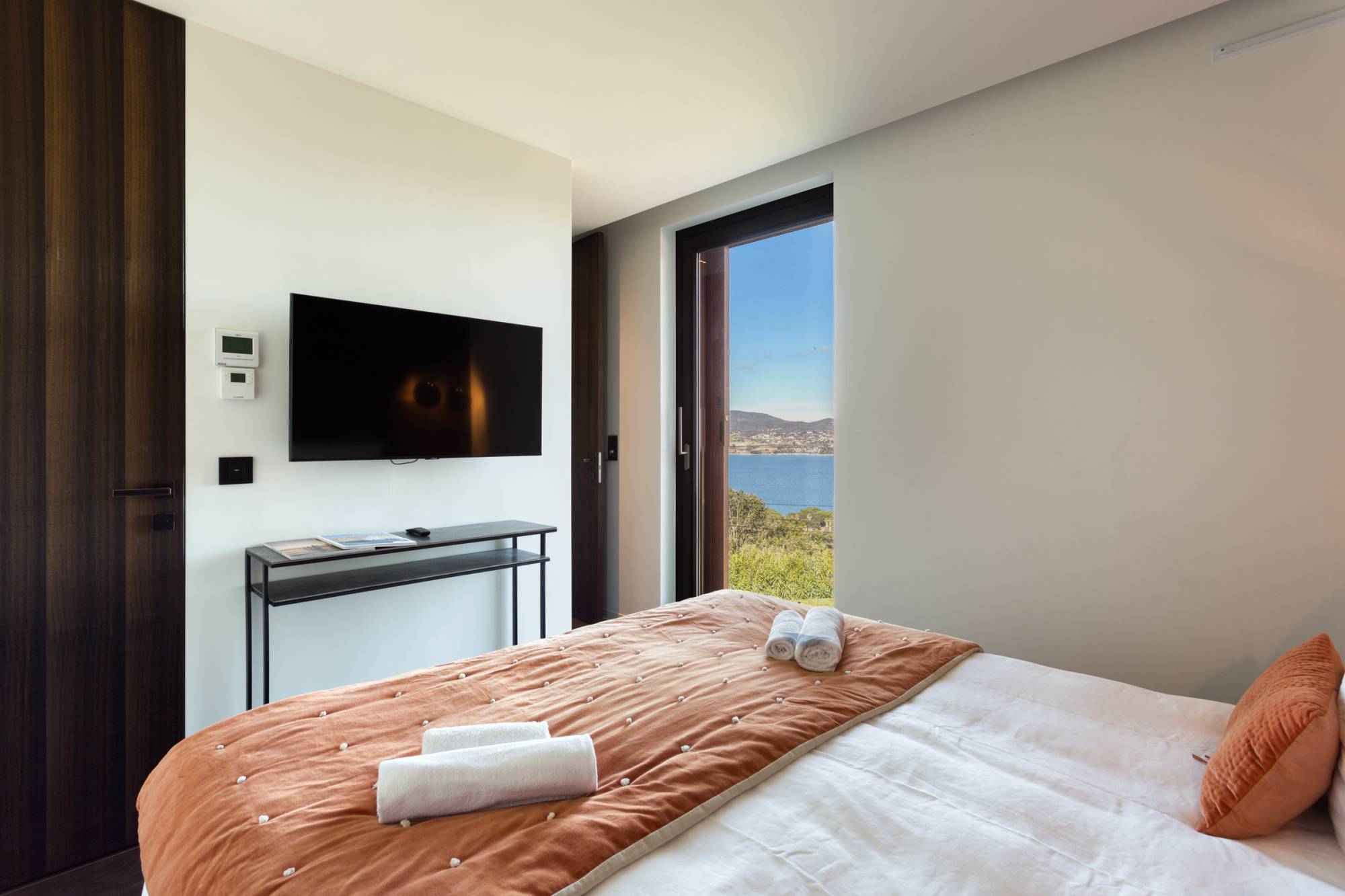 Op twee niveaus omvat de villa op de begane grond een zonnige woonkamer, eetkamer, open keuken, en twee slaapkamers, elk met een eigen dressing en en-suite badkamer. Op de bovenverdieping zijn er nog vier extra slaapkamers met drie badkamers.