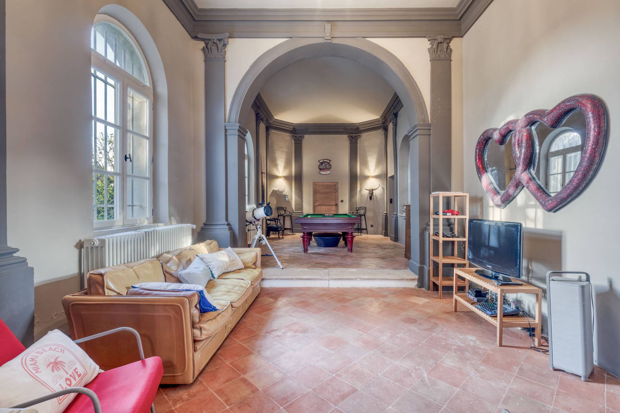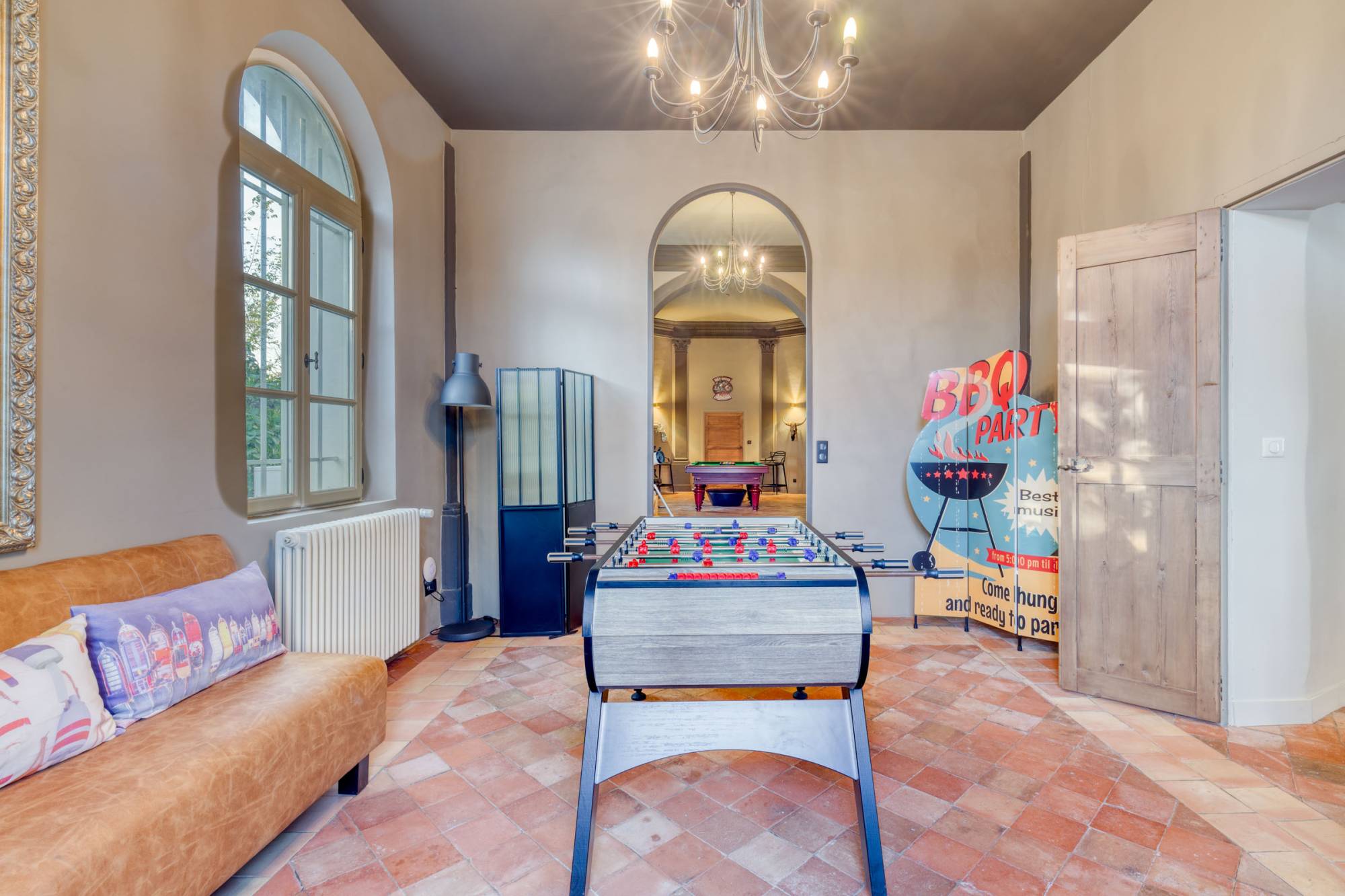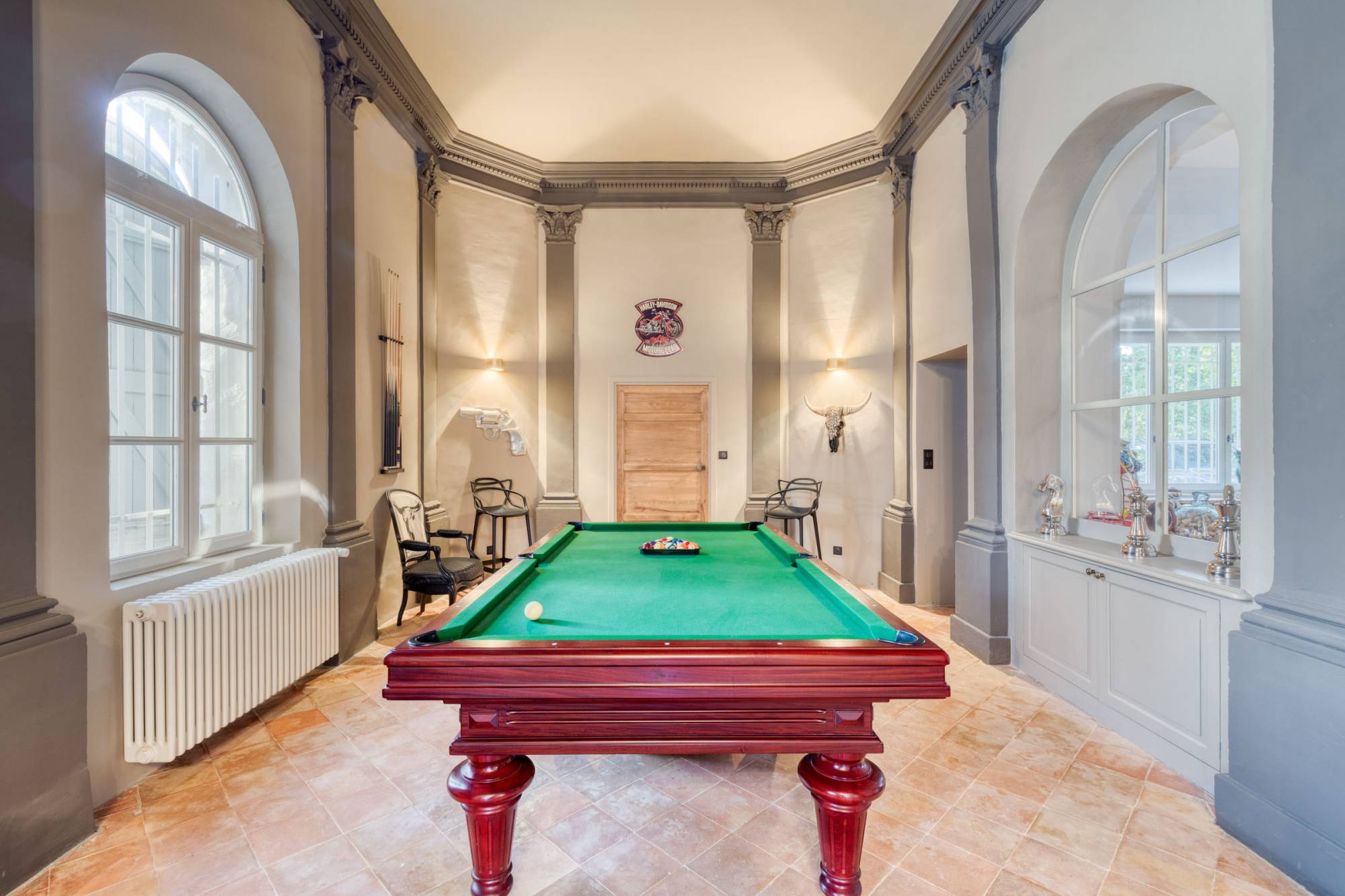 Het hoofdgebouw heeft zeven ruime slaapkamers en een bijgebouw. Daarnaast zijn er een royale dubbele ontvangstruimte, een elegante eetkamer en een open keuken die uitkomt op een groot terras. Praktische ruimtes zoals een wasruimte en een voorraadkamer zijn ook aanwezig. Bovendien biedt een professionele thuisbioscoop een extra vleugje luxe aan deze uitzonderlijke woning.