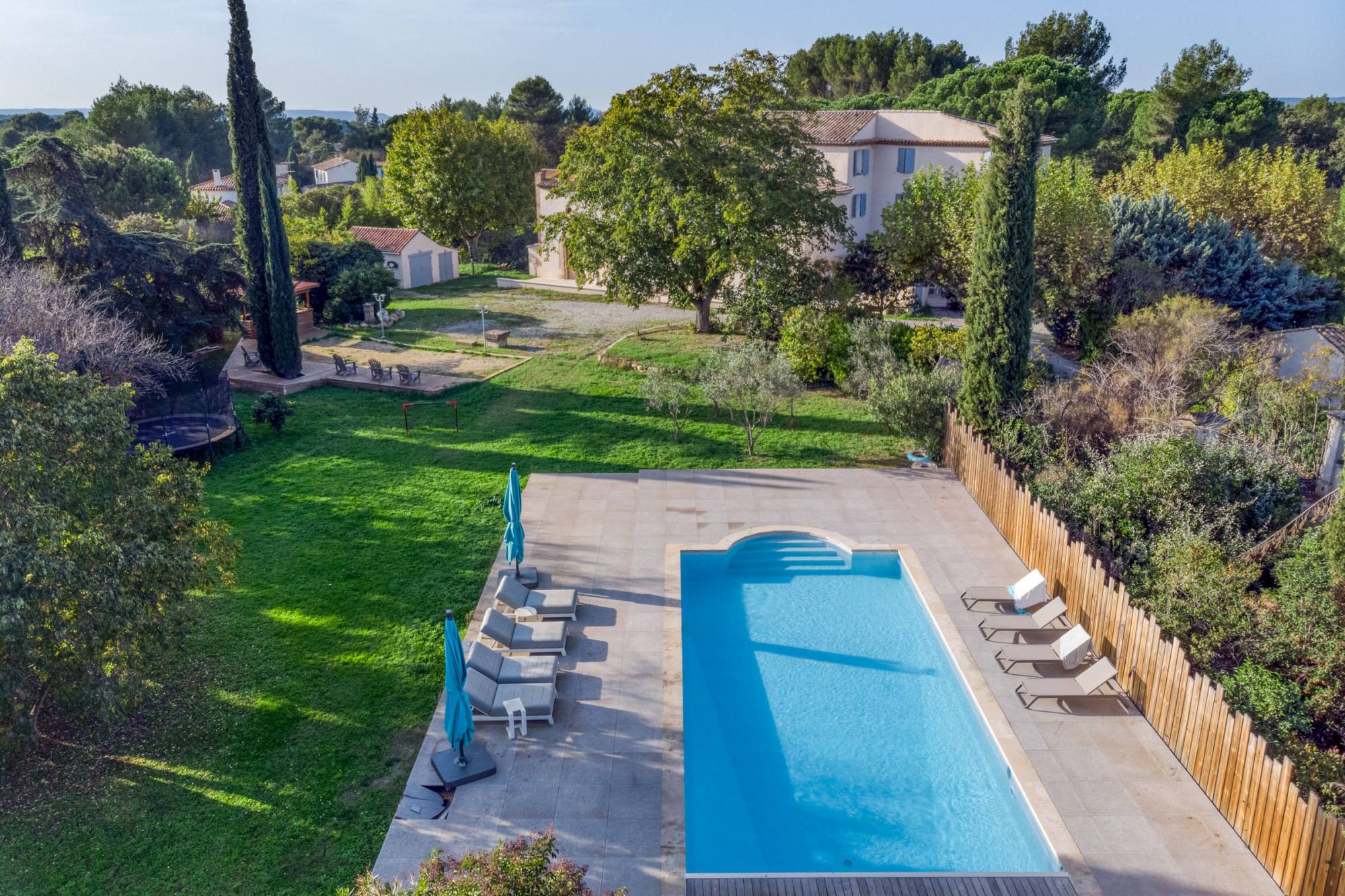 Gelegen op een aangelegd en omheind perceel van 8.000 m², beschikt de woning over een groot zwembad, een jeu-de-boulesbaan en een waterput, ideaal voor ontspannende momenten in de buitenlucht.
