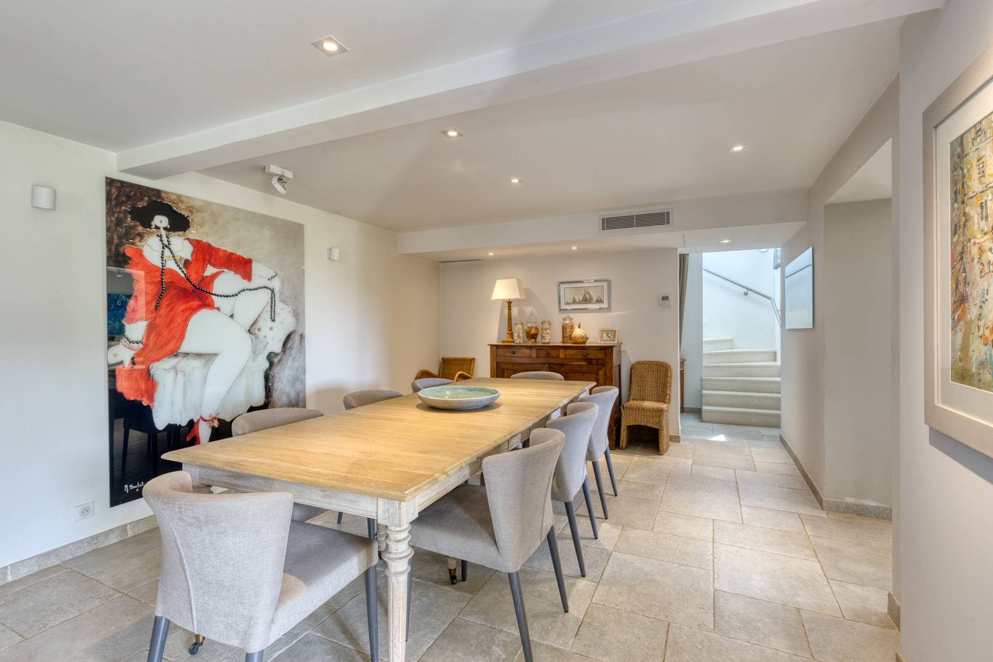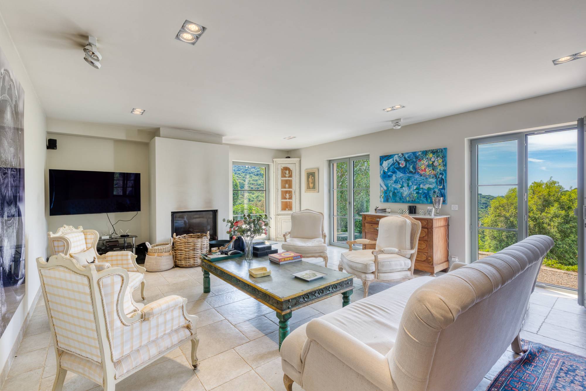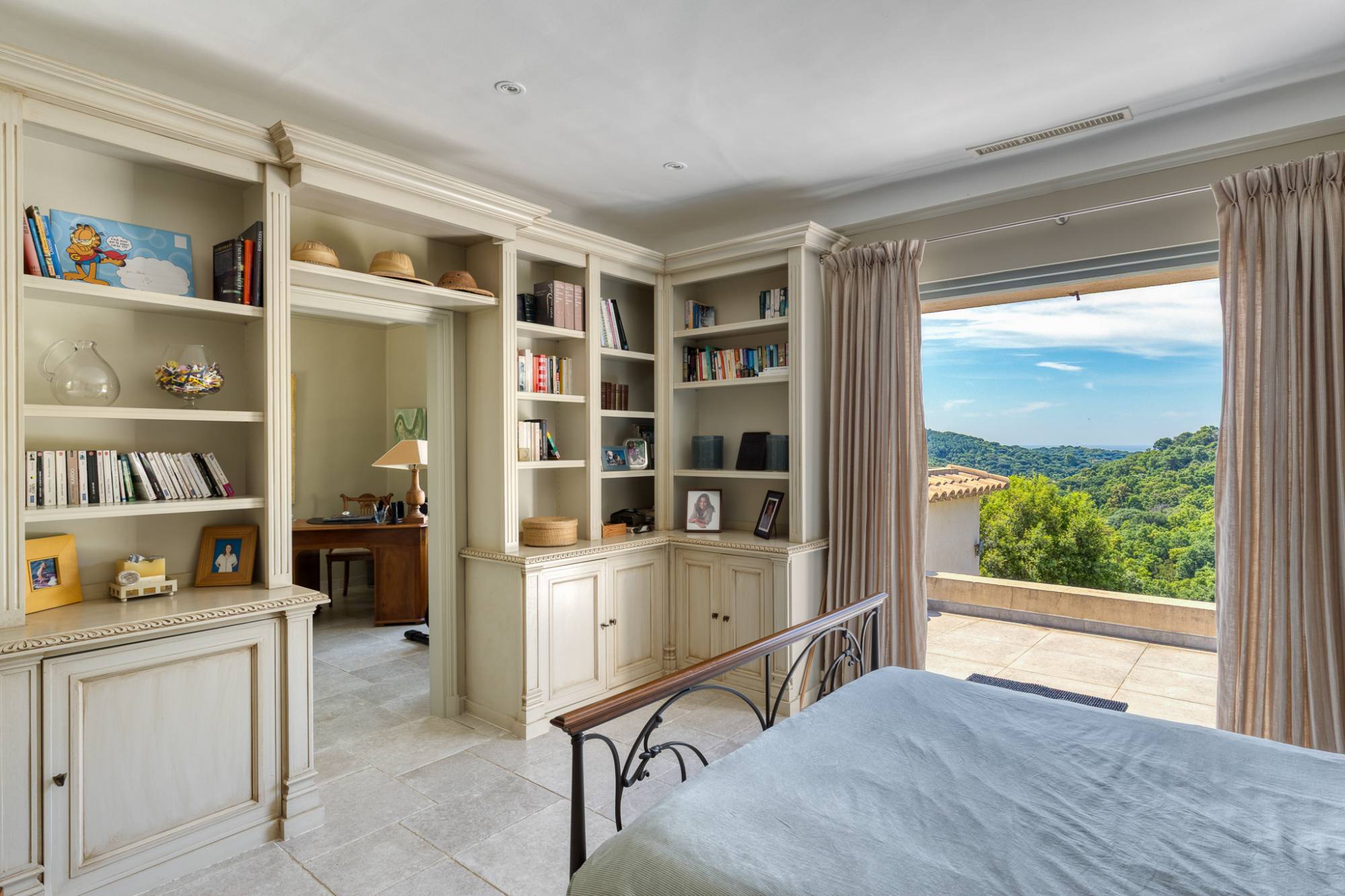 De hoofdvilla beschikt over een ruime woonkamer met open haard, die uitkomt op een eetruimte en een volledig uitgeruste keuken van topkwaliteit. Een uitzonderlijke master suite van 60 m² omvat twee bureaus, een dressing, een badkamer en een slaapkamer met toegang tot een groot zuidgericht terras met vrij uitzicht en een glimp van de zee. Een tweede vleugel biedt vier slaapkamers met eigen badkamer, elk met een individuele ingang.